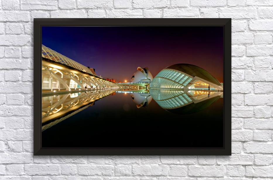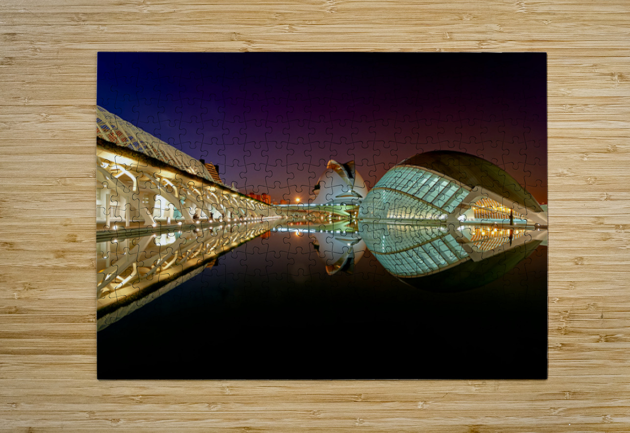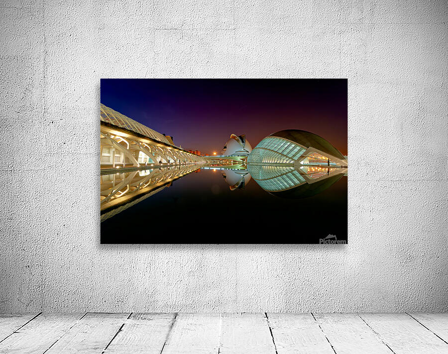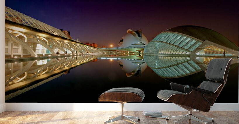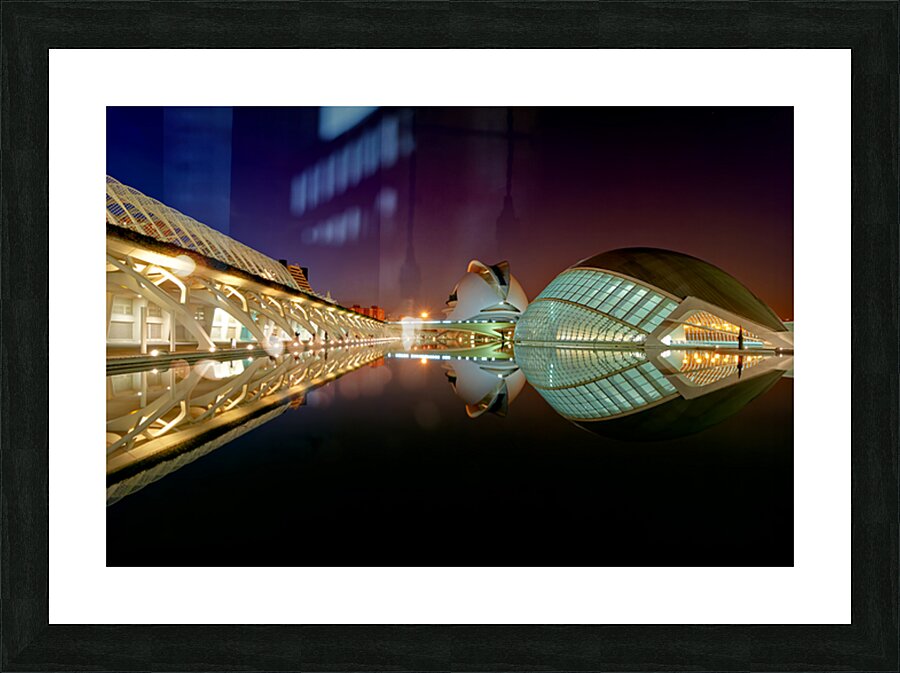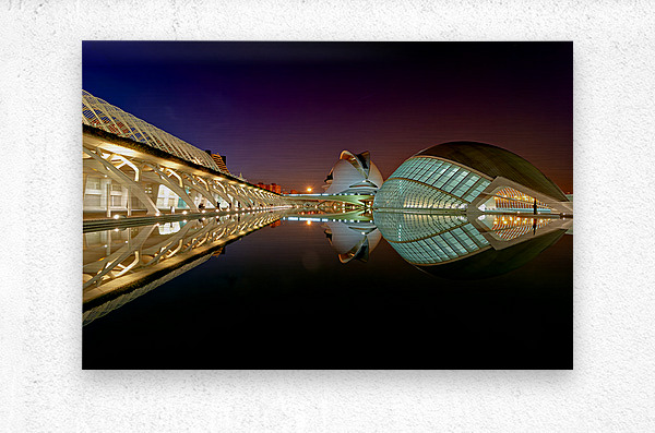 Hemisferic stands tall at the City of Arts and Sciences in Valencia during the night. Reflections shimmer on the water.