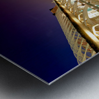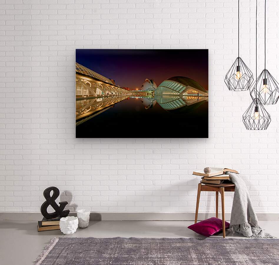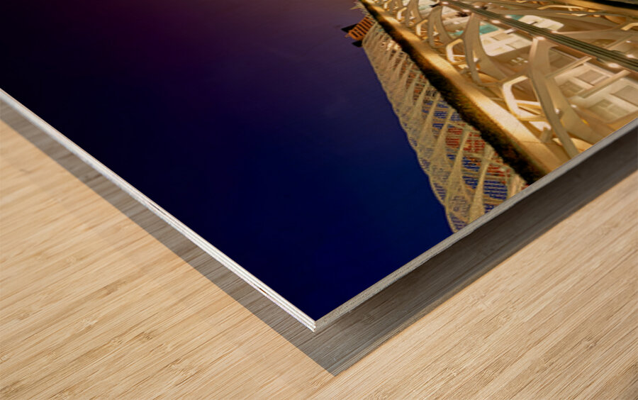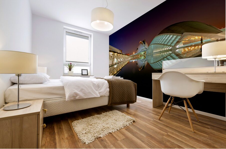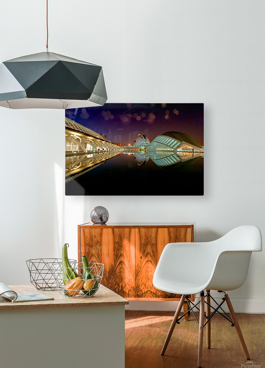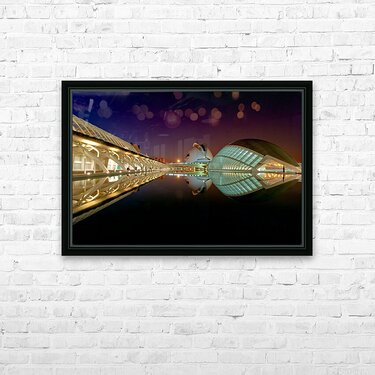 Hemisferic stands tall at the City of Arts and Sciences in Valencia during the night. Reflections shimmer on the water.