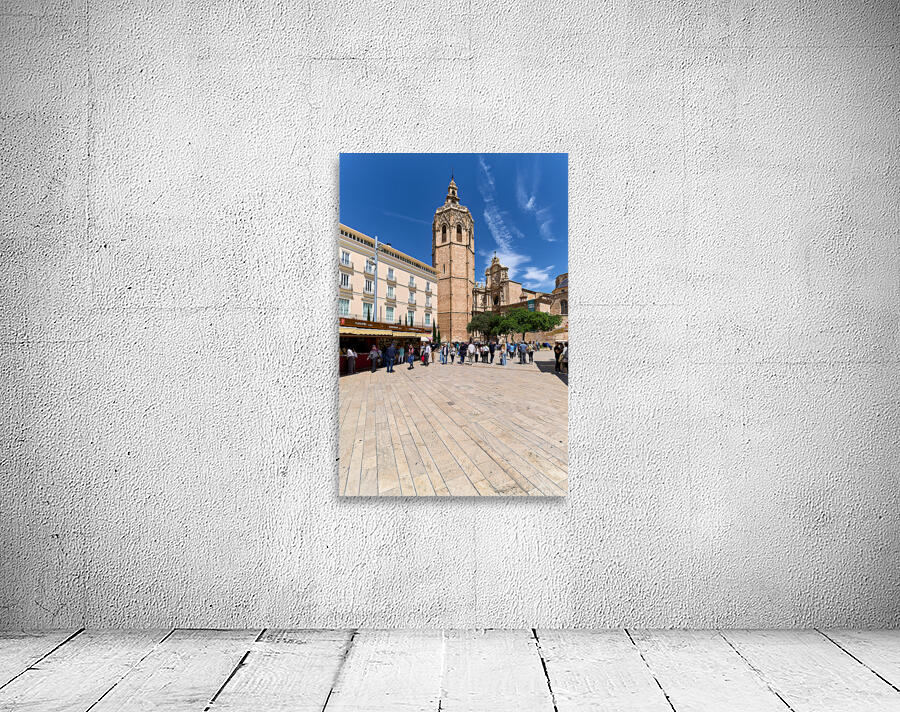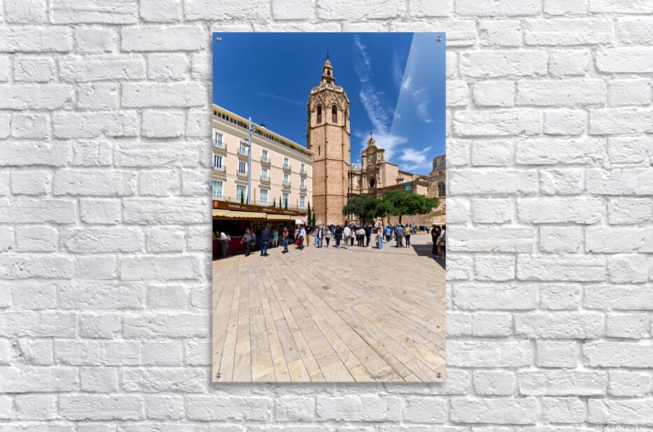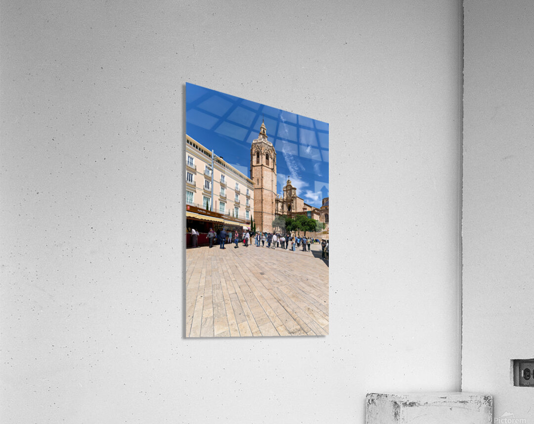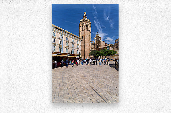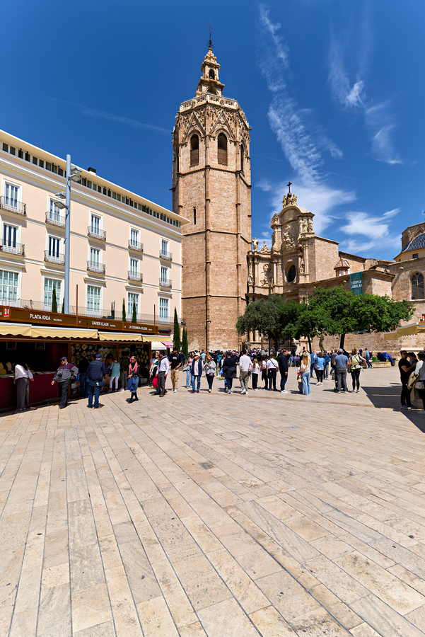 Visitors gather in front of Valencia Cathedral in the plaza under a clear sky. People walk and admire the architecture.