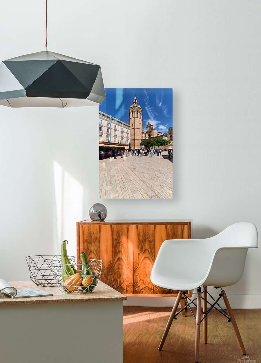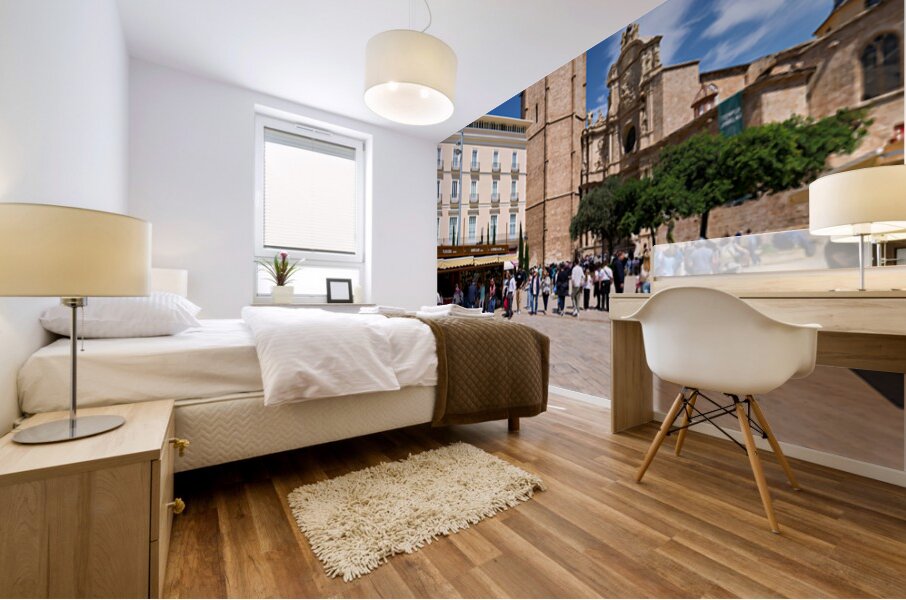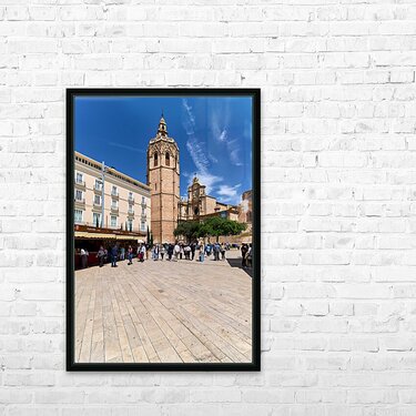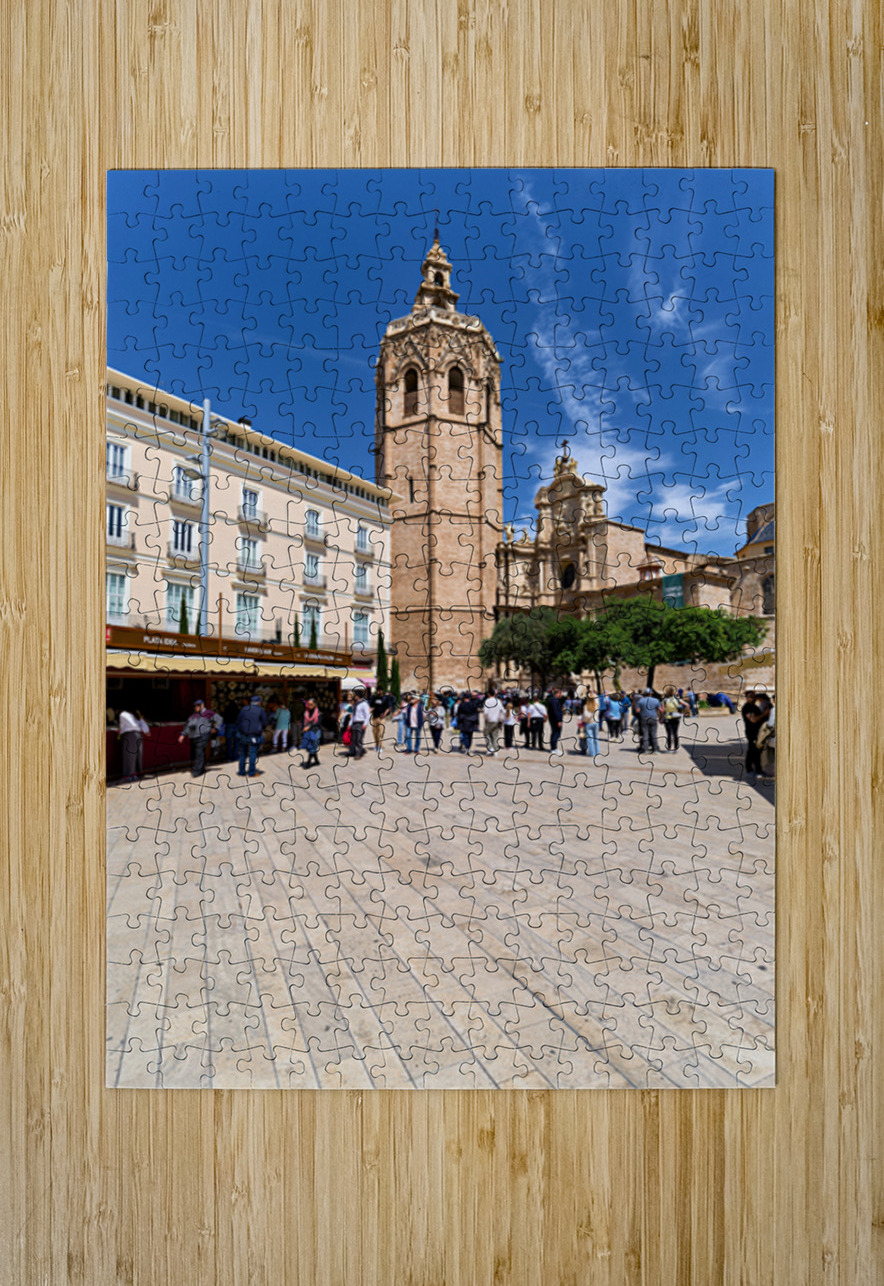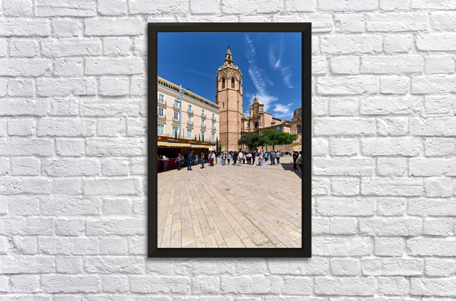 Visitors gather in front of Valencia Cathedral in the plaza under a clear sky. People walk and admire the architecture.