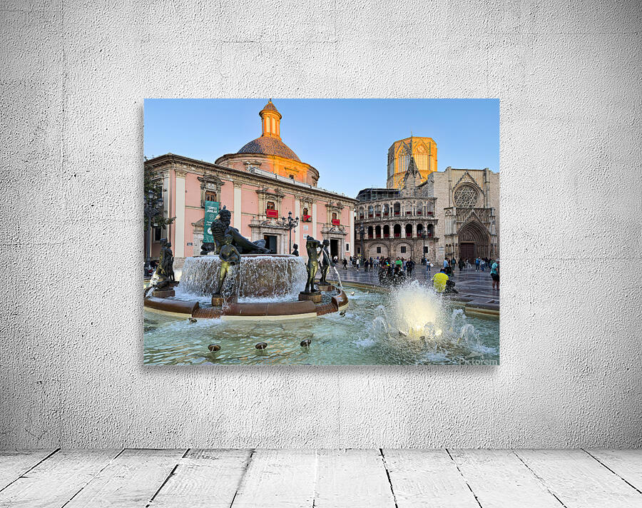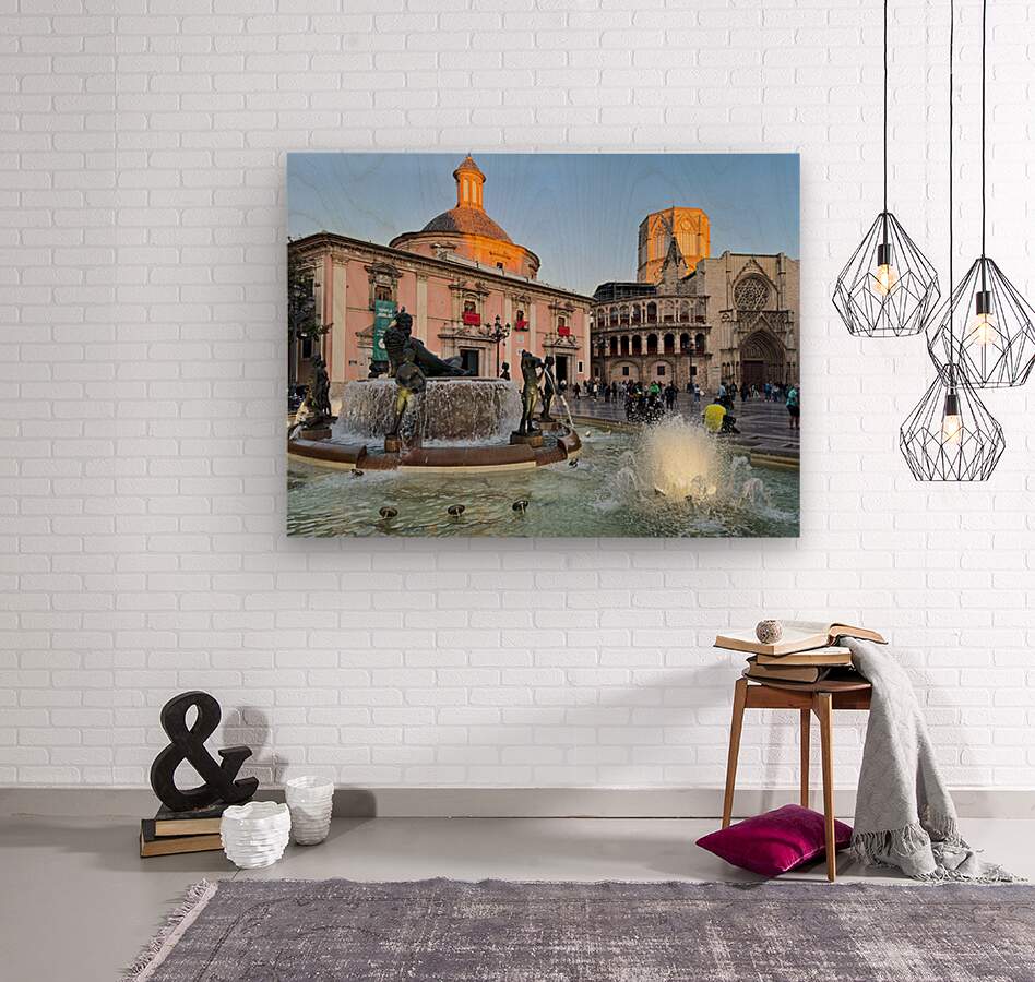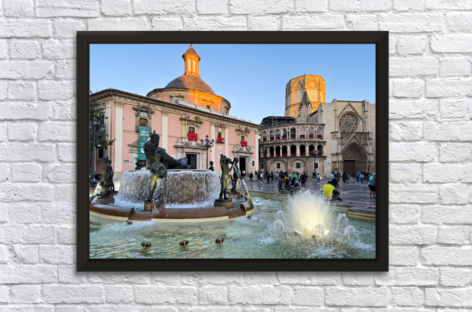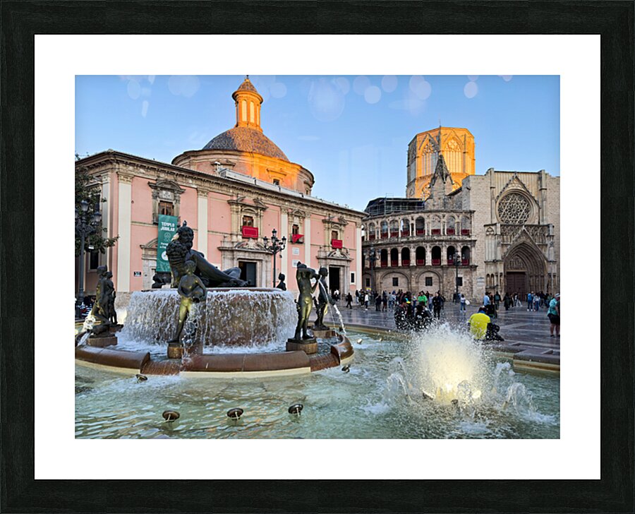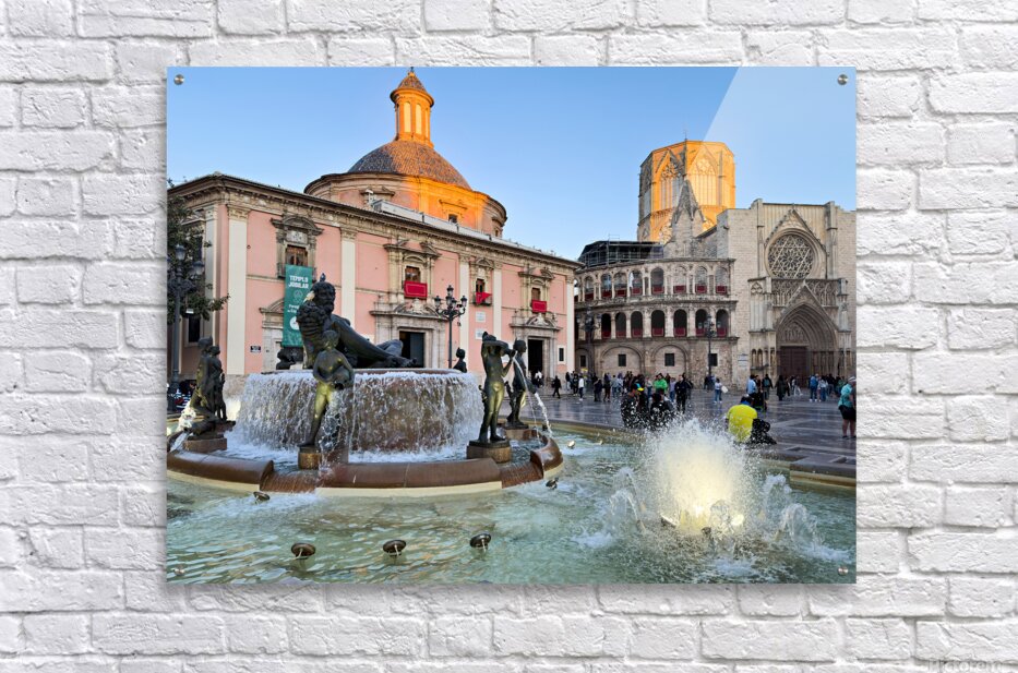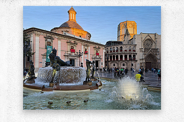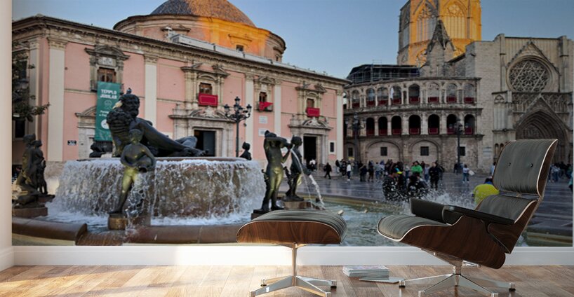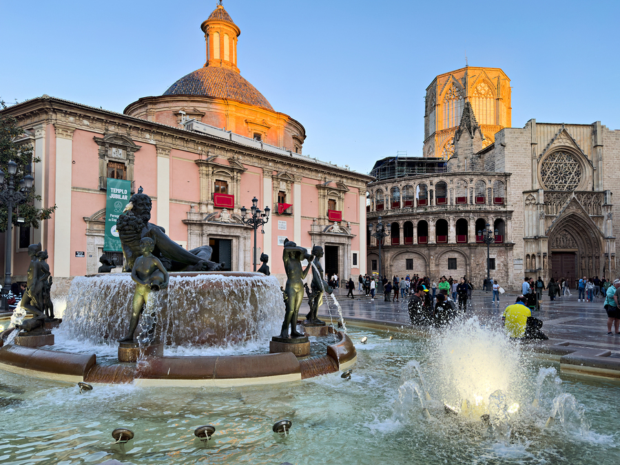 People walk in Plaza de la Virgen near the fountain and Real Basilica de Nuestra Senora de los Desamparados during sunset in Valencia Spain.