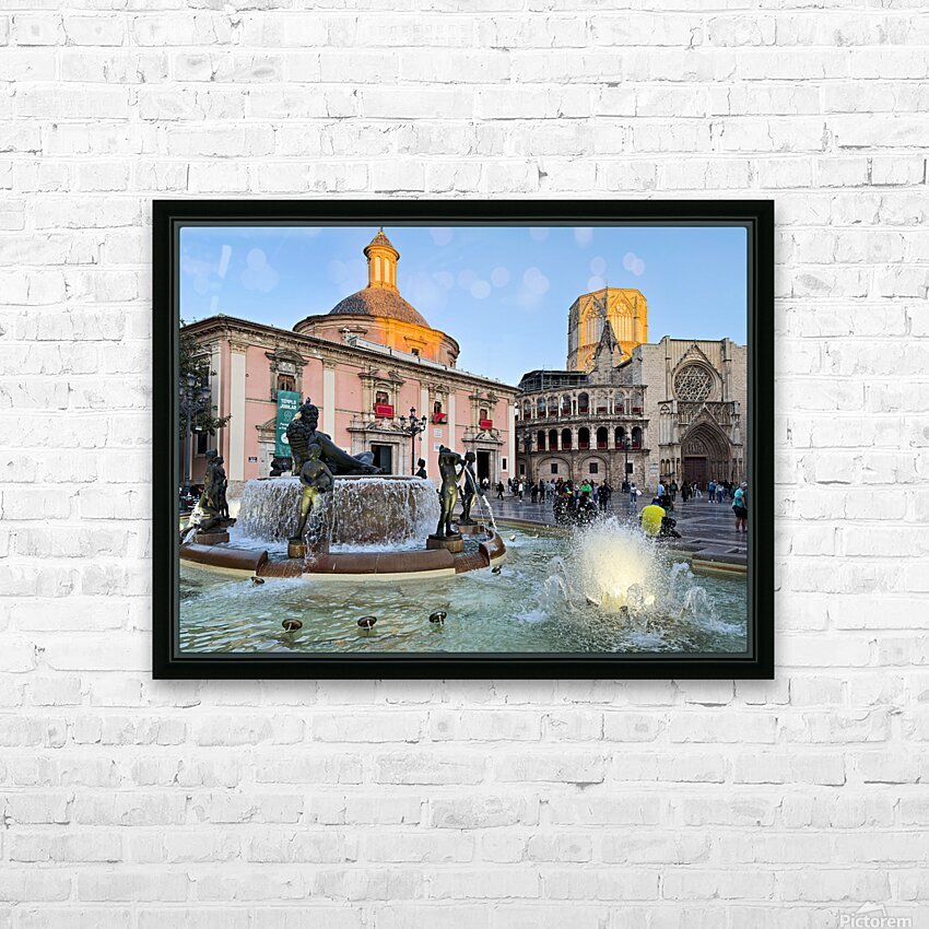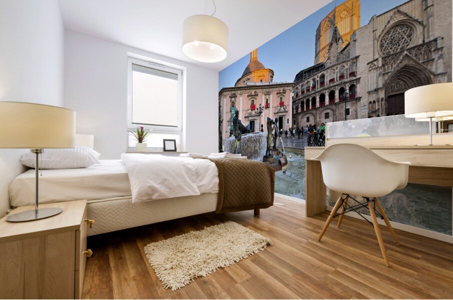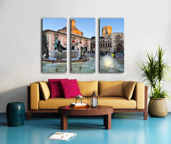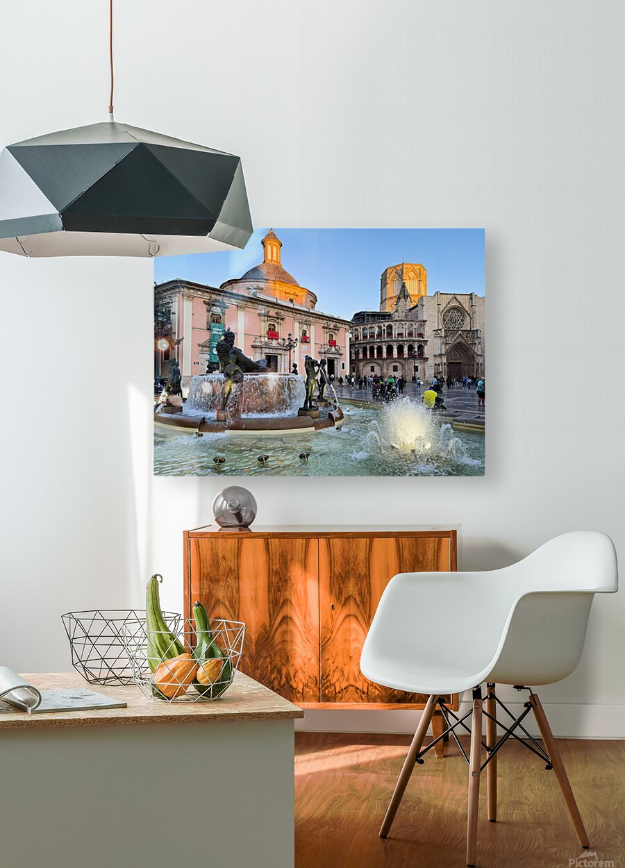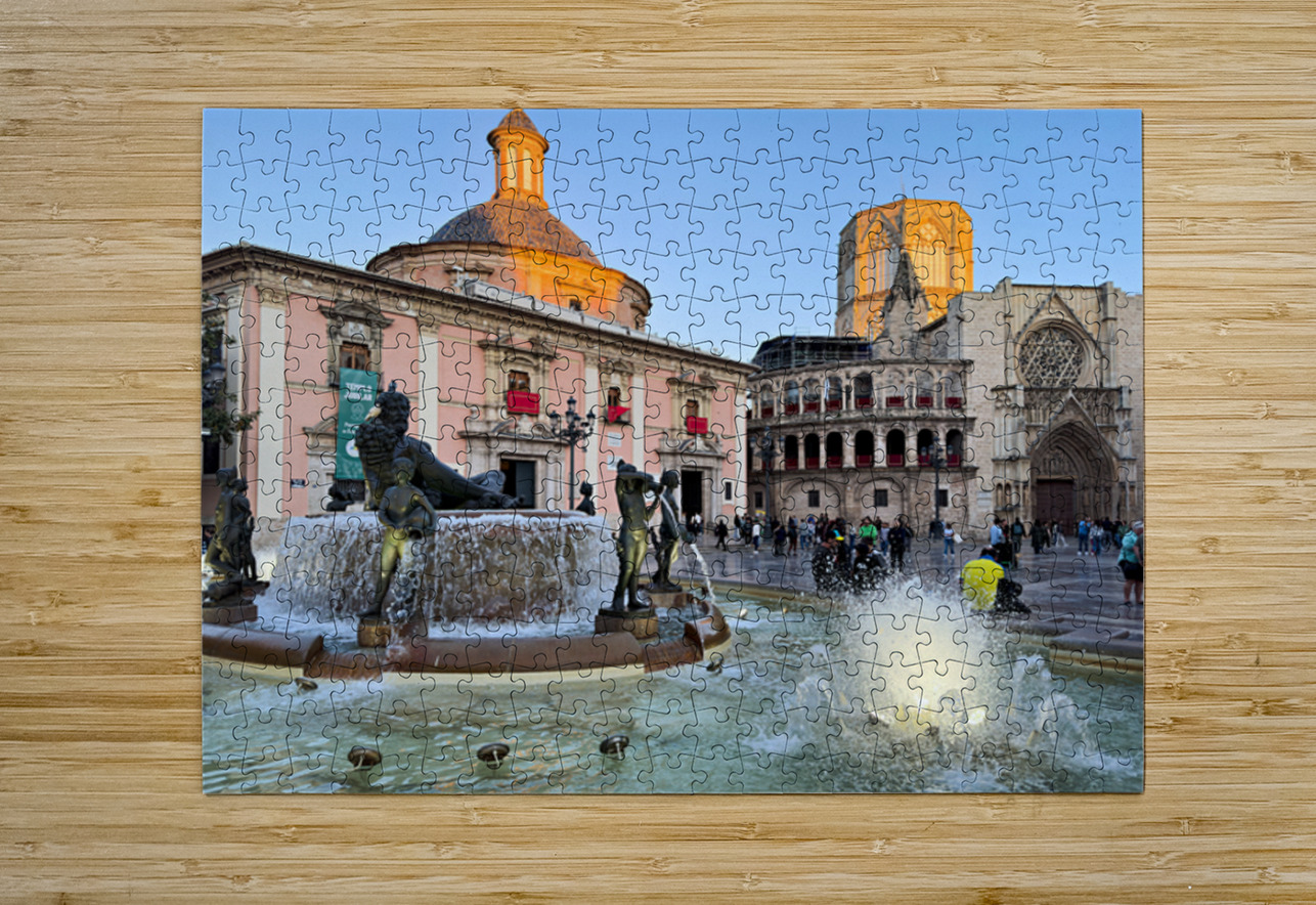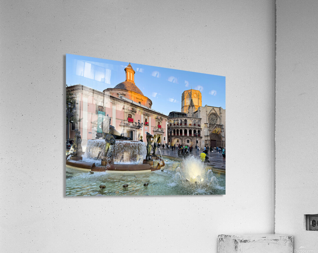 People walk in Plaza de la Virgen near the fountain and Real Basilica de Nuestra Senora de los Desamparados during sunset in Valencia Spain.
