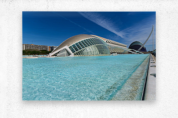Visitors explore the City of Arts and Sciences in Valencia near the Hemisferic. Clear waters reflect modern architecture under blue skies.