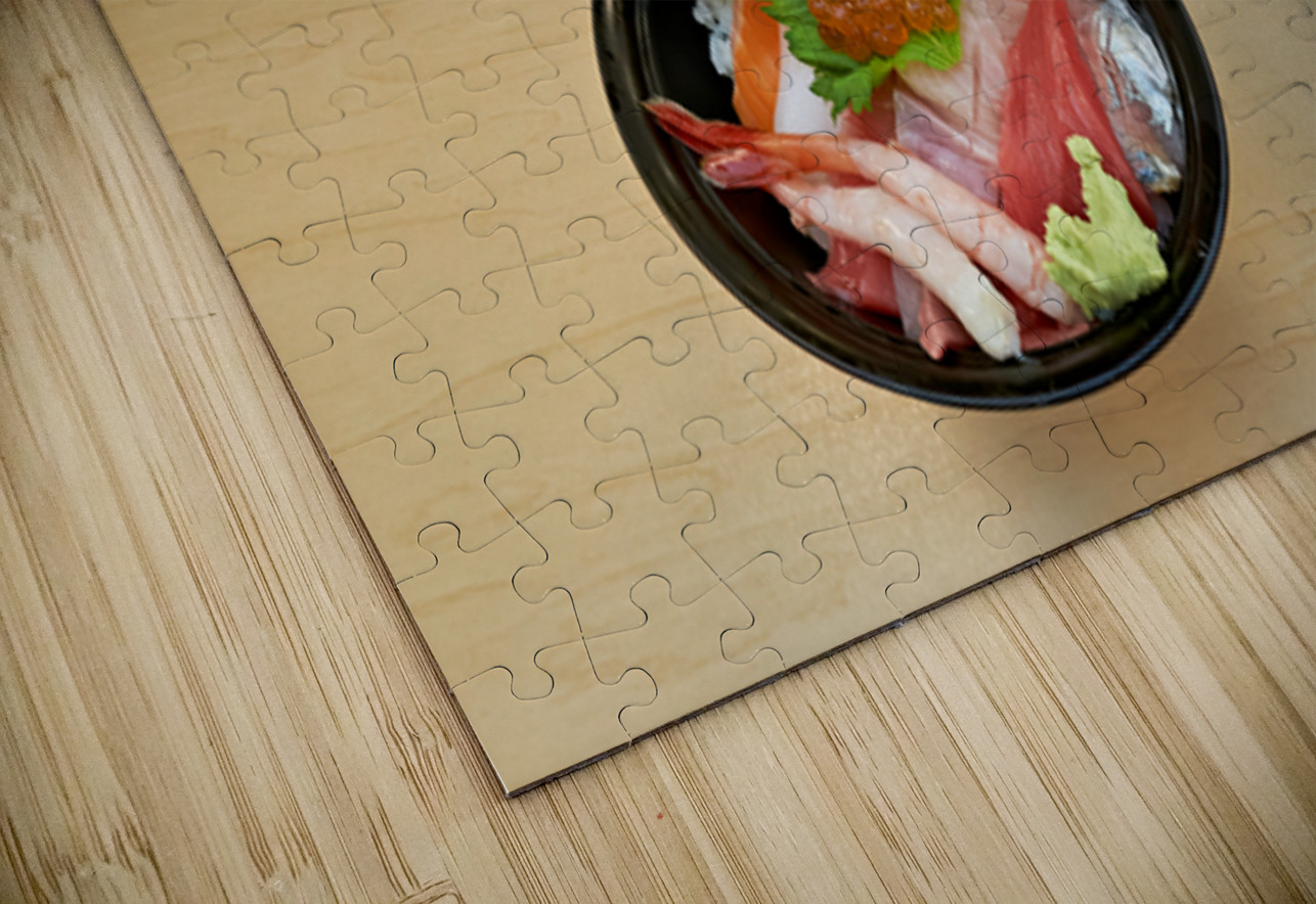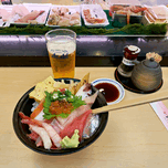 A bowl of sashimi sits on a table at a sushi bar in Shibuya Tokyo. Behind it various sushi options are displayed.