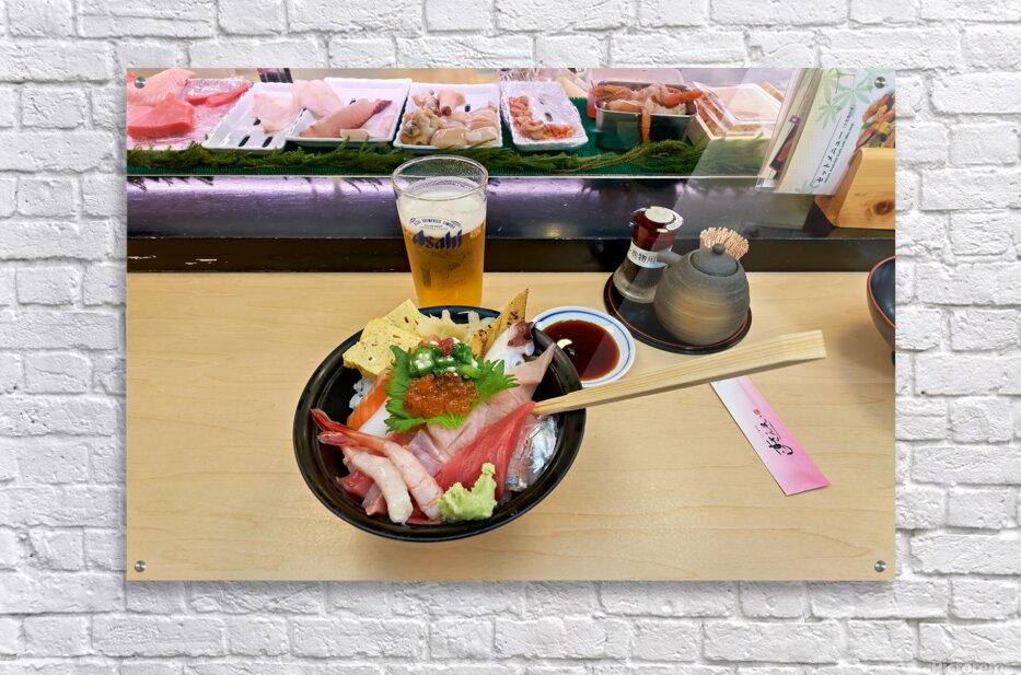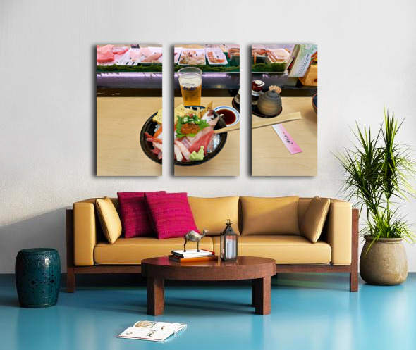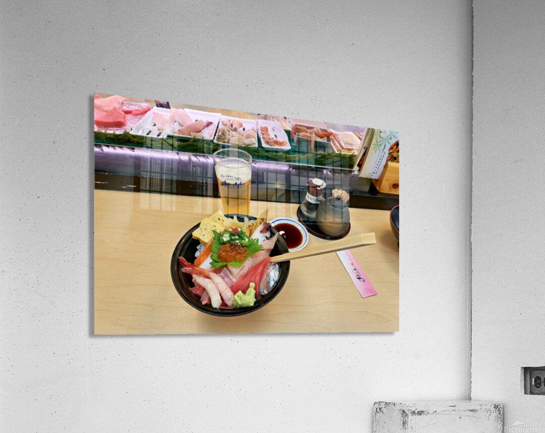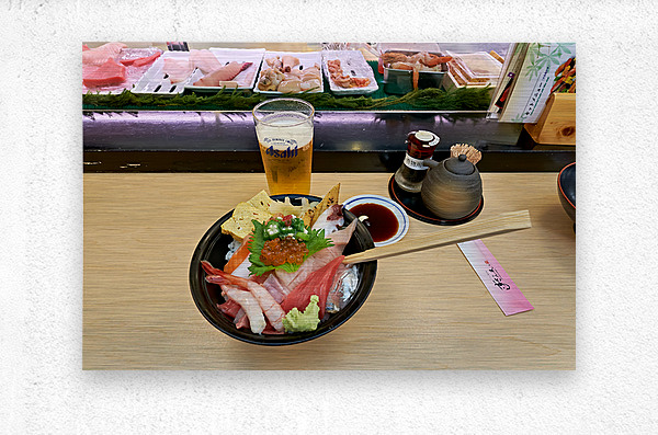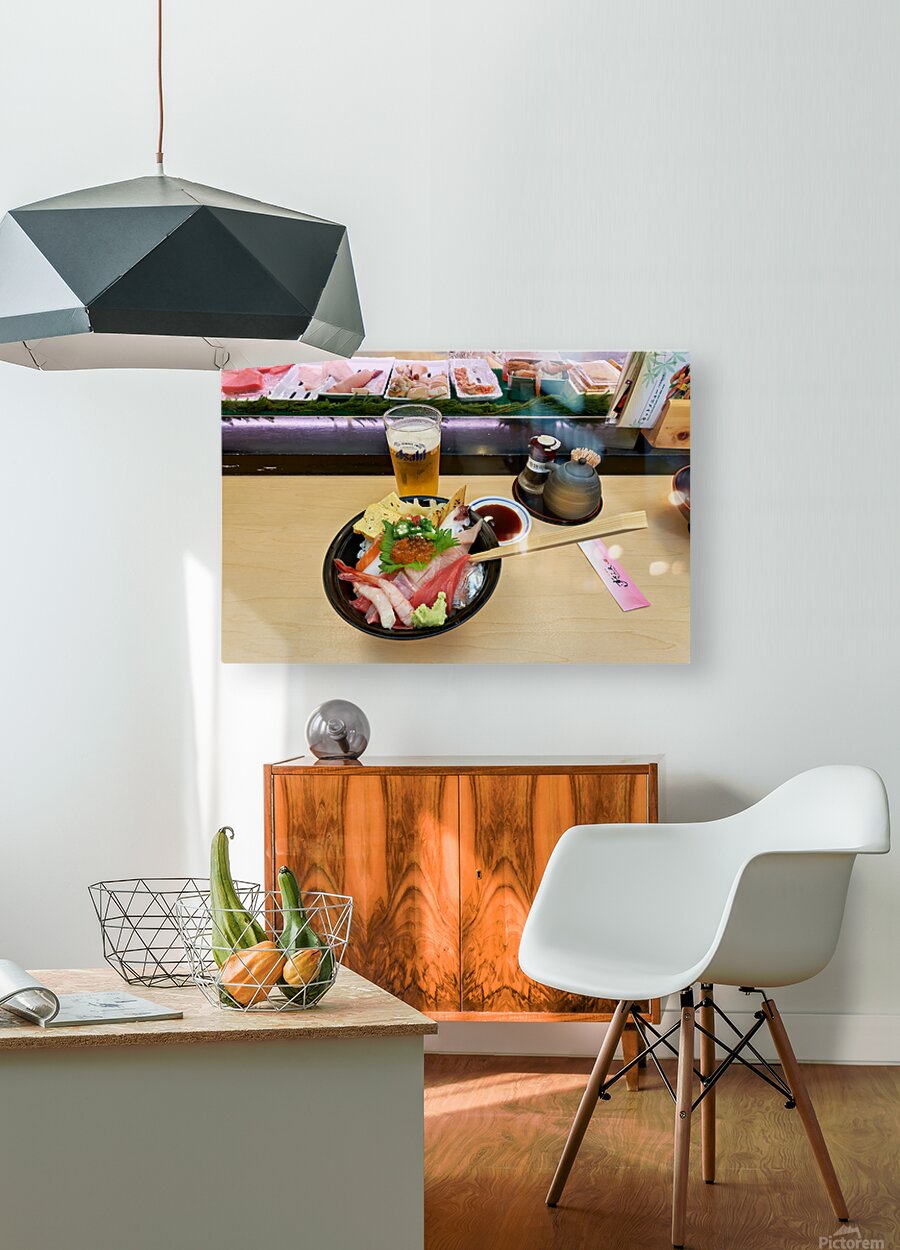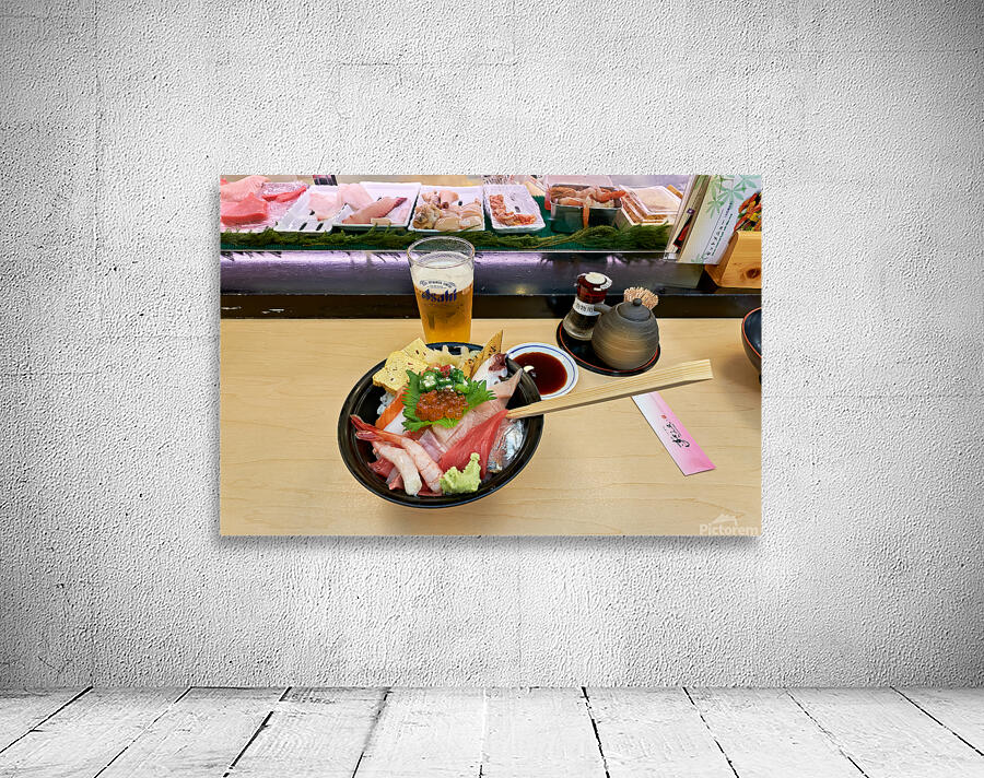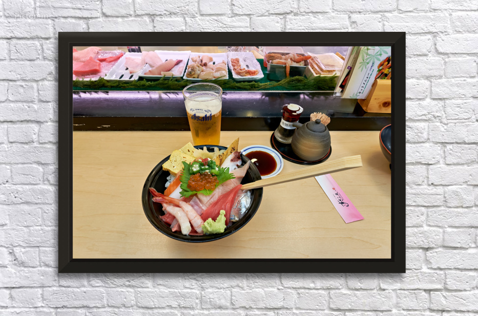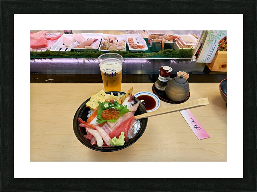 "Sushi bar with fresh sashimi and beer in Shibuya Tokyo" in a framed print.