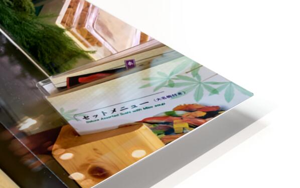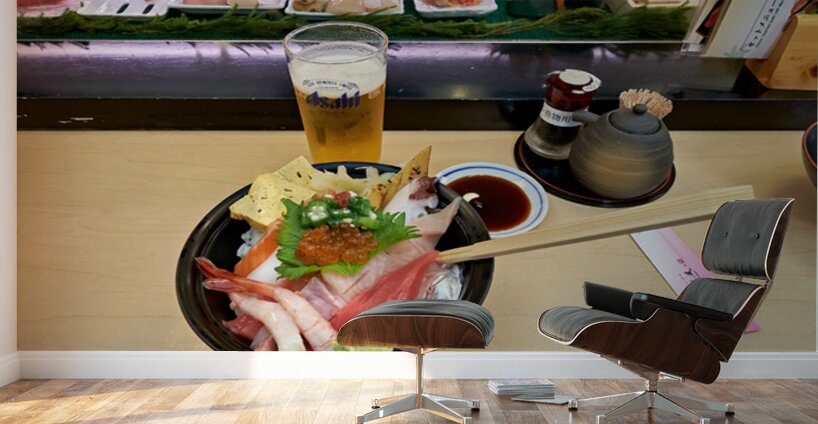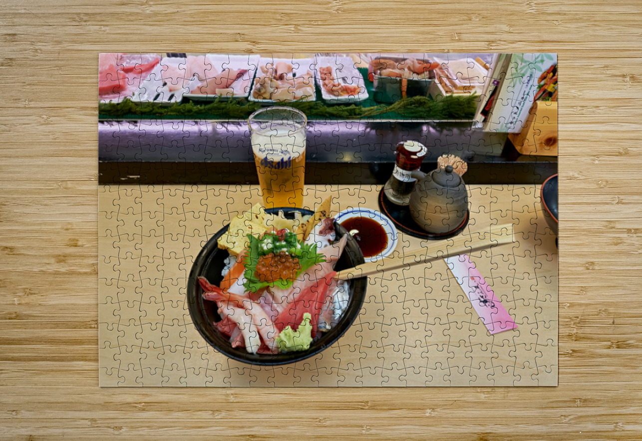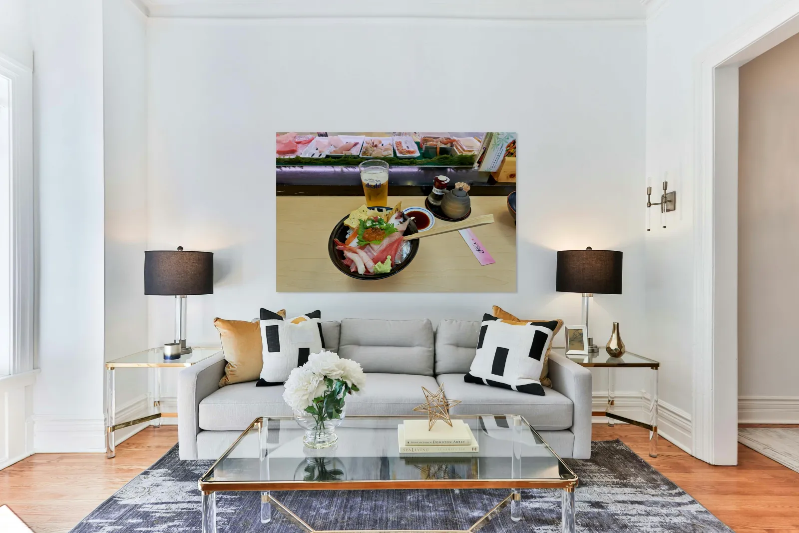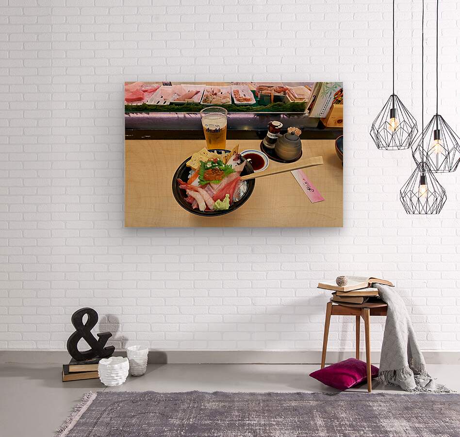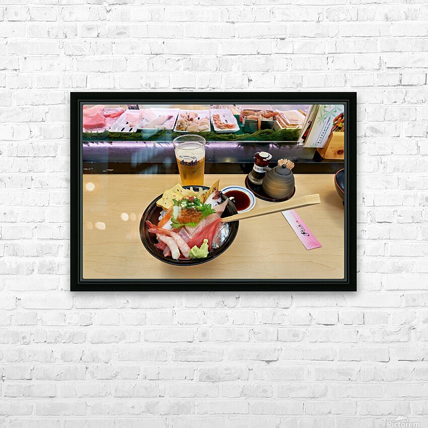 "Sushi bar with fresh sashimi and beer in Shibuya Tokyo" in a framed print.