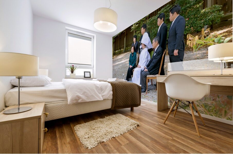 A couple participates in a traditional wedding ceremony at Meiji Jingu in Tokyo. Family members are present observing the customs.