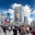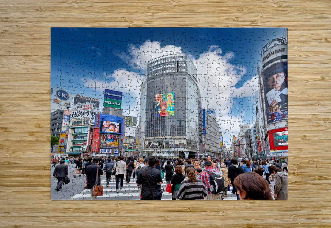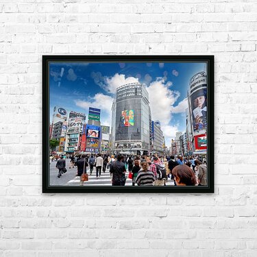 People walk across Shibuya Crossing in Tokyo at rush hour. Large buildings and billboards surround the area. Many people are in motion.