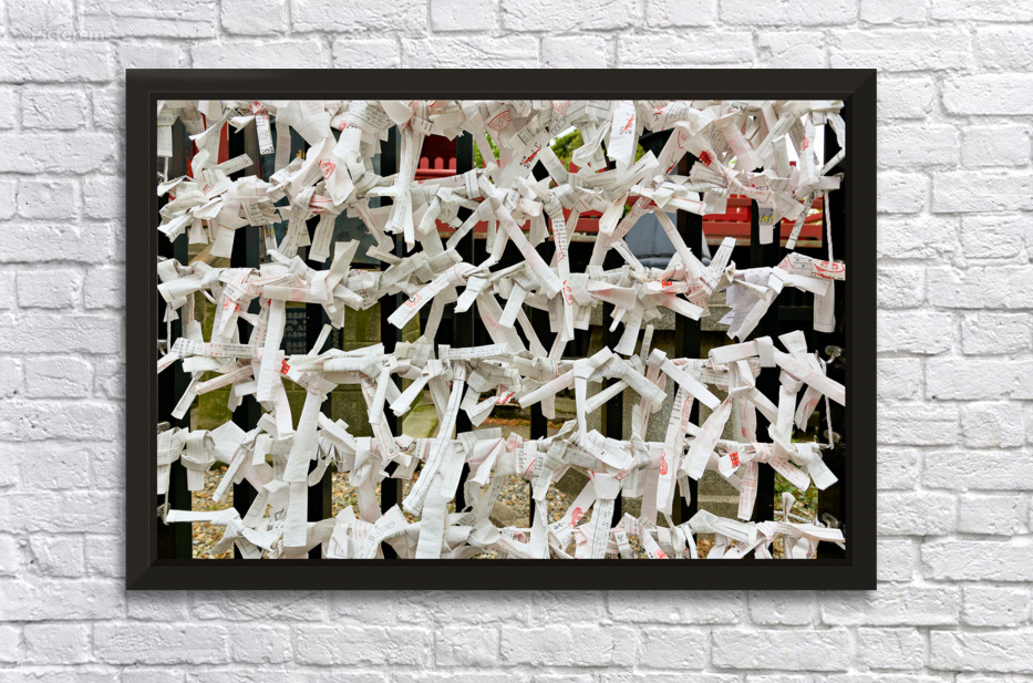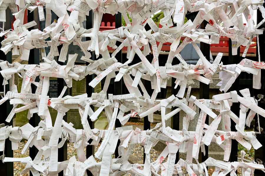 Visitors write wishes on strips of paper at Senso Ji Temple in Asakusa Tokyo. Many hang their wishes on racks as part of the tradition.