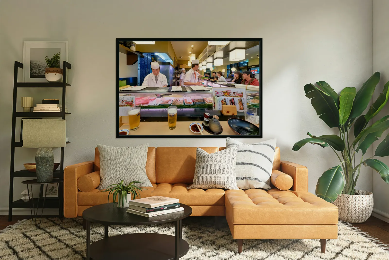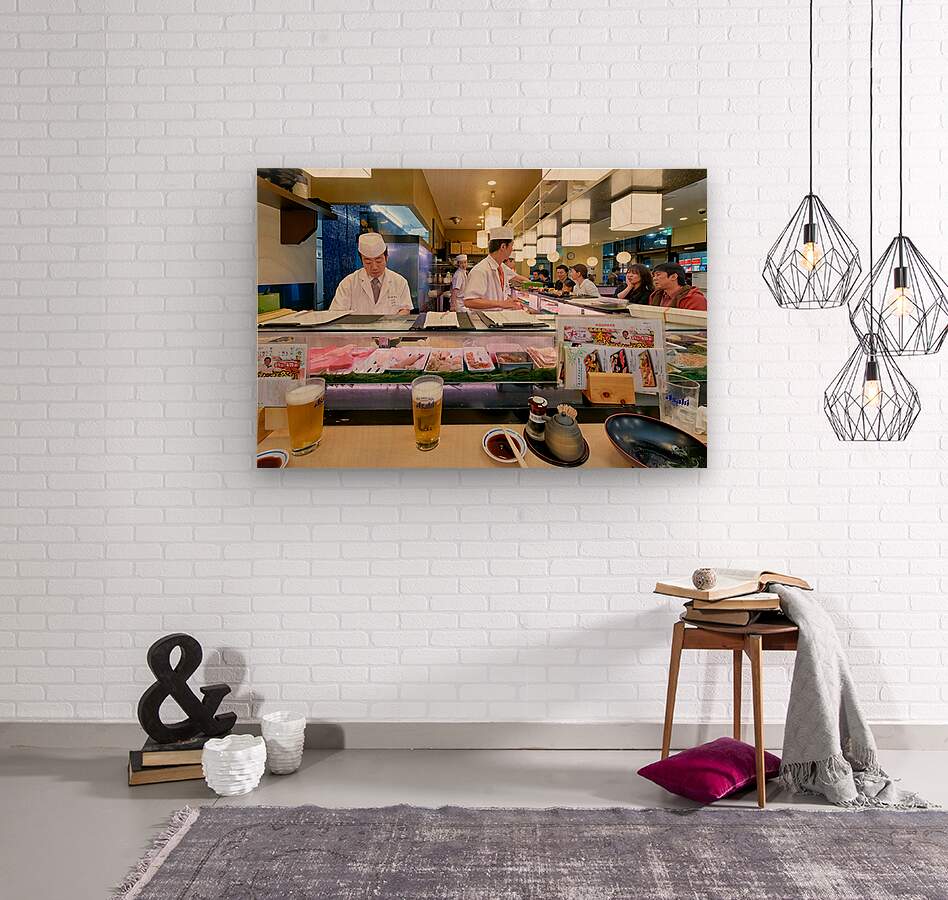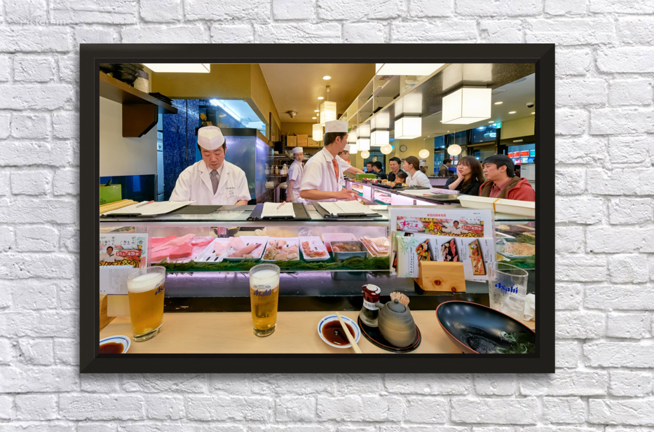 Chefs prepare sushi at a busy bar in Shibuya Tokyo. Guests watch and enjoy their food while drinks are served.