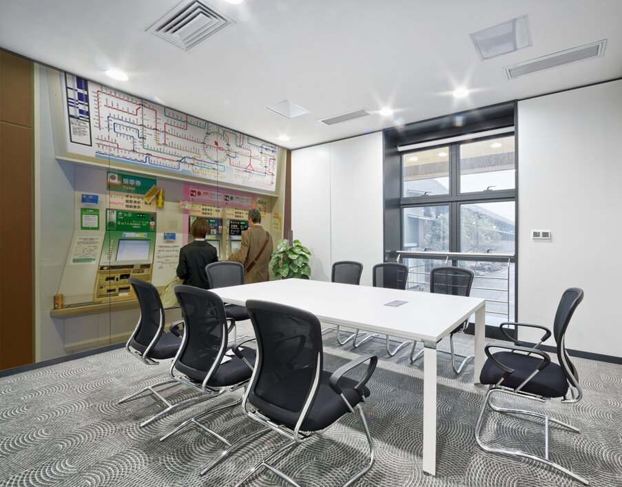 Two people use a metro ticket machine in Tokyo. The map of the train lines is visible on the wall. This scene shows daily activities in the city.