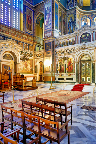 The interior of Mitropolis Cathedral shows detailed artwork on walls and a quiet area with wooden chairs. Light enters through stained glass windows.