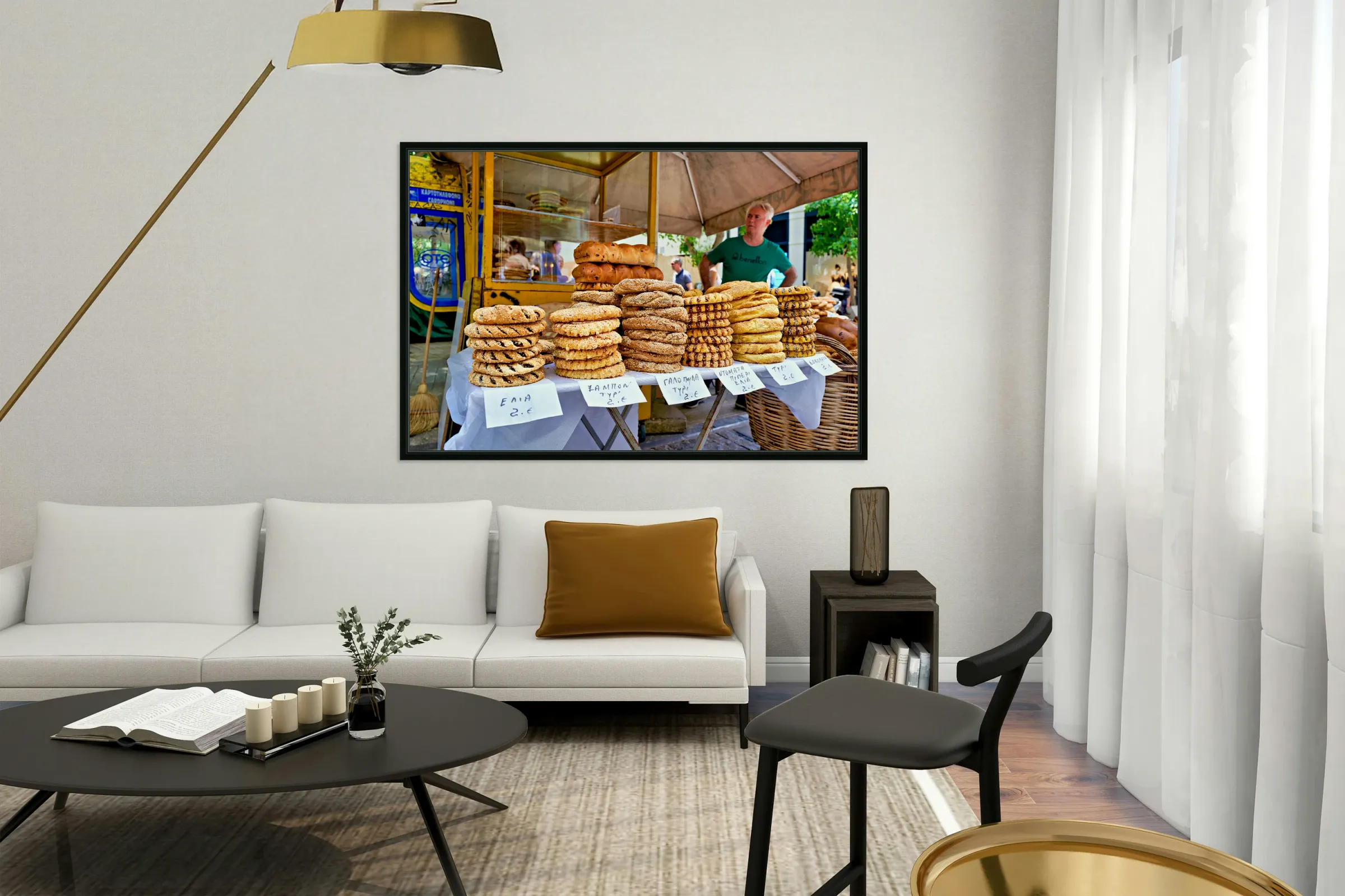 Food stall offers baked goods in downtown Athens Greece Frame print