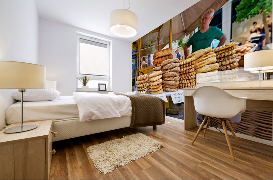 A food stall in downtown Athens sells a variety of baked bread and snacks. A vendor stands by the display engaging with customers.