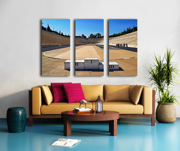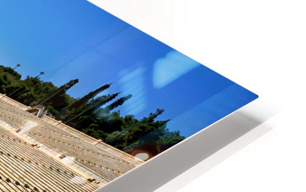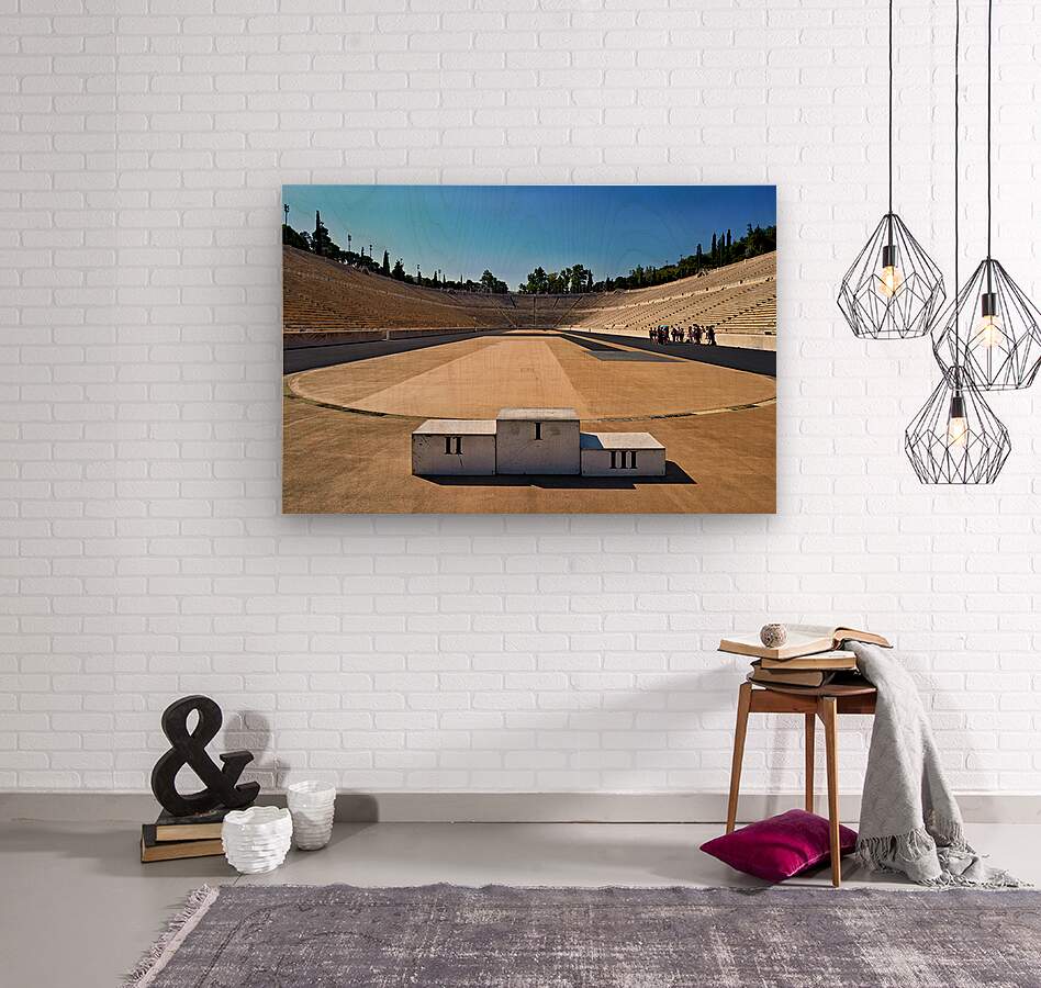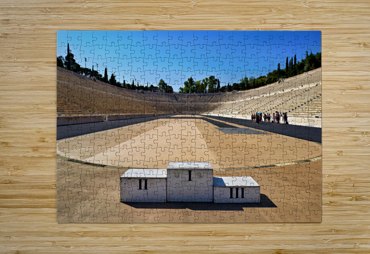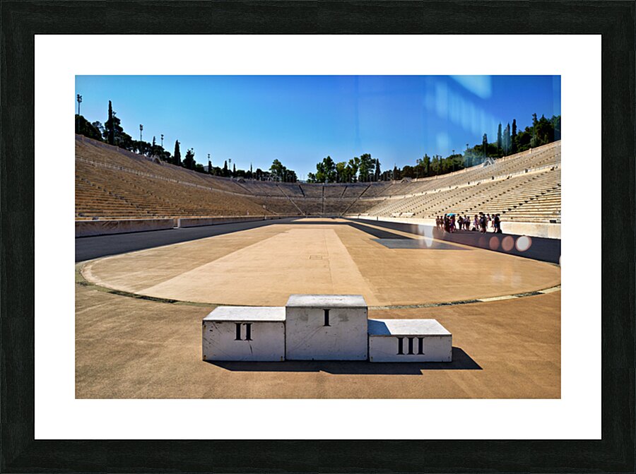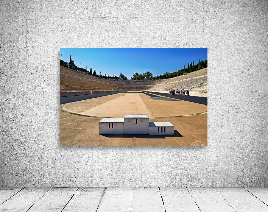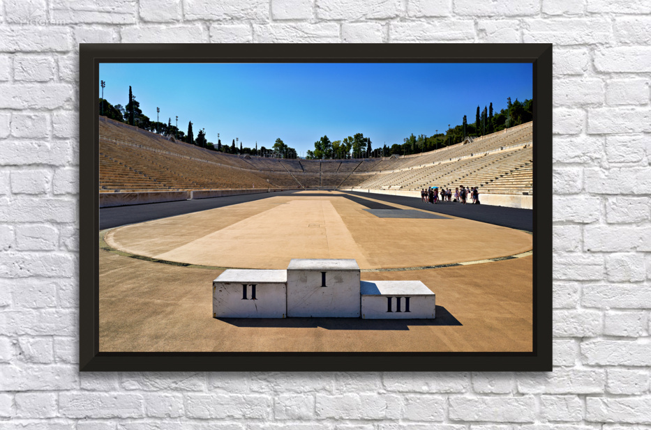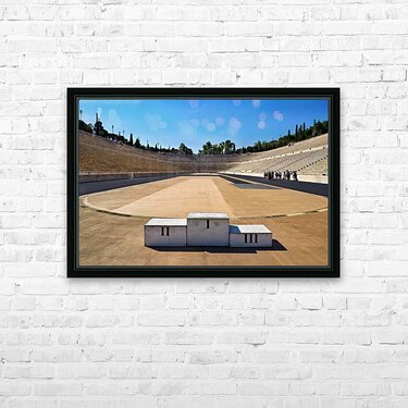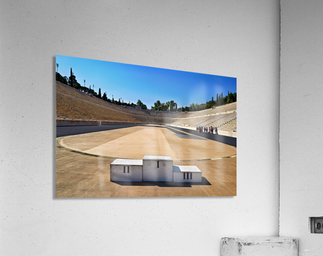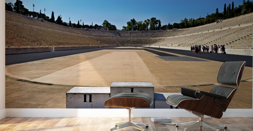 The Panathenaic Stadium in Athens displays its empty track and podium during a sunny day. It is a historic site for events and concerts.