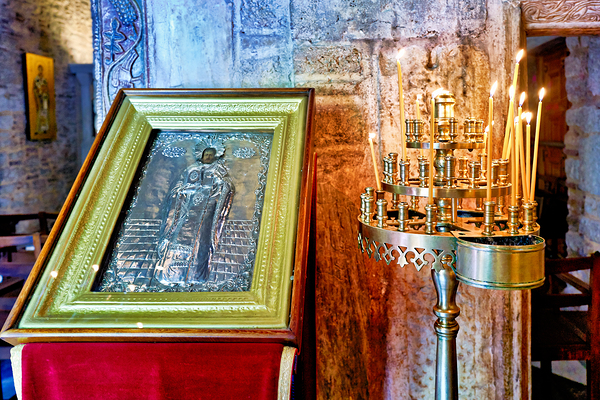 People light votive candles at Agios Eleftherios Orthodox Church in Athens Greece. The church features a religious icon and a candle holder.