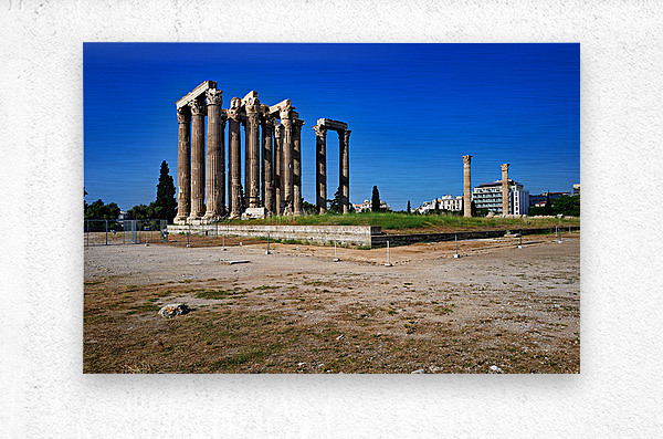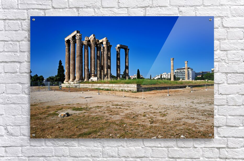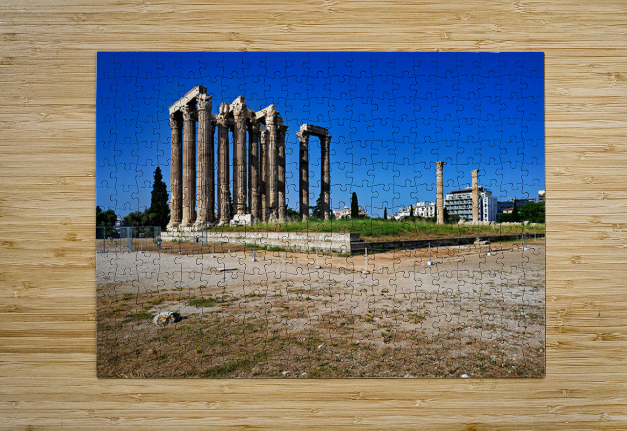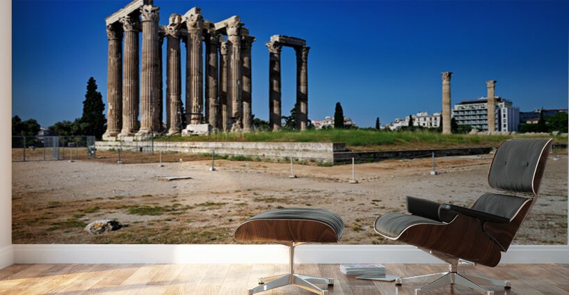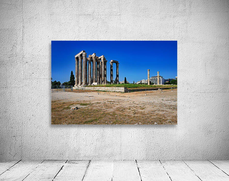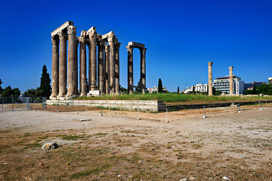 Tourists explore the ancient ruins of the Temple of Olympian Zeus in Athens Greece under clear blue skies and warm sunlight.