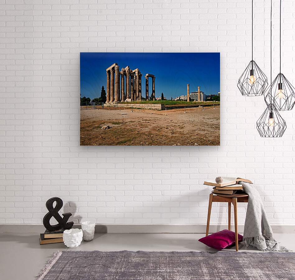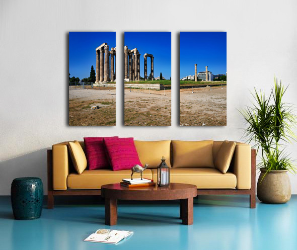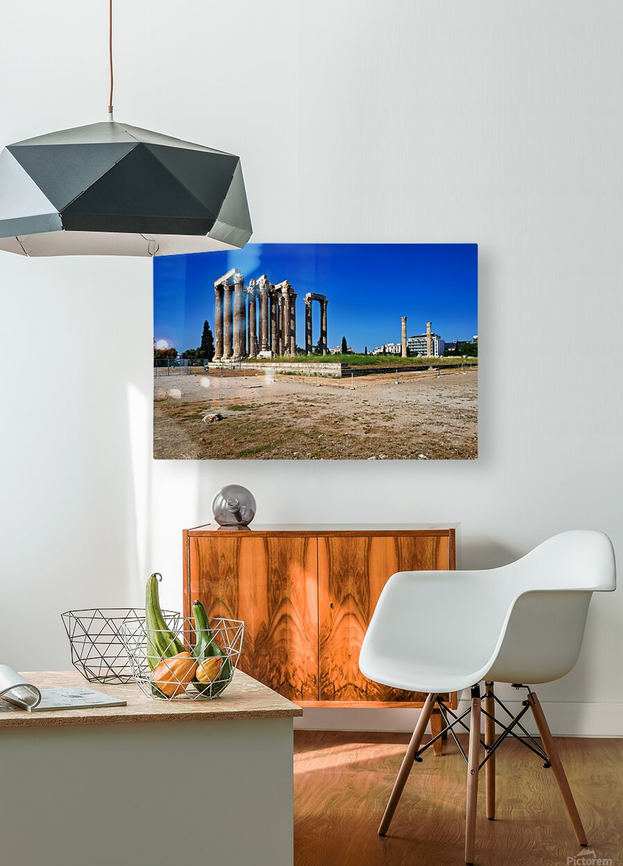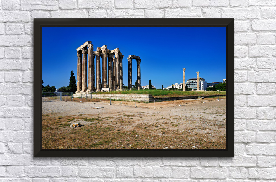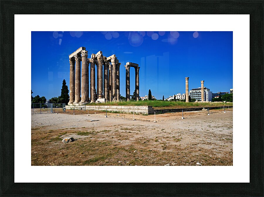Tourists explore the ancient ruins of the Temple of Olympian Zeus in Athens Greece under clear blue skies and warm sunlight.