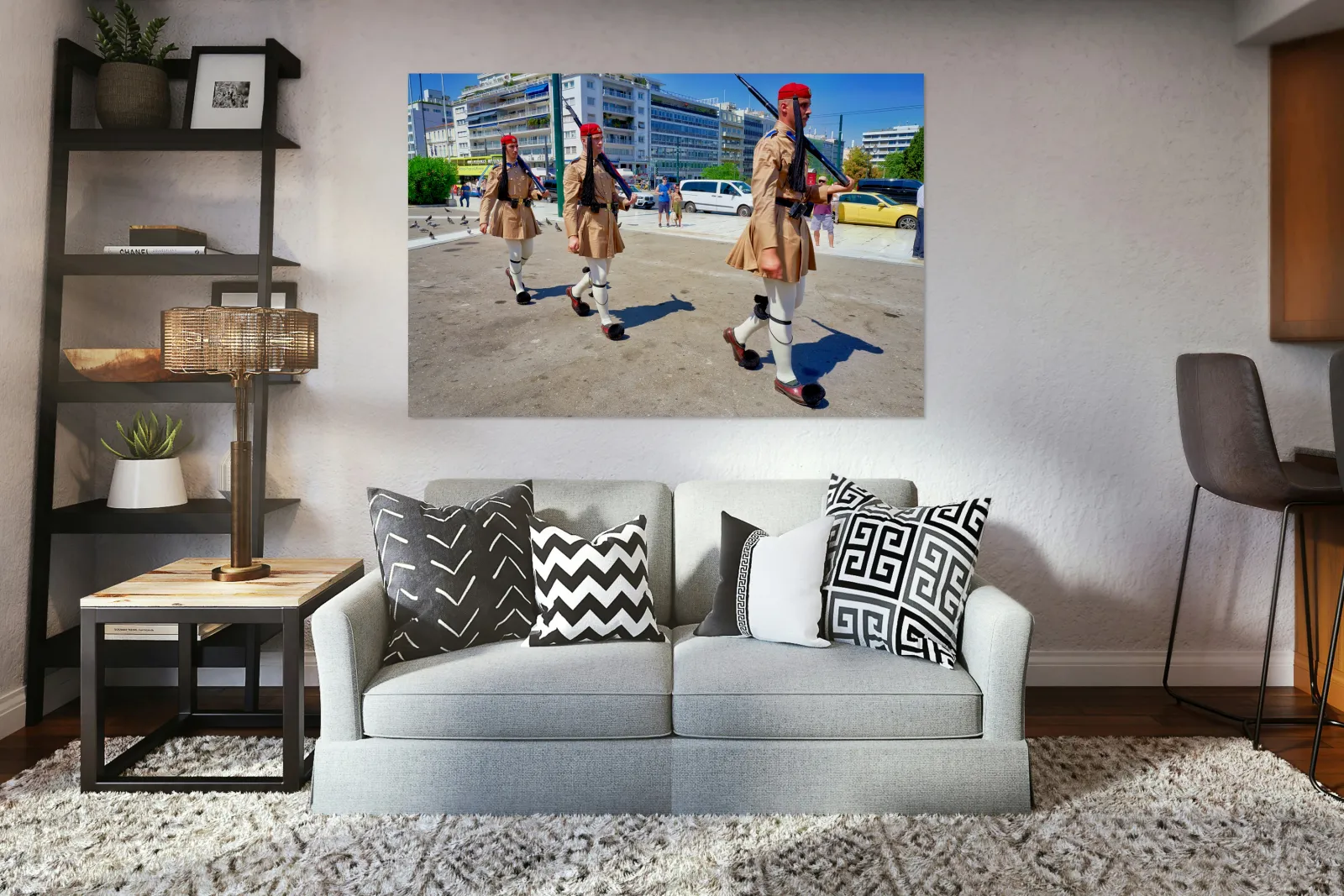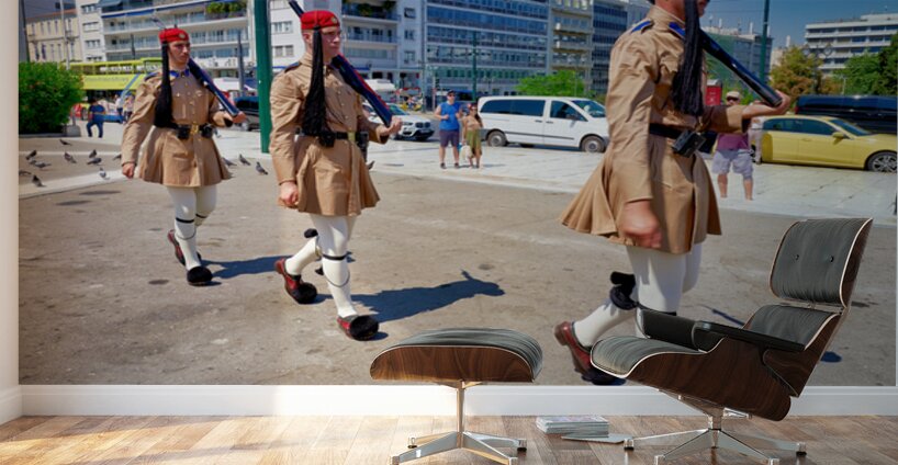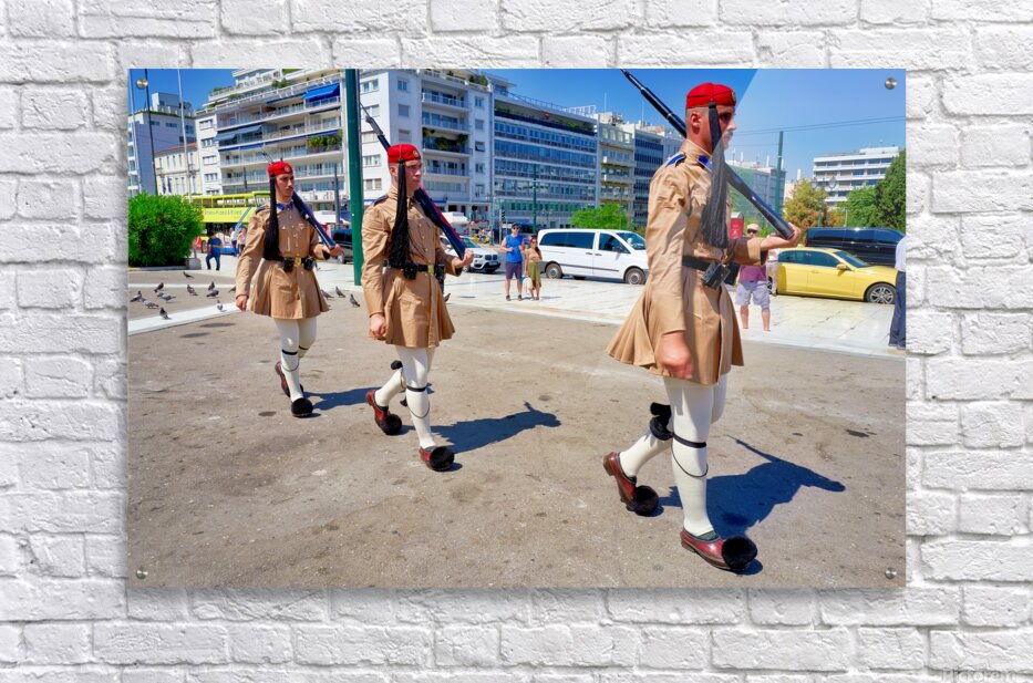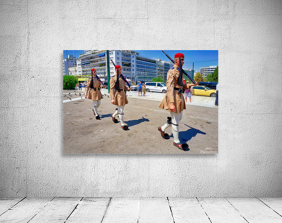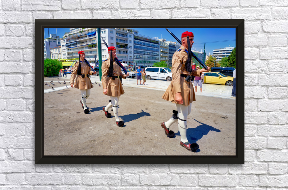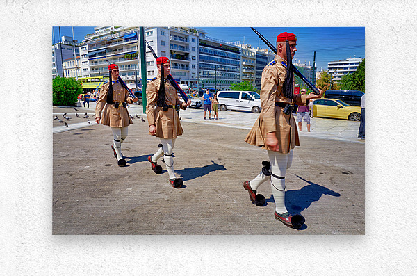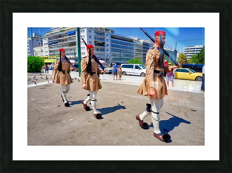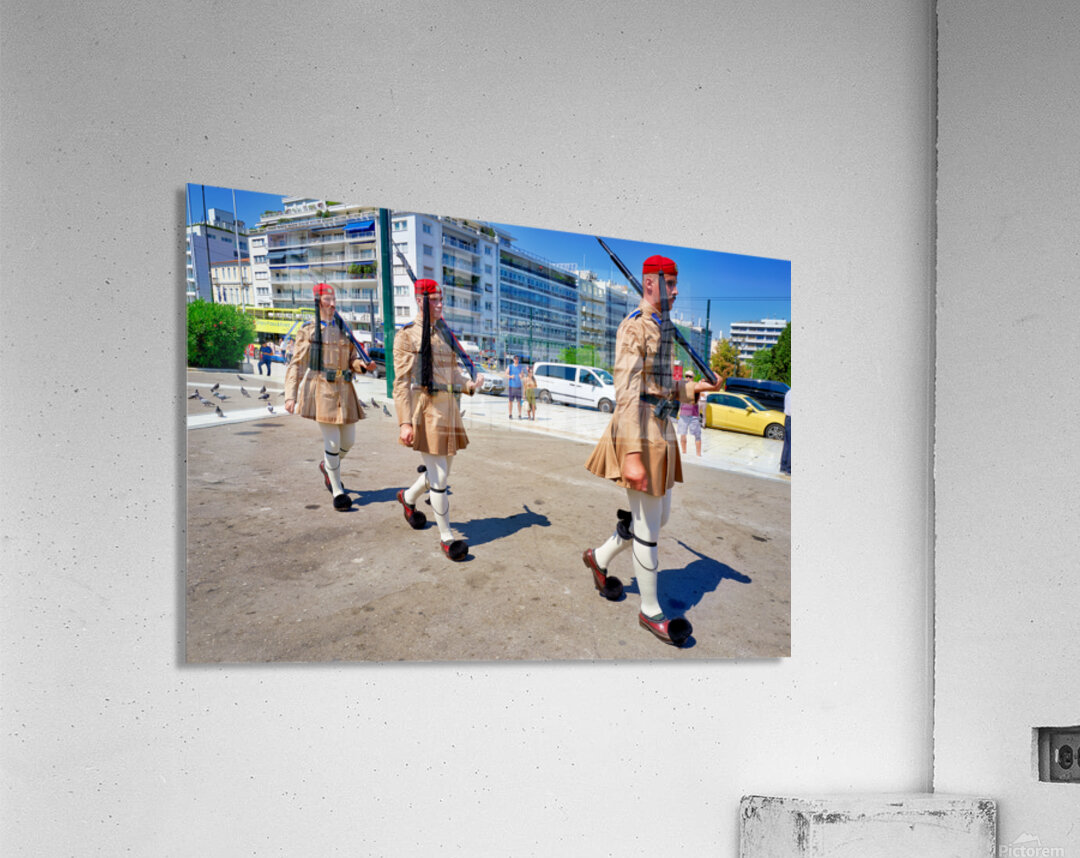 Guards march in formation during the changing of the guard at Syntagma square in front of the Hellenic Parliament in Athens Greece.