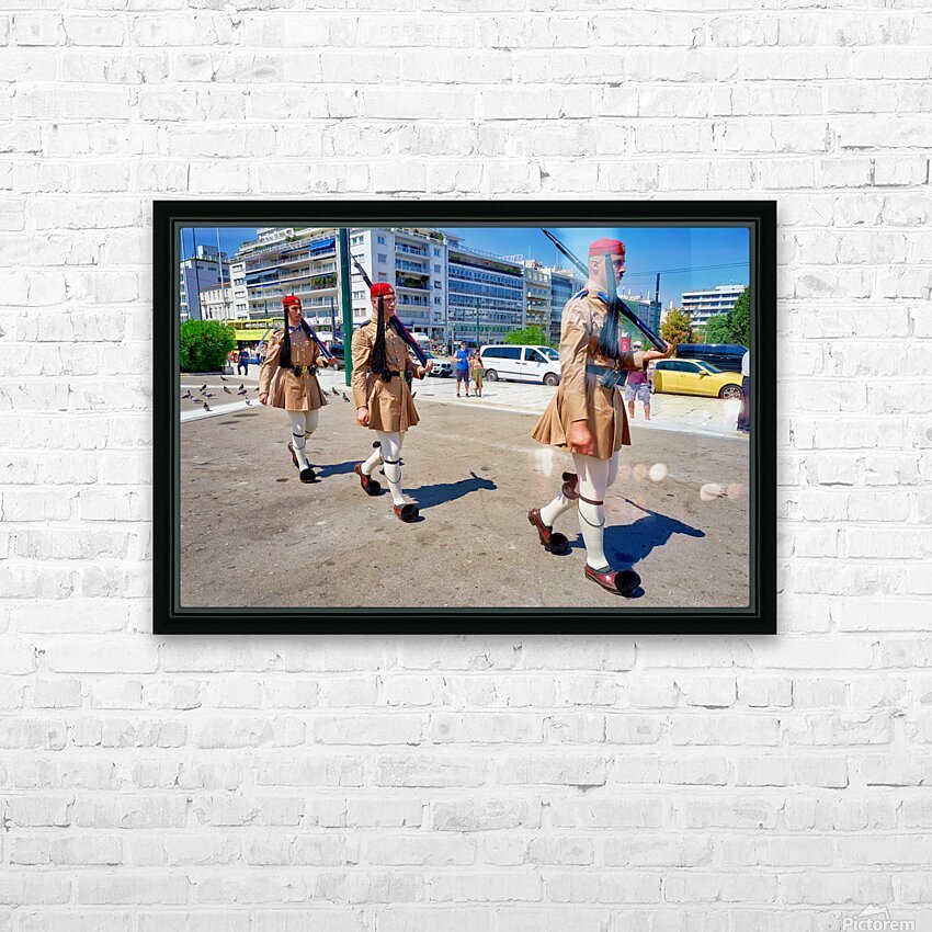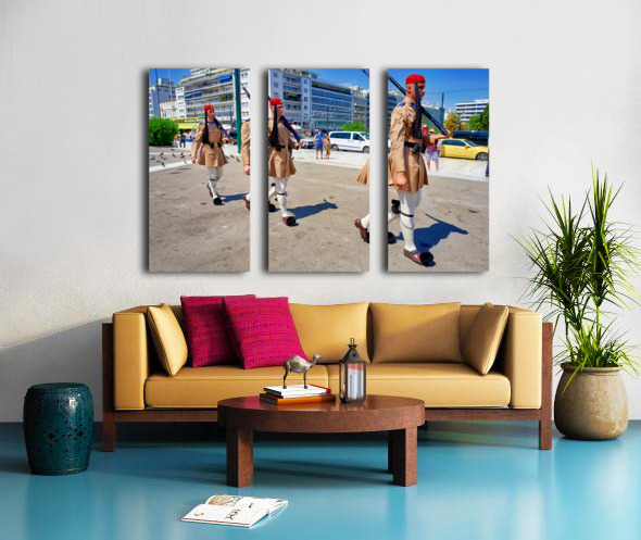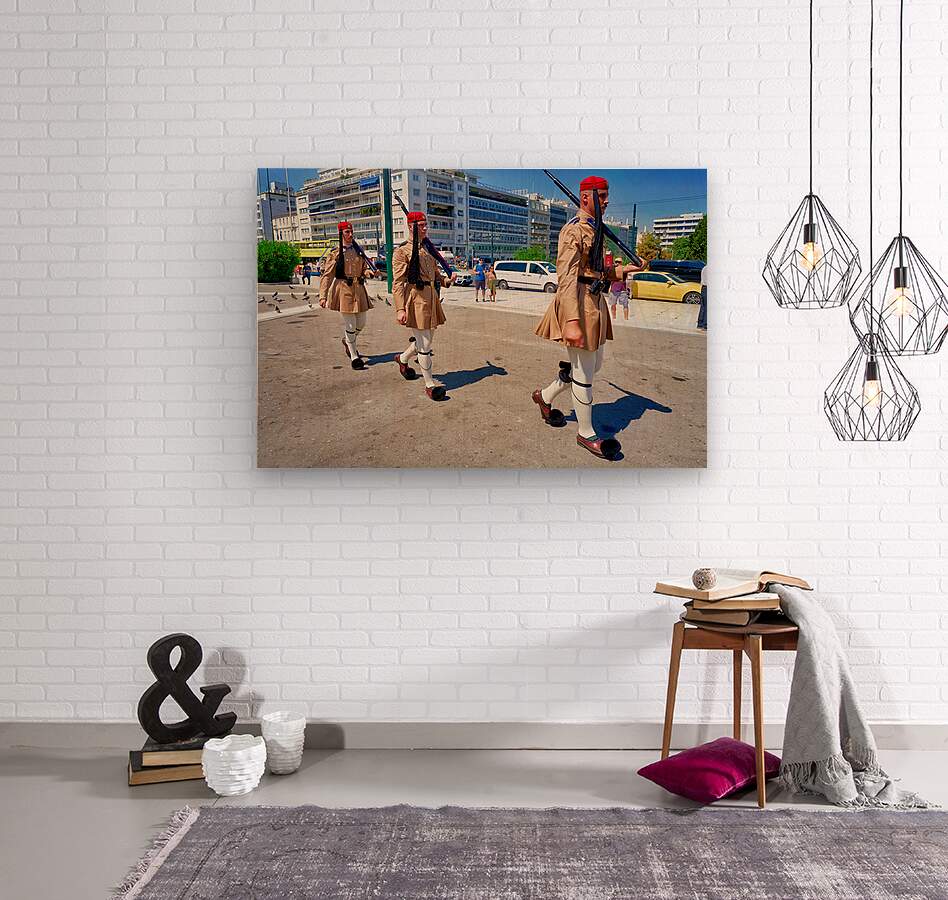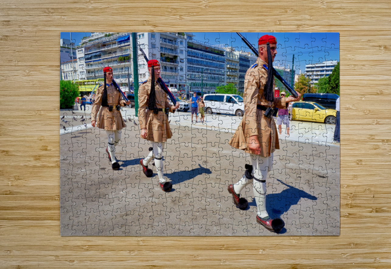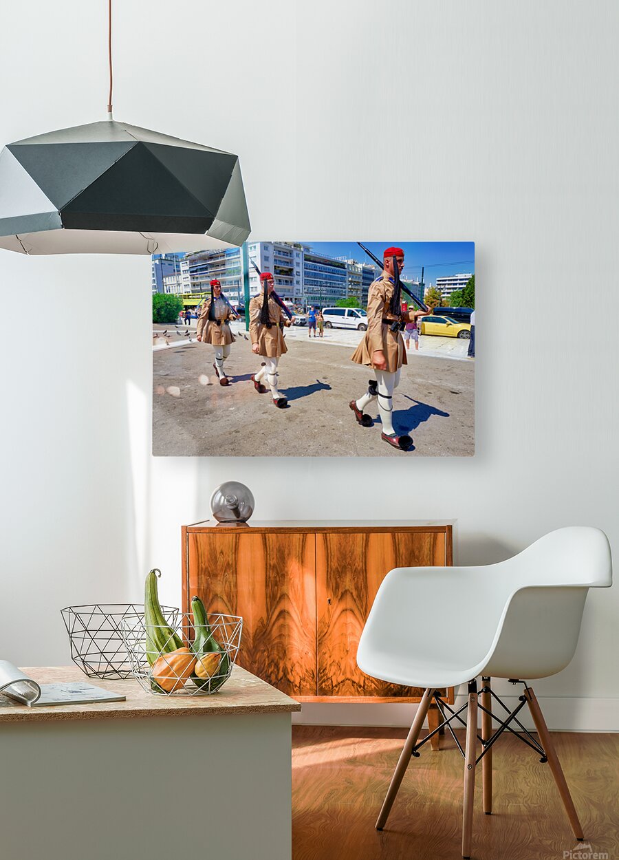 Guards march in formation during the changing of the guard at Syntagma square in front of the Hellenic Parliament in Athens Greece.