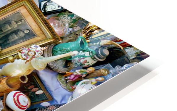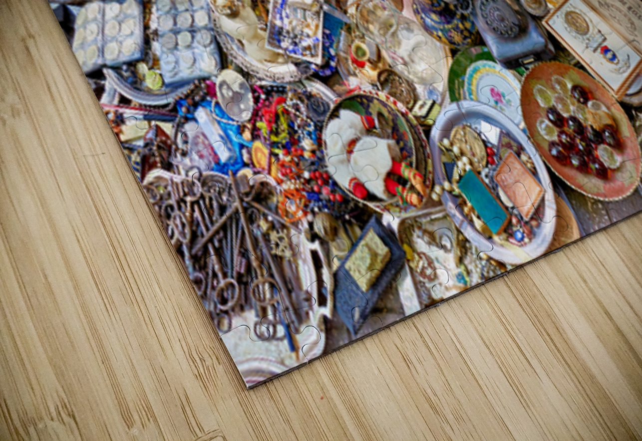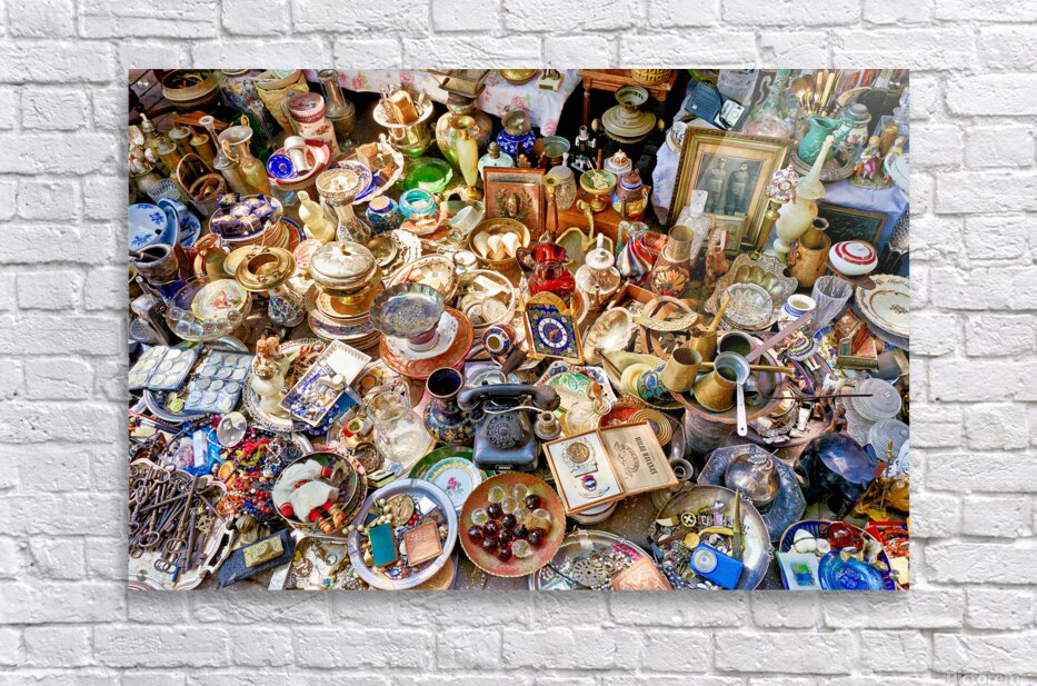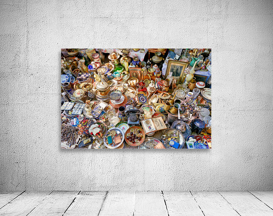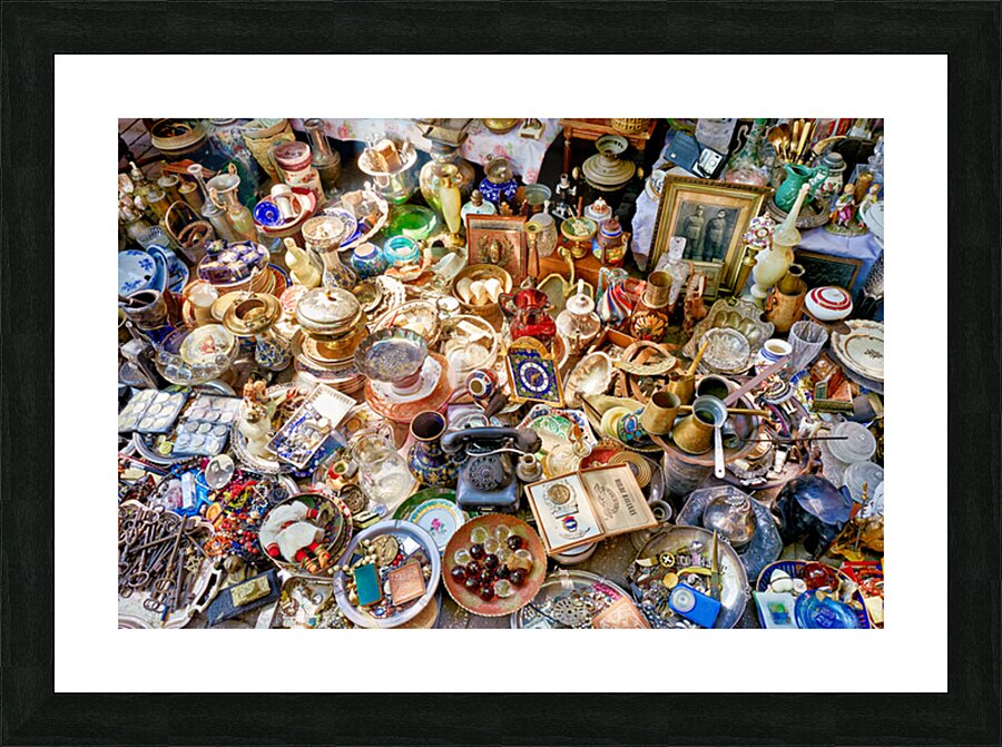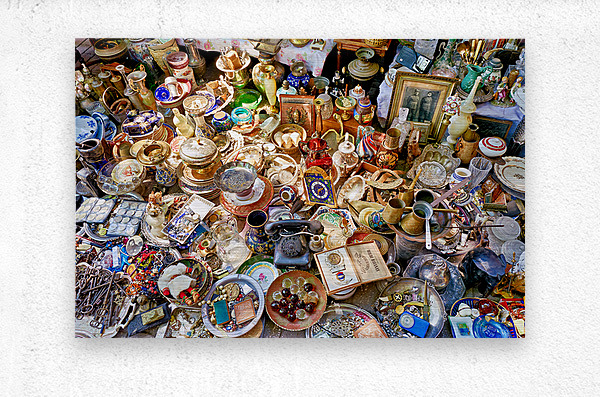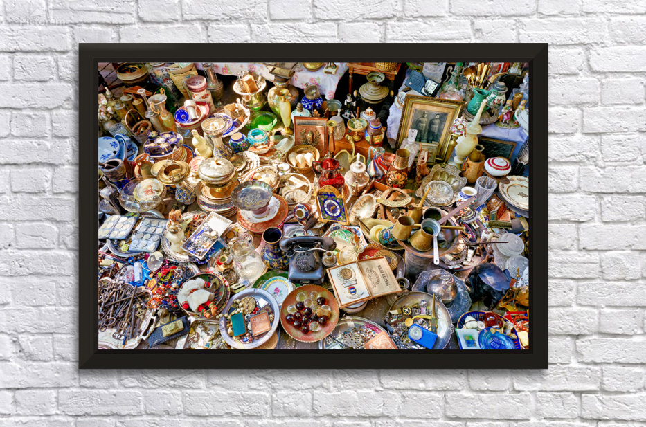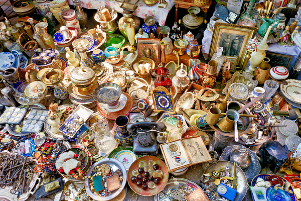 Visitors browse through various items for sale at the flea market in Monastiraki Athens. Stalls display many antiques and collectibles.