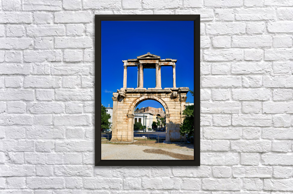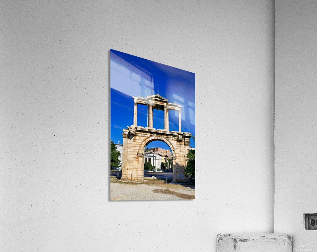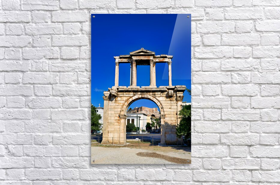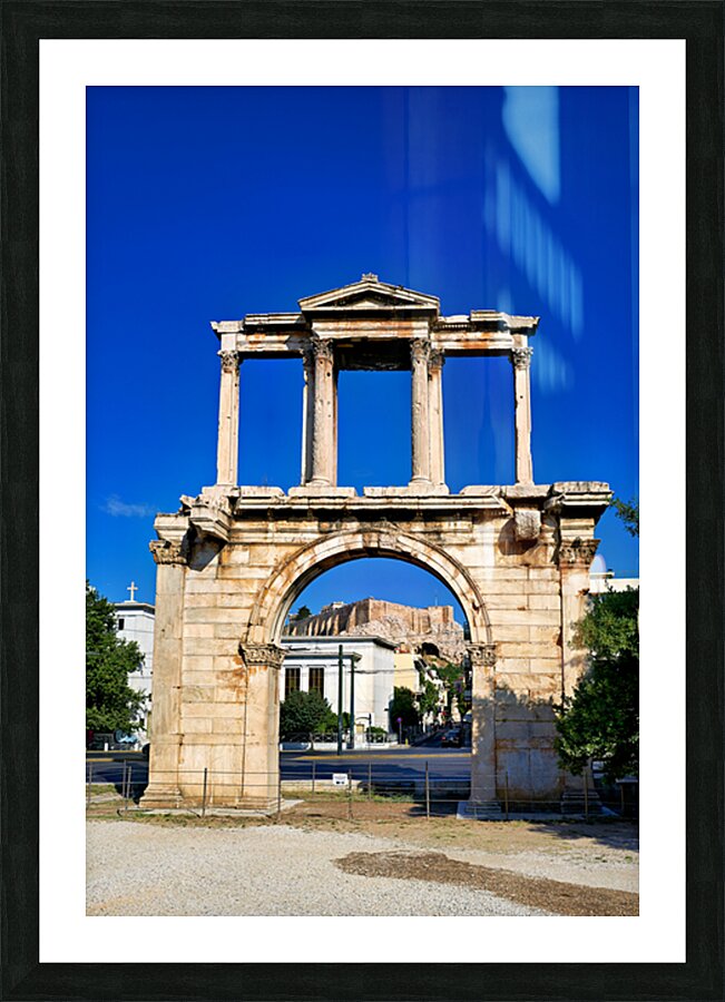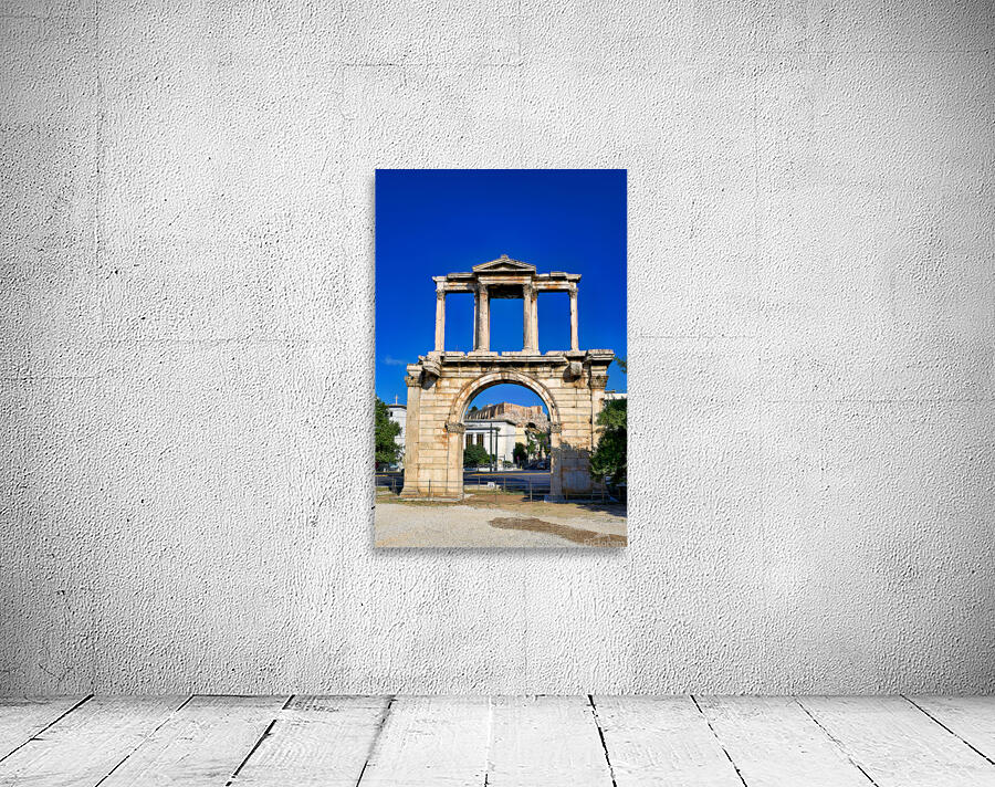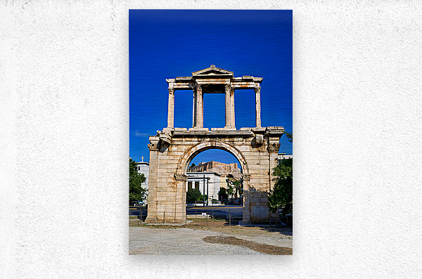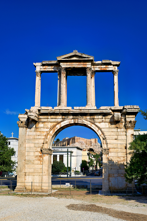 Hadrians Arch marks the entrance to the ancient part of Athens. Visitors admire its large structure against a blue sky.