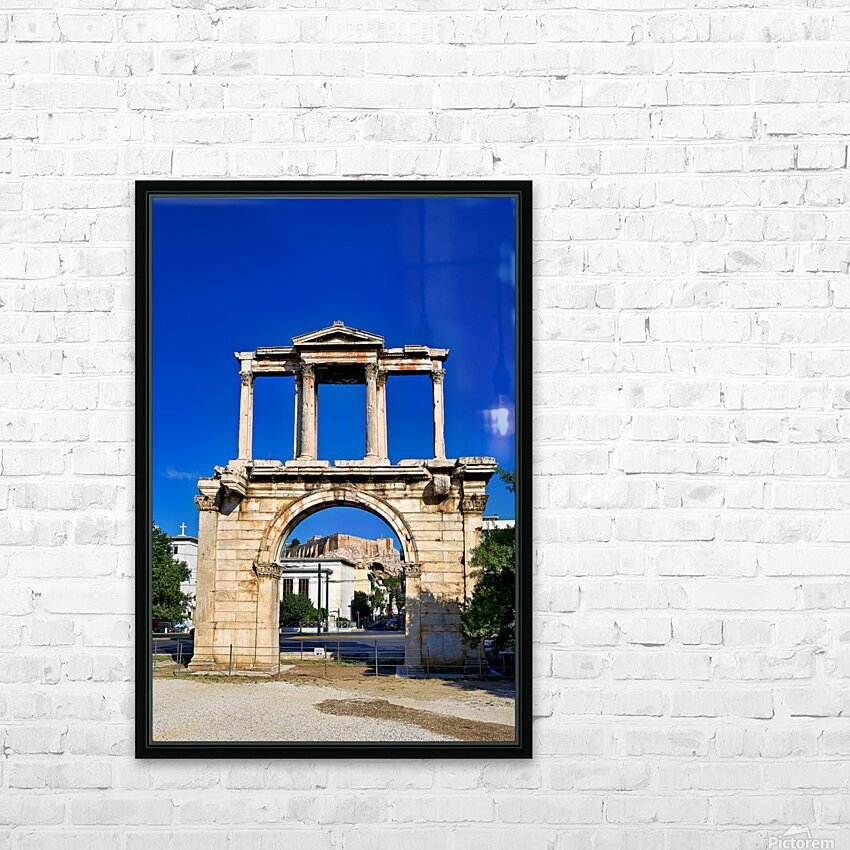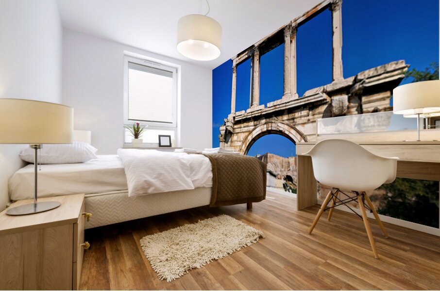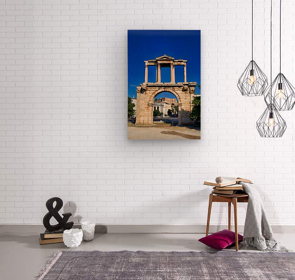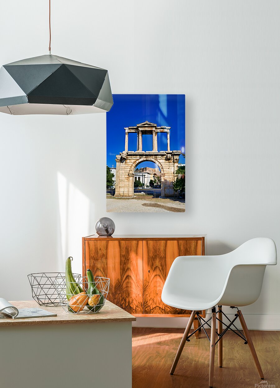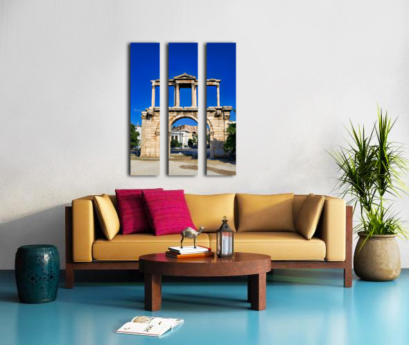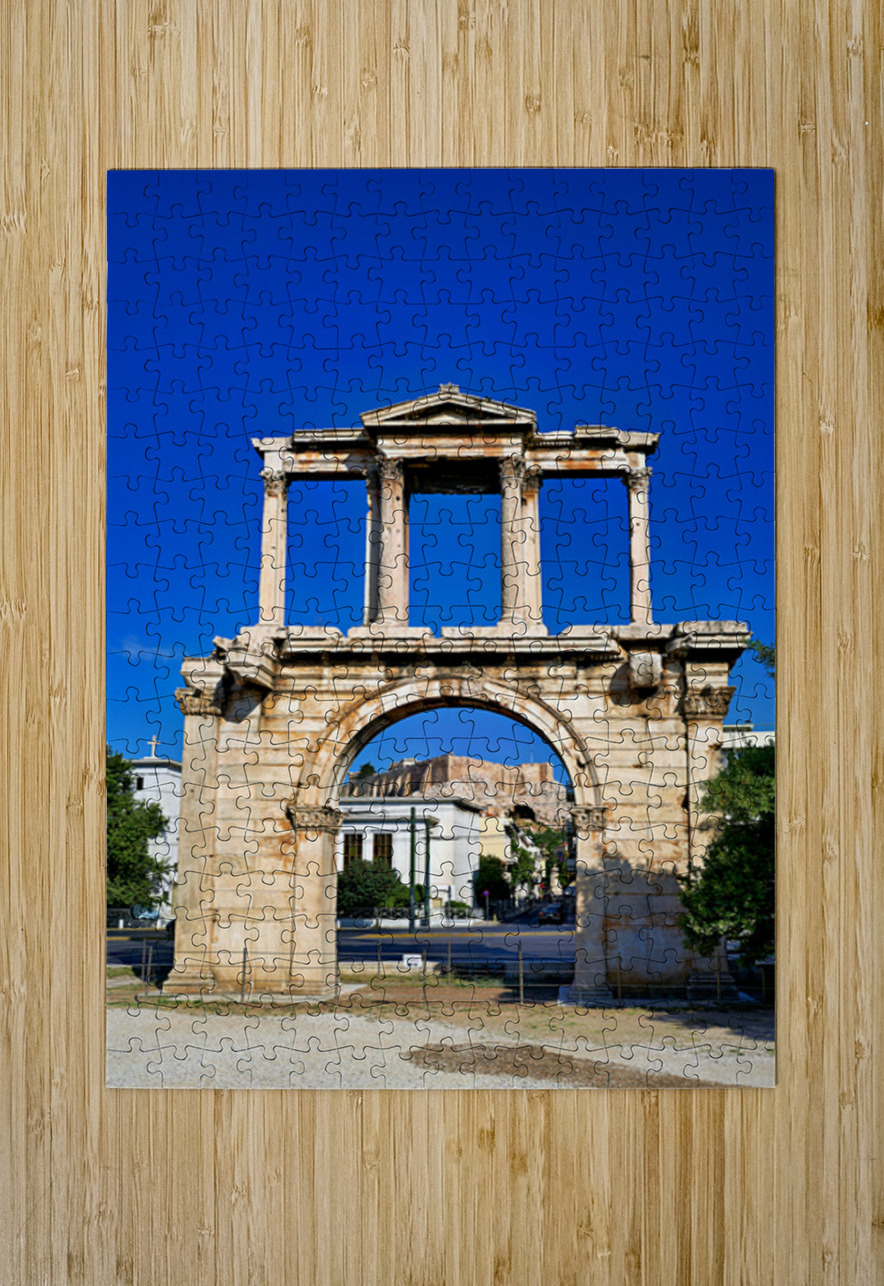 Hadrians Arch marks the entrance to the ancient part of Athens. Visitors admire its large structure against a blue sky.