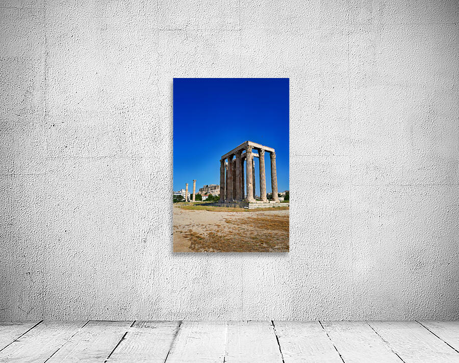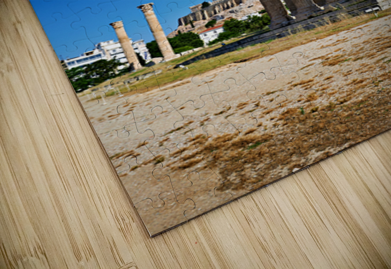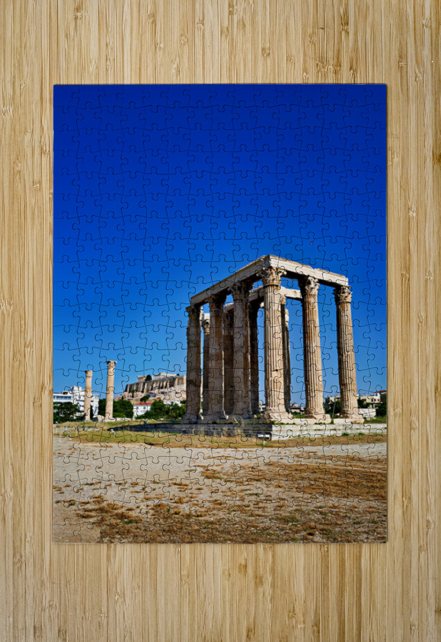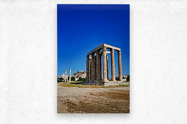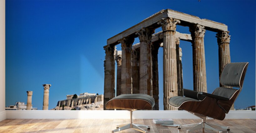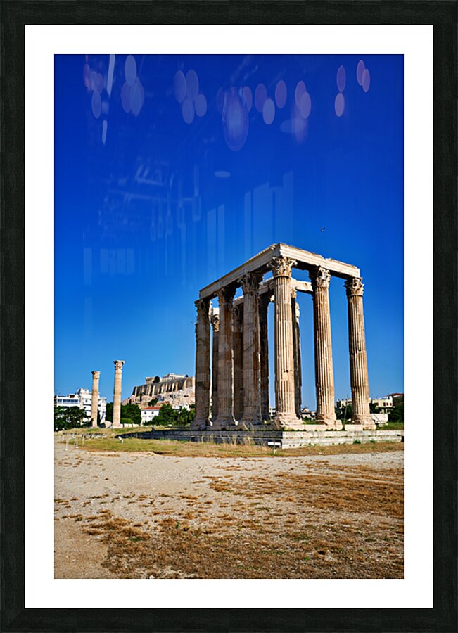 The Temple of Olympian Zeus stands tall in Athens. The Acropolis and Parthenon are visible behind the ancient ruins under a clear sky.