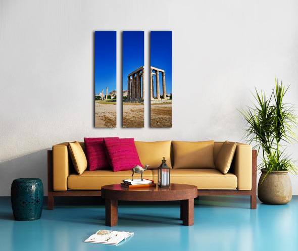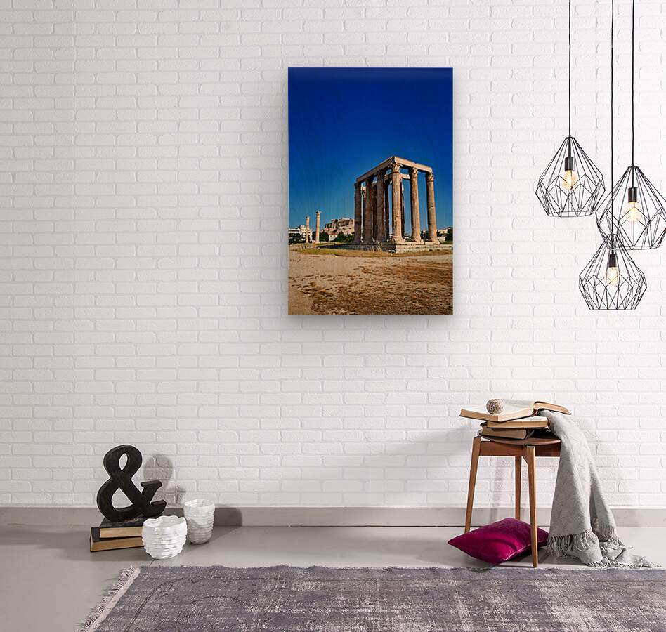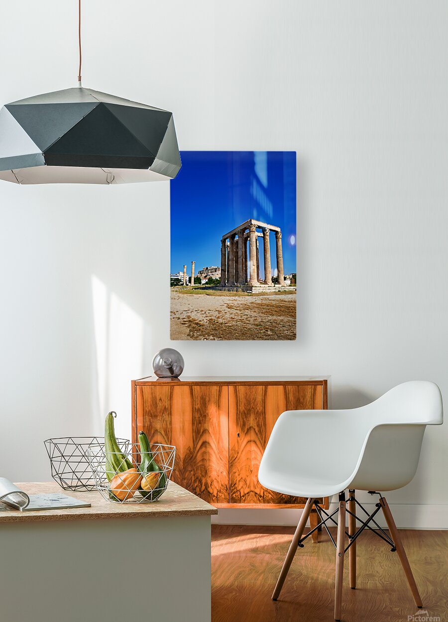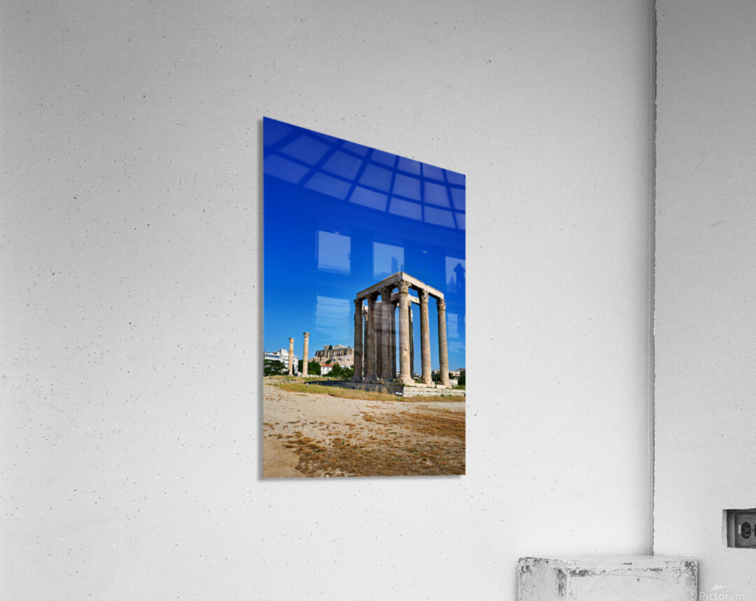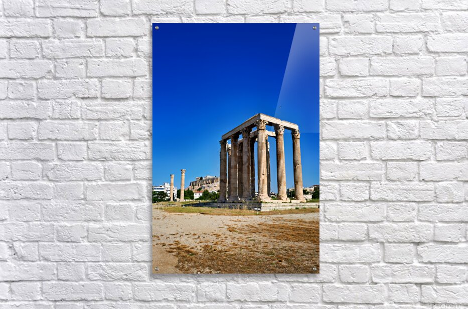 The Temple of Olympian Zeus stands tall in Athens. The Acropolis and Parthenon are visible behind the ancient ruins under a clear sky.
