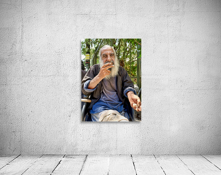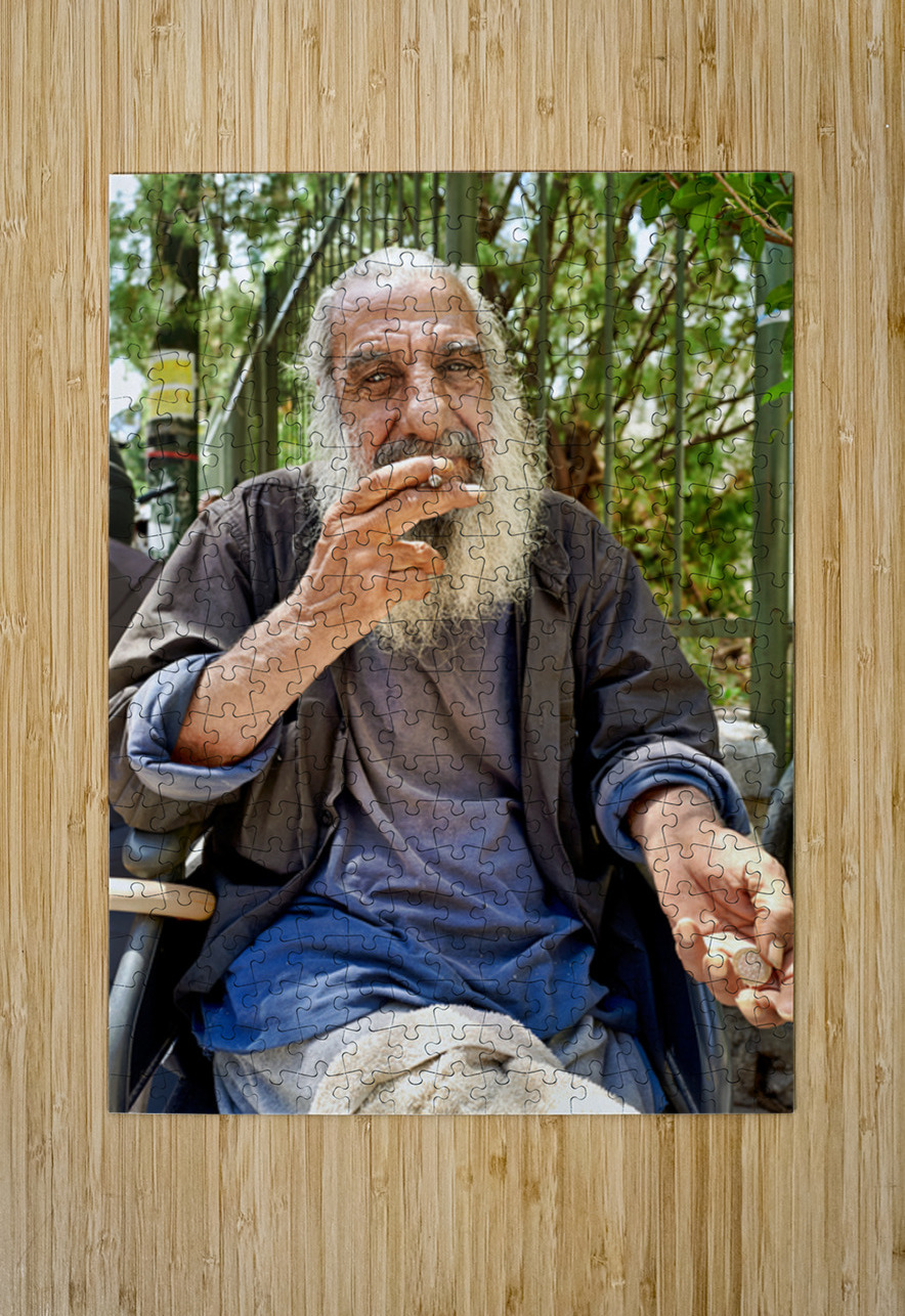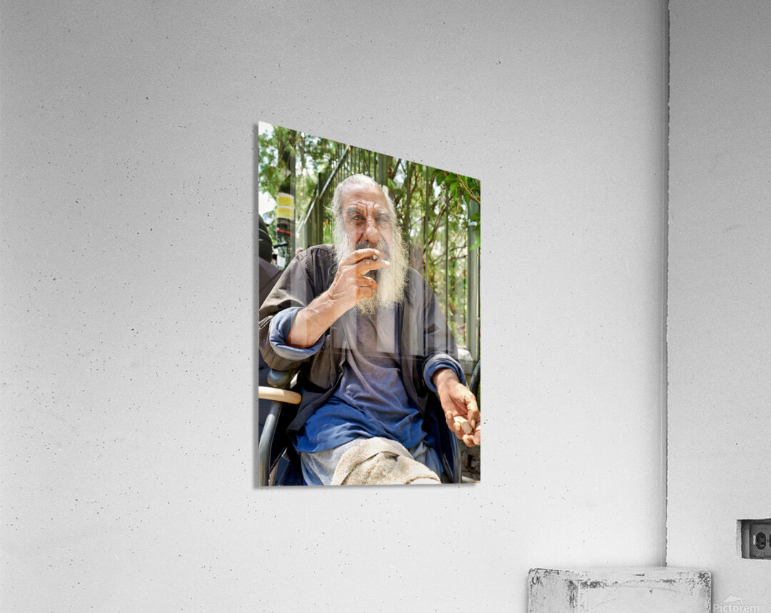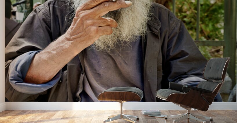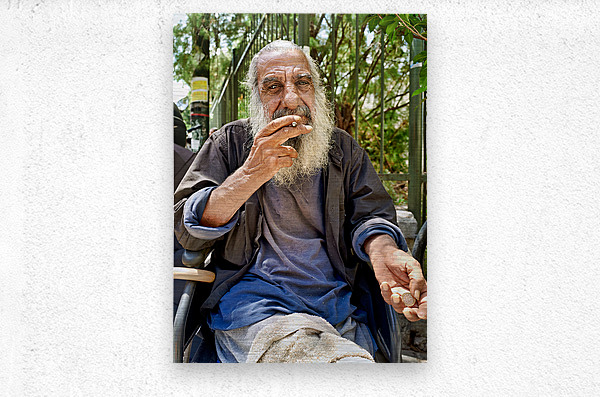 A man with long gray hair sits outdoors. He holds a cigarette in his hand and looks thoughtful. The city background features greenery.