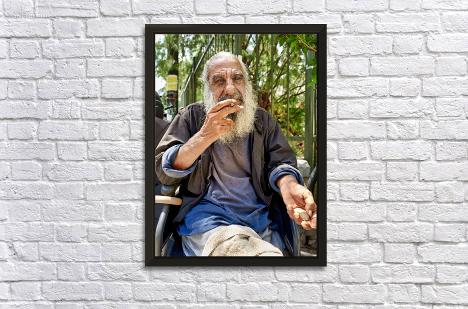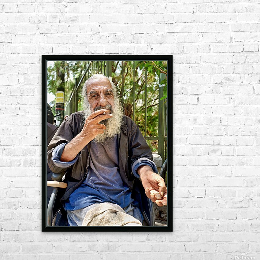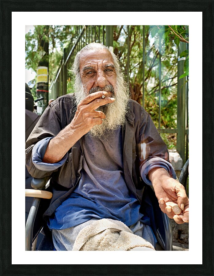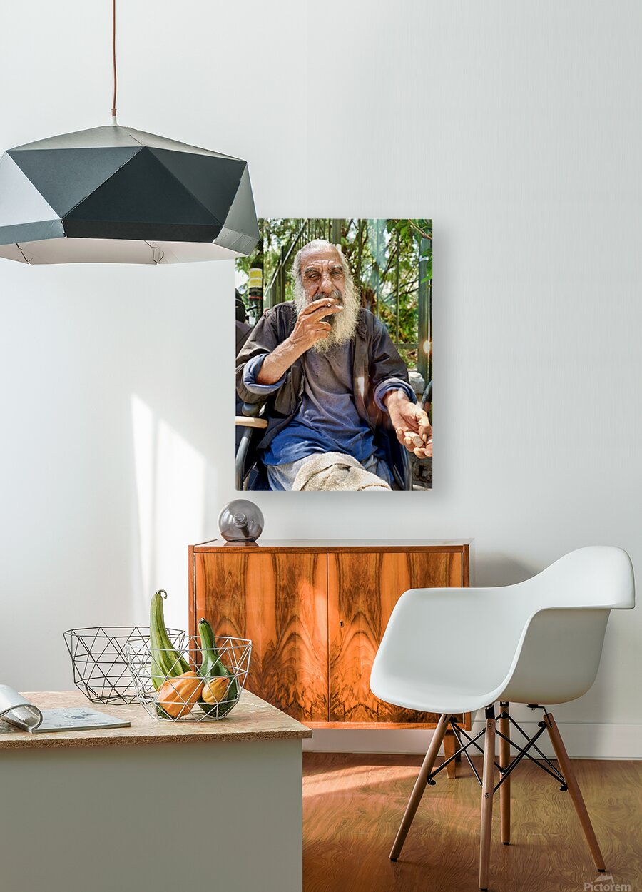 A man with long gray hair sits outdoors. He holds a cigarette in his hand and looks thoughtful. The city background features greenery.