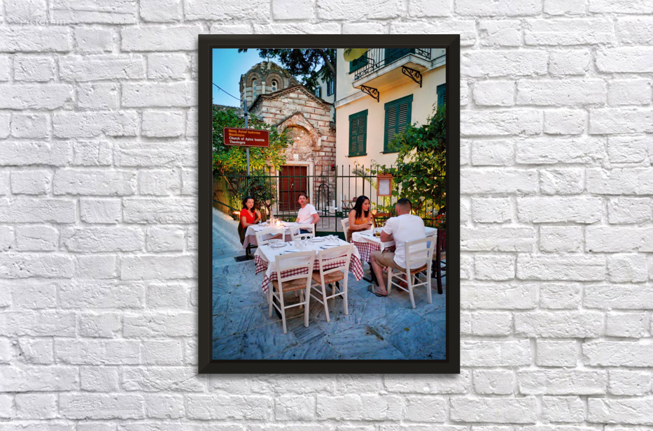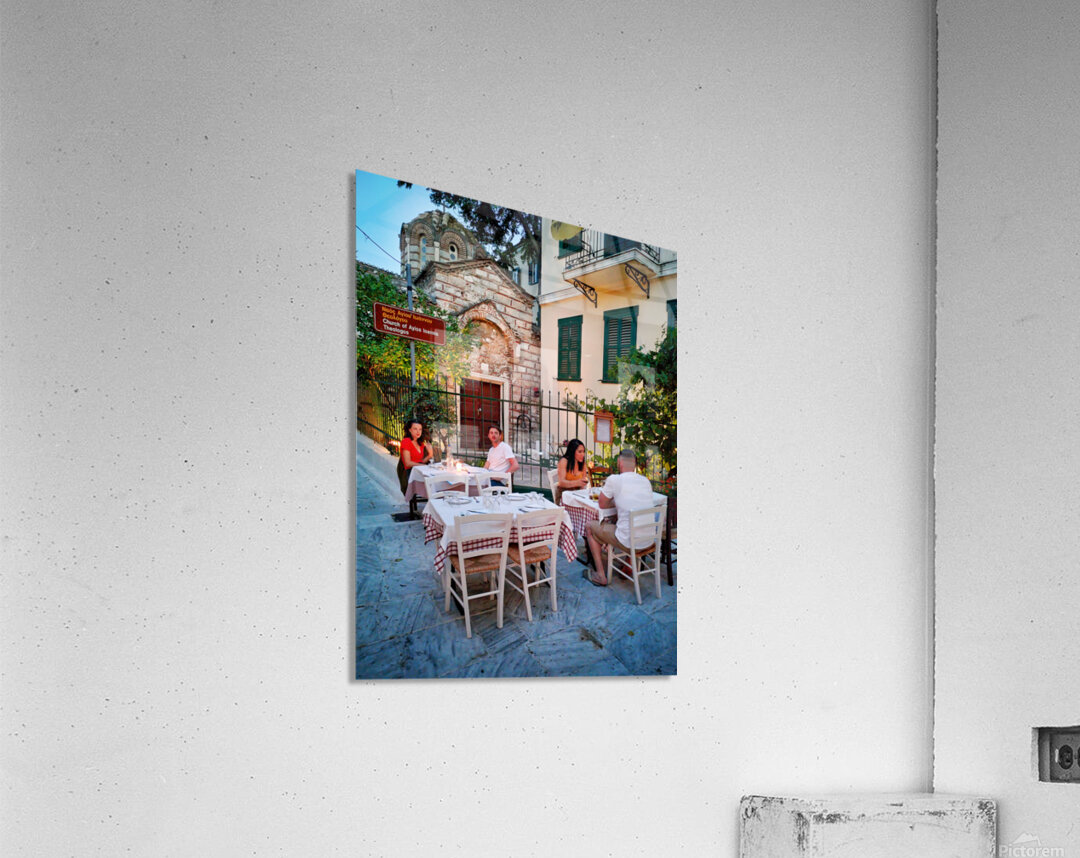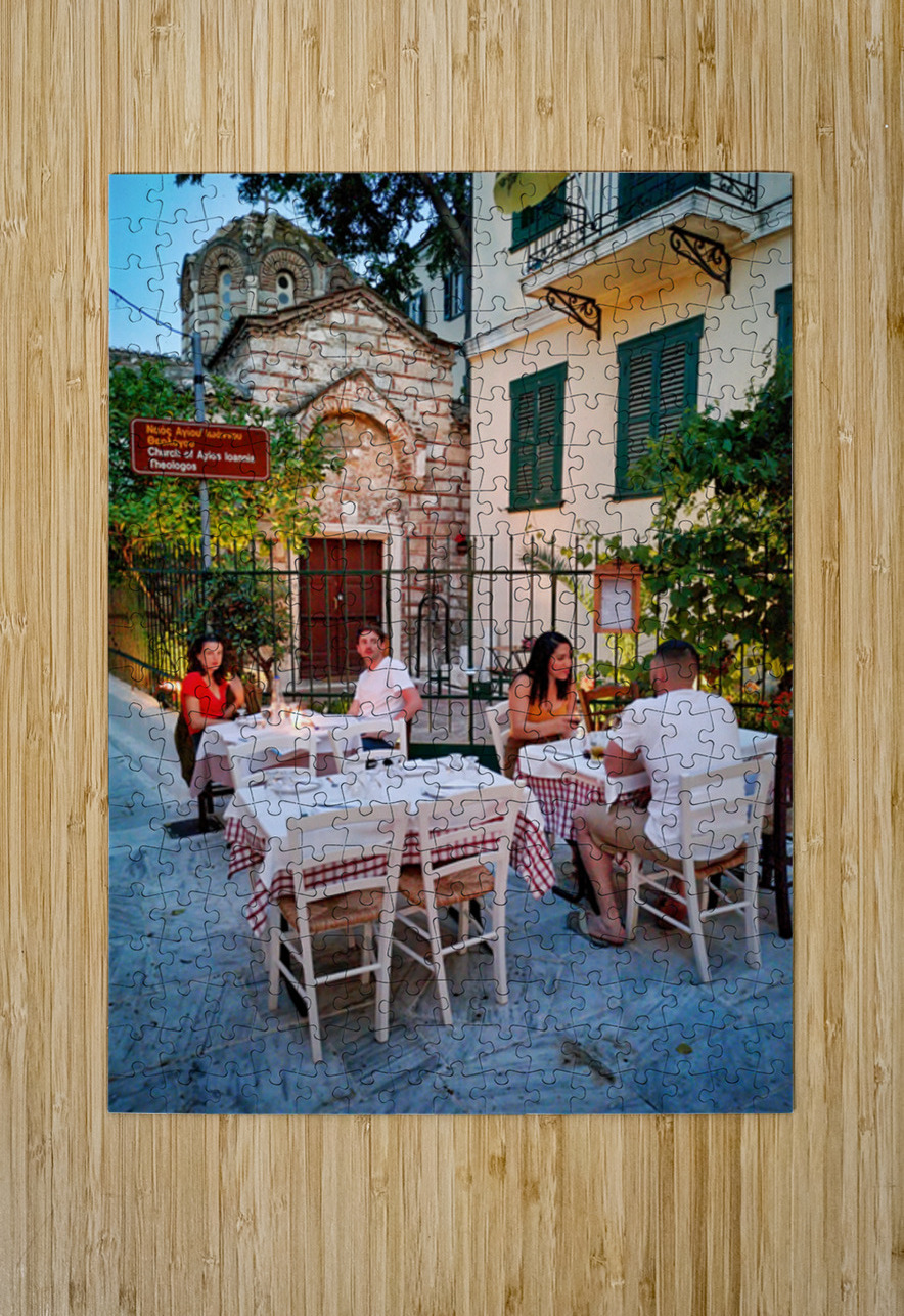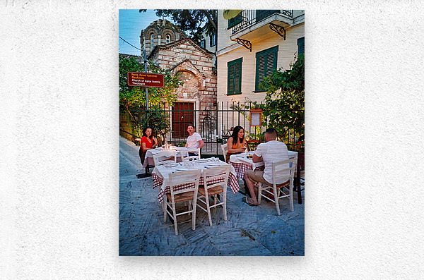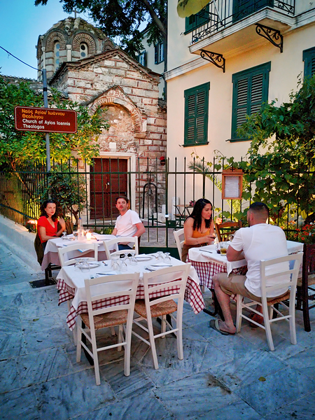 People sit at tables enjoying dinner near a church in a city. The scene shows a relaxed atmosphere with drinks and food.