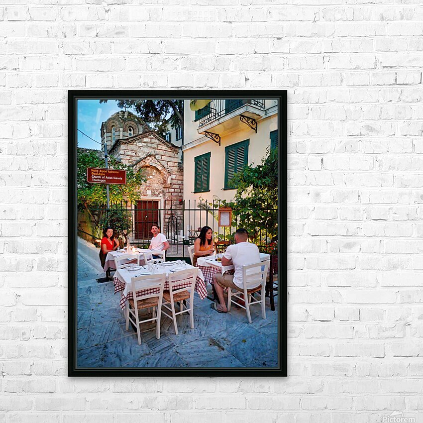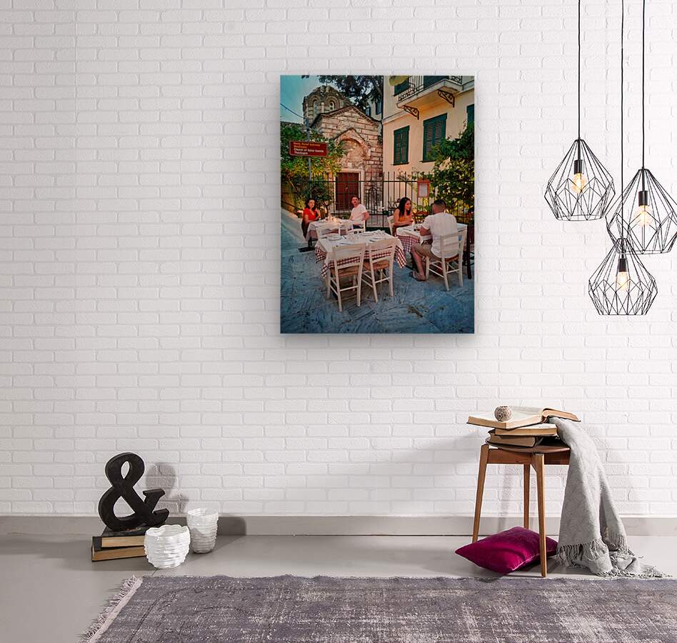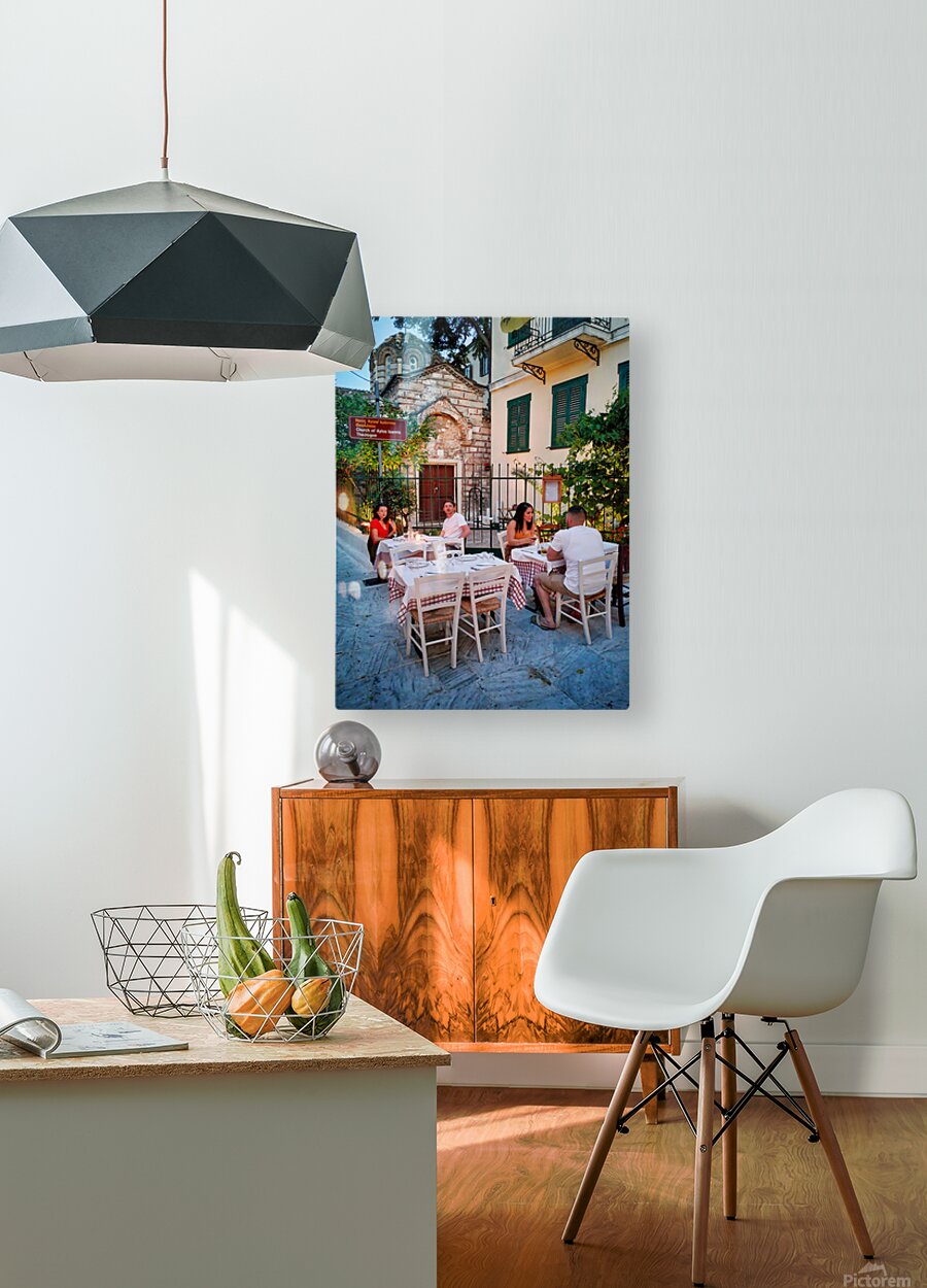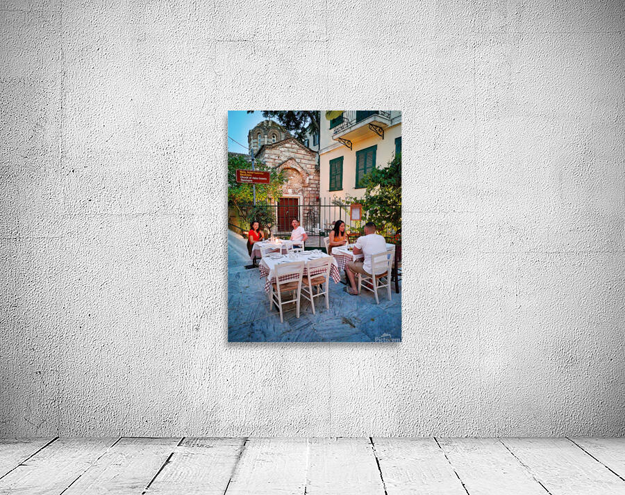 People sit at tables enjoying dinner near a church in a city. The scene shows a relaxed atmosphere with drinks and food.