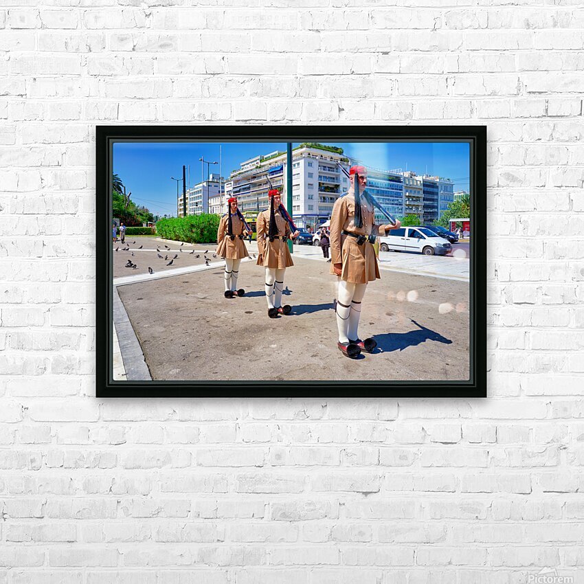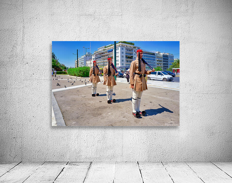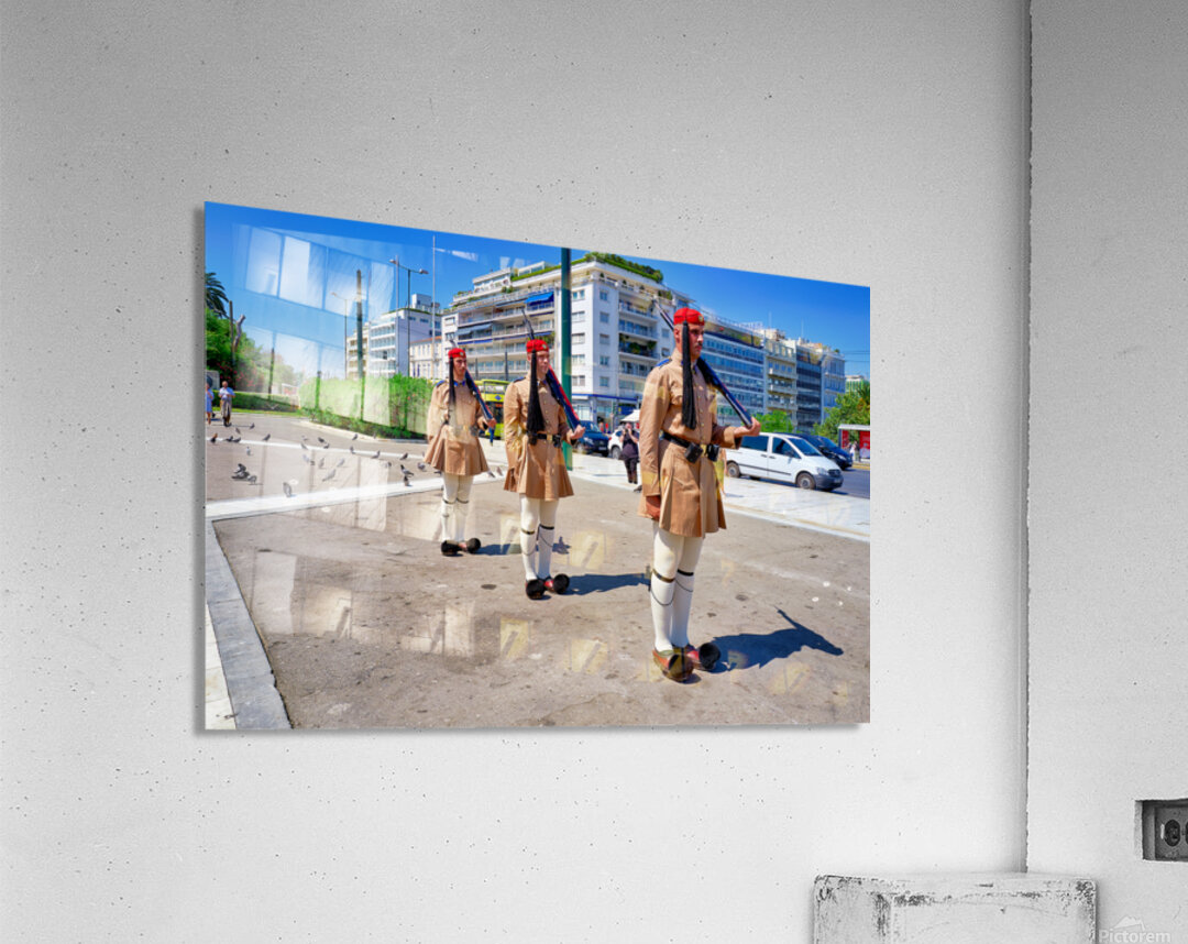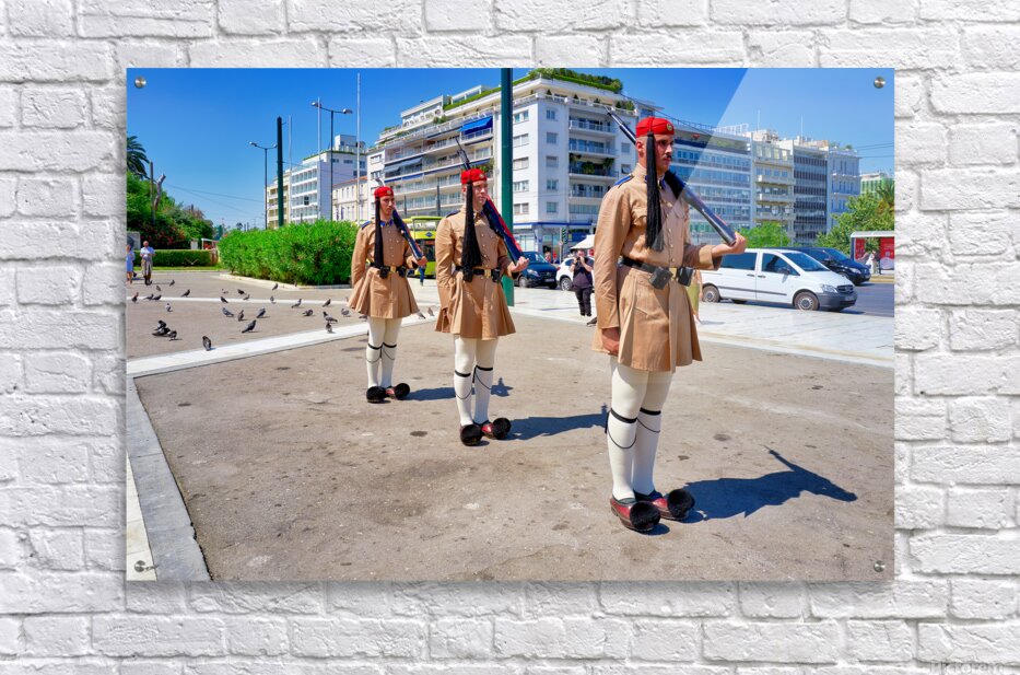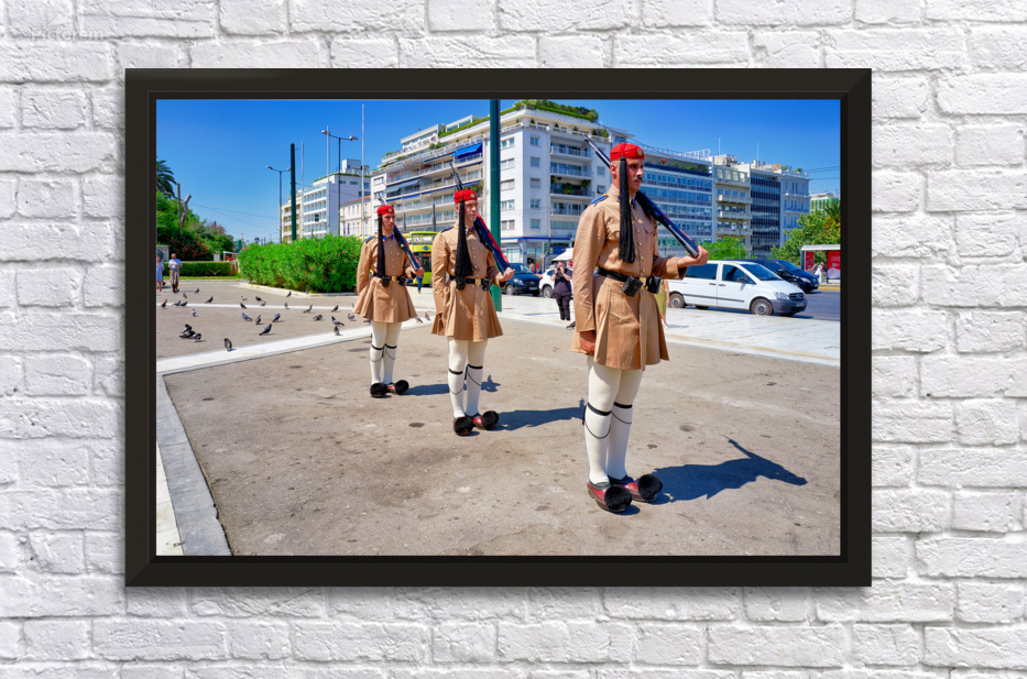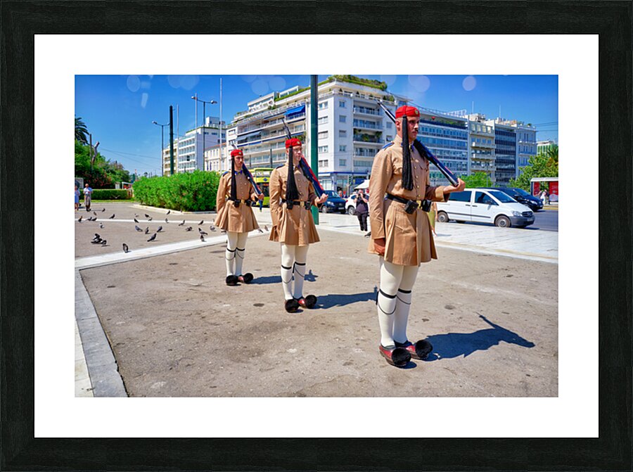 "Changing of the guard ceremony in Syntagma Square in Athens" in a framed print.