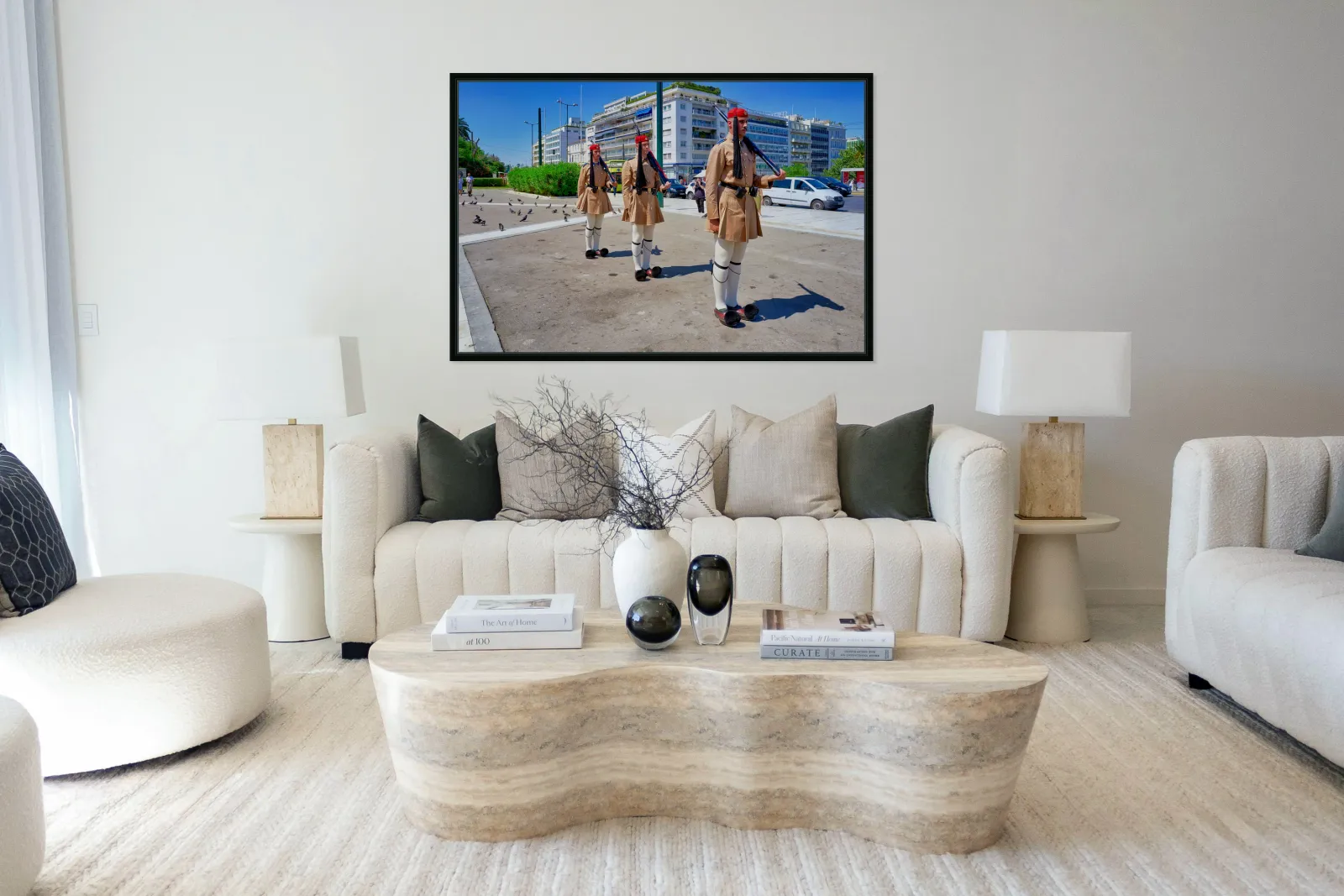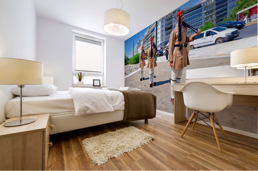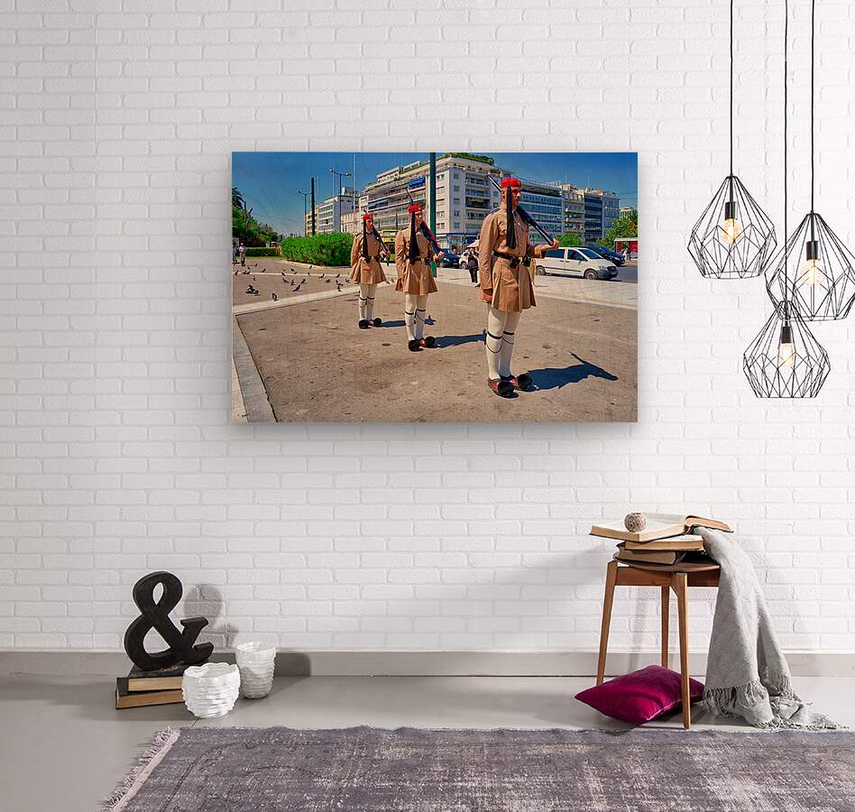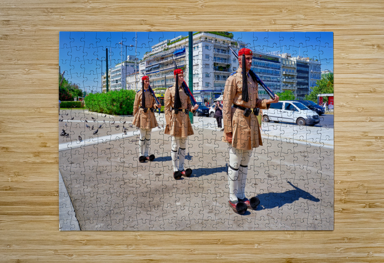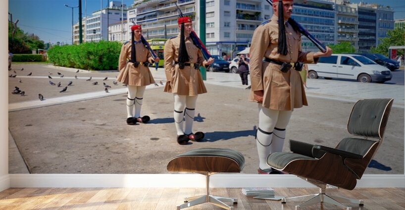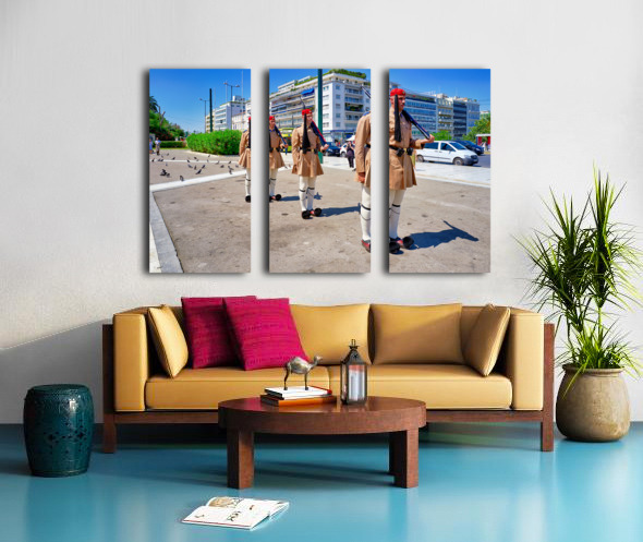 "Changing of the guard ceremony in Syntagma Square in Athens" in a framed print.