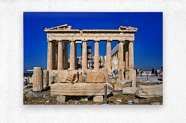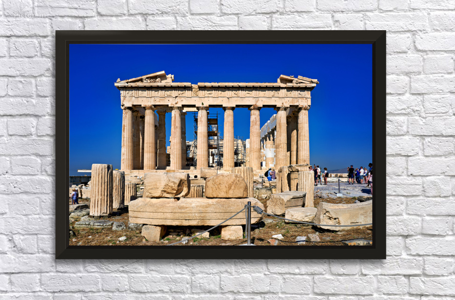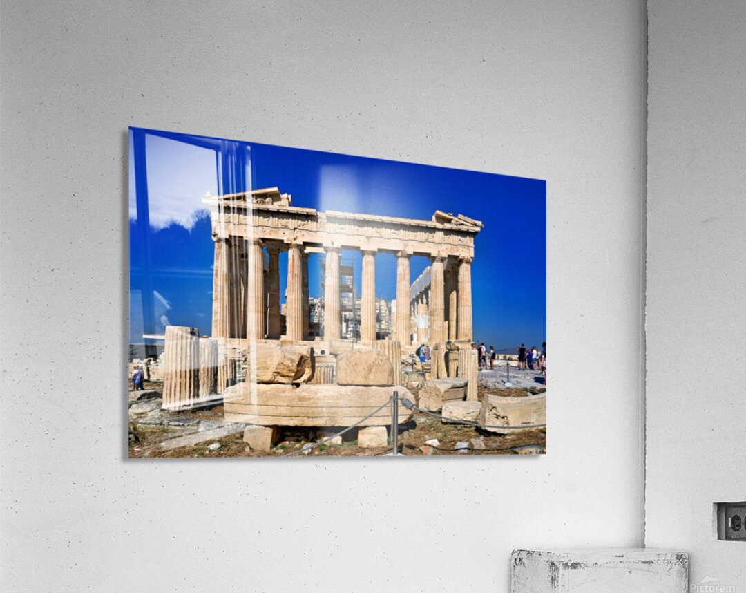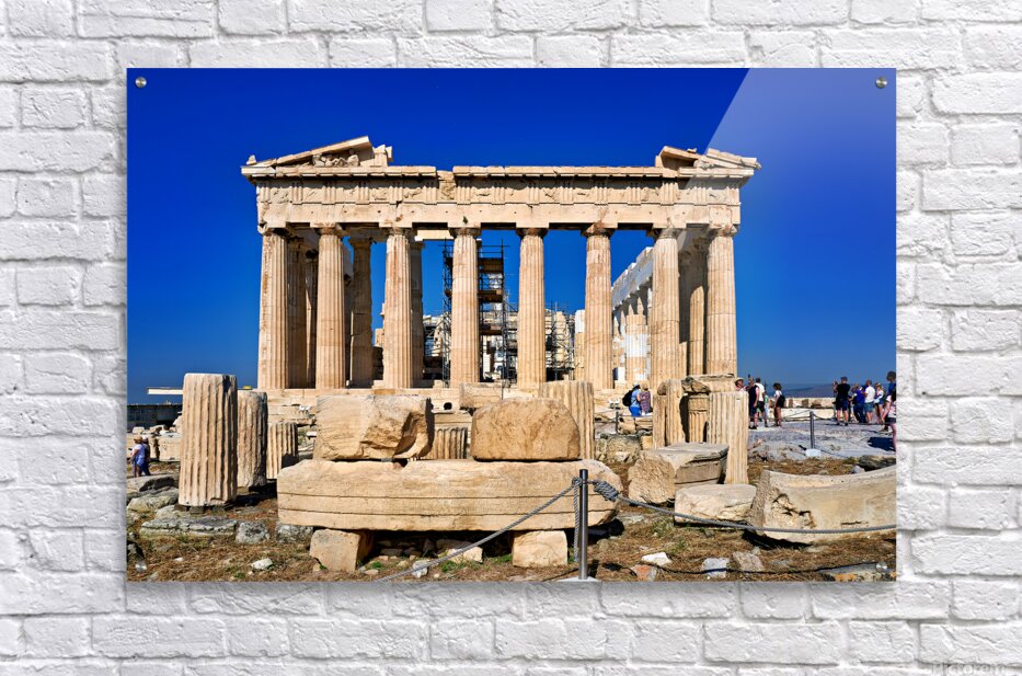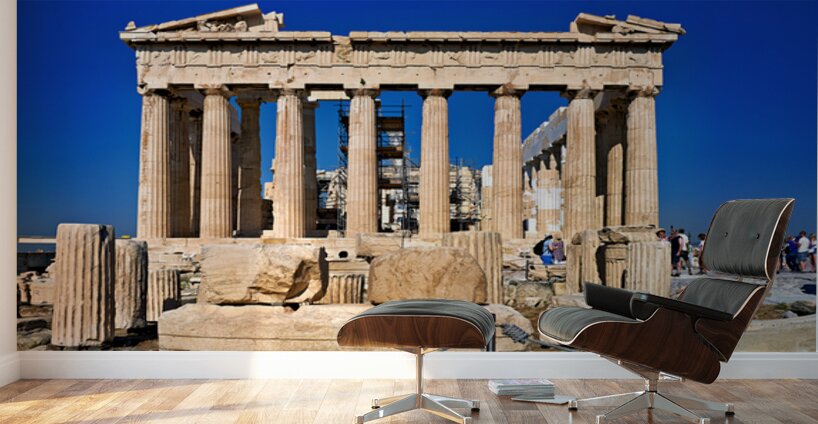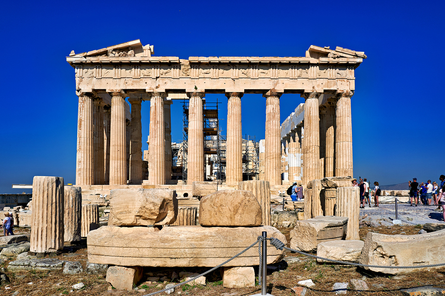 Tourists walk around the Parthenon a historic site while restoration work takes place on the Acropolis in Athens during a clear day.