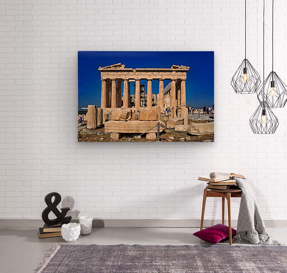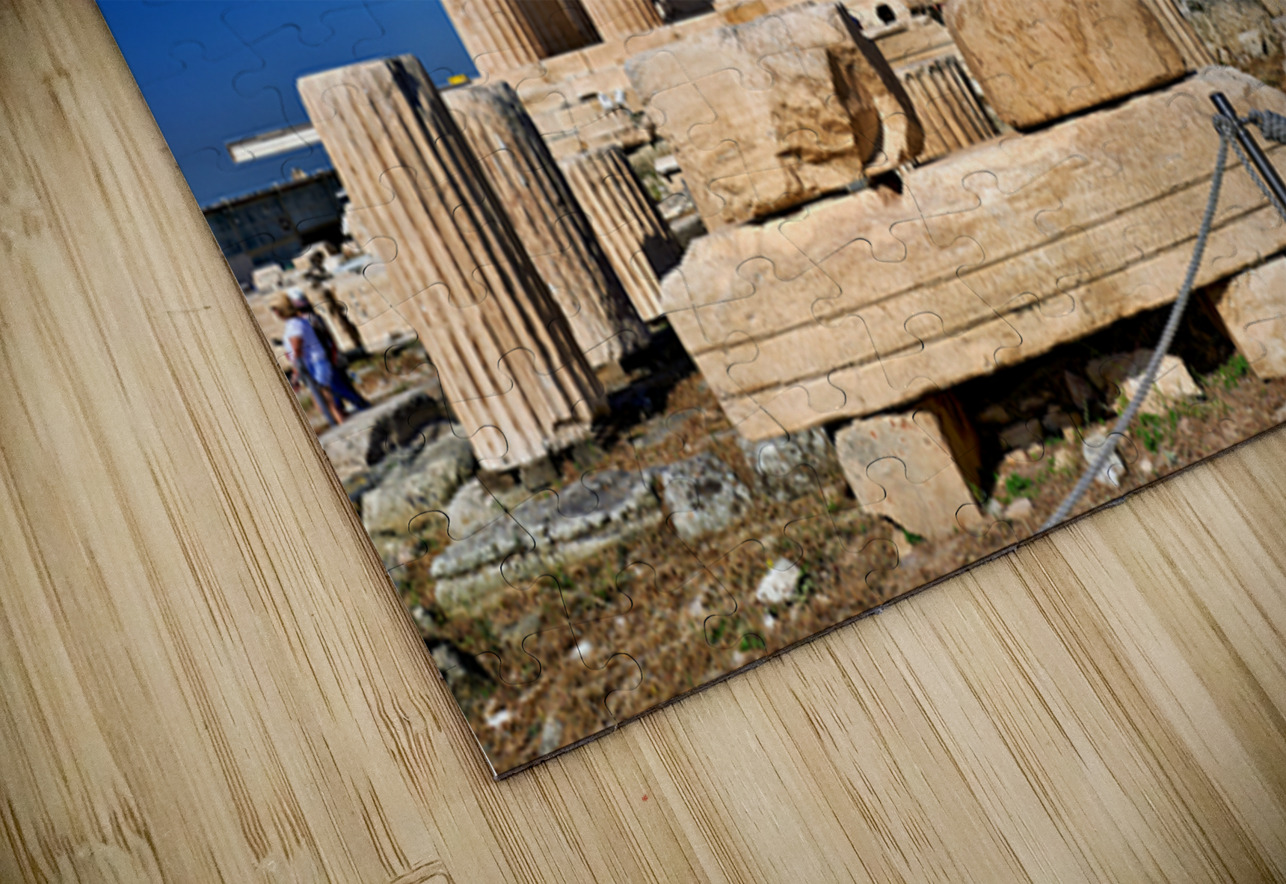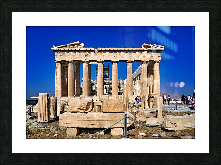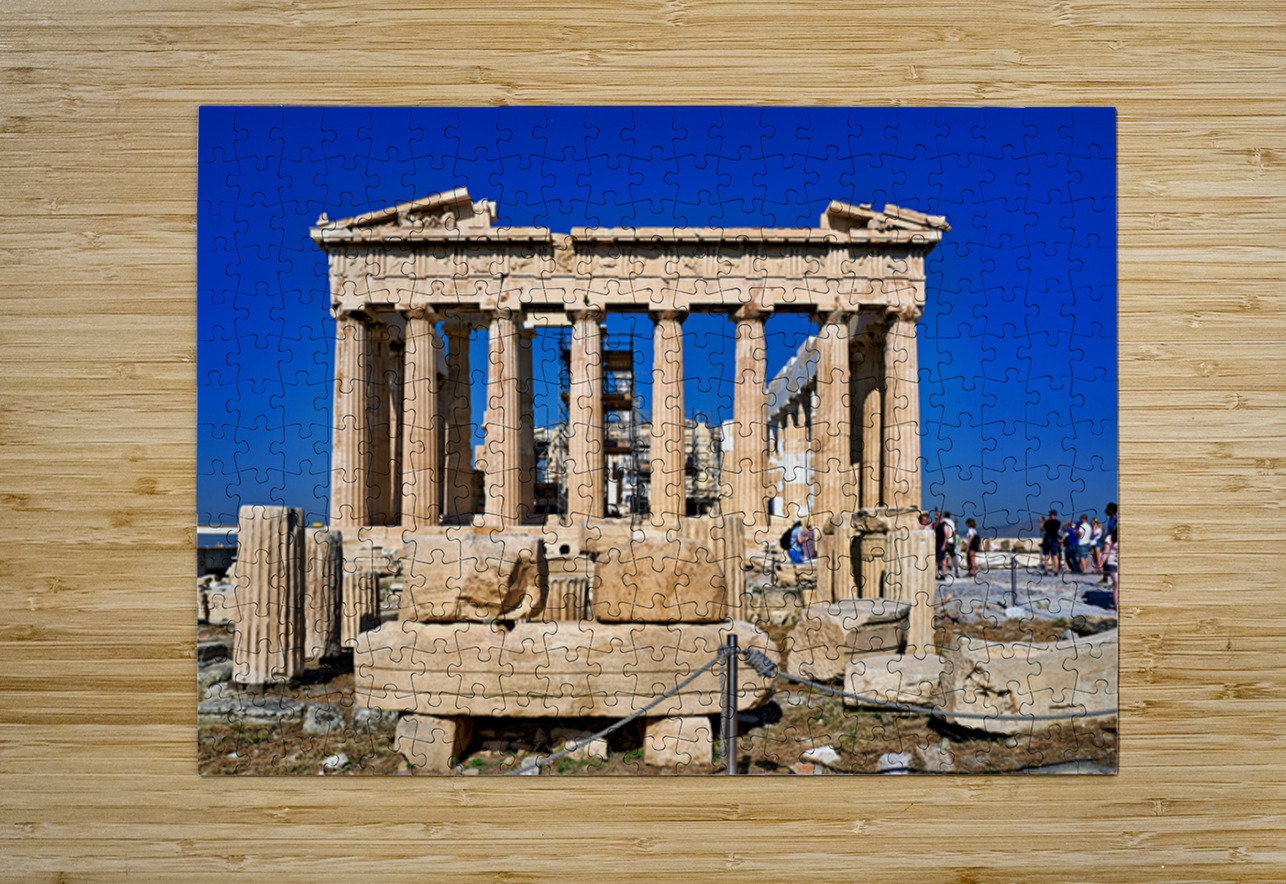 Tourists walk around the Parthenon a historic site while restoration work takes place on the Acropolis in Athens during a clear day.