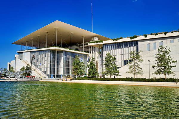 The Stavros Niarchos Foundation Cultural Center and Opera House in Athens. Visitors walk near the water without any clouds in the sky.