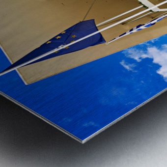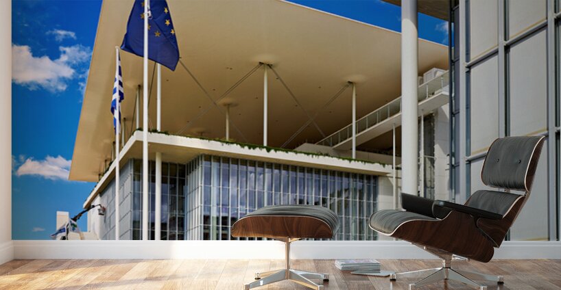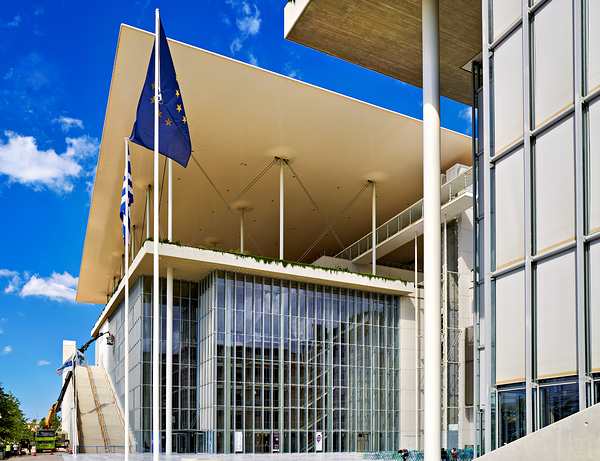 Greece features the Stavros Niarchos Foundation Cultural Center. Many flags stand outside under a clear blue sky. Visitors approach the building.