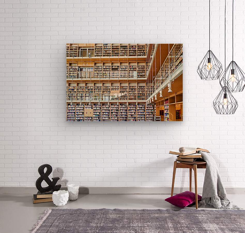 People explore the National Library at the Stavros Niarchos Foundation Cultural Center in Athens Greece surrounded by shelves of books.