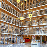 People explore the National Library in Athens Greece. The tall shelves hold many books. Visitors read and study in this modern space.