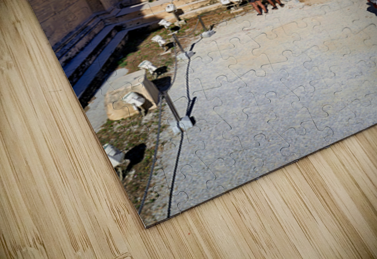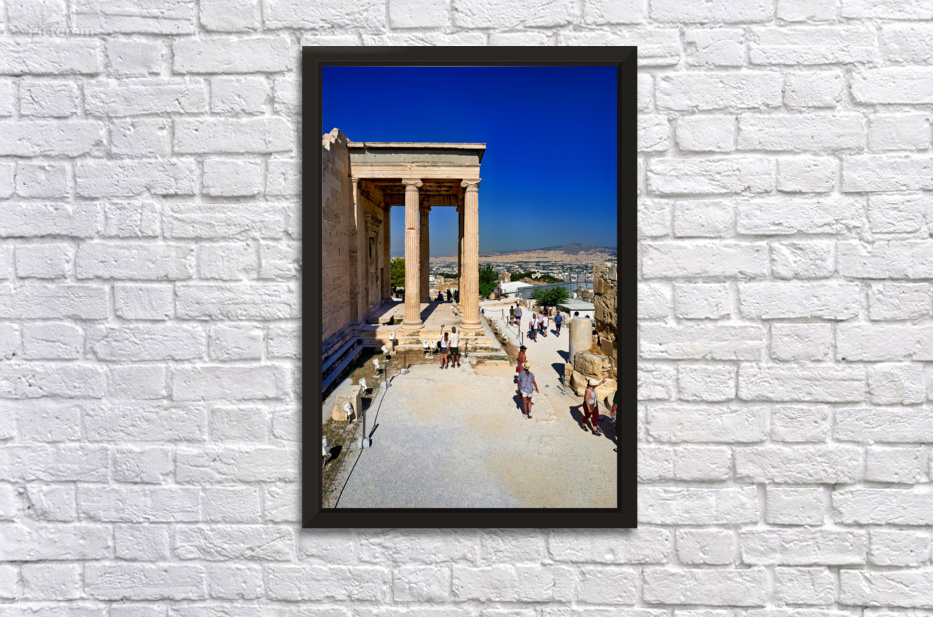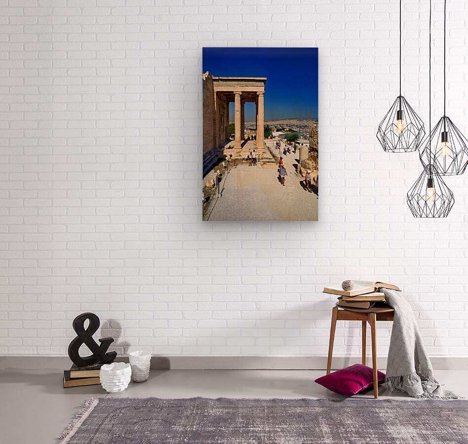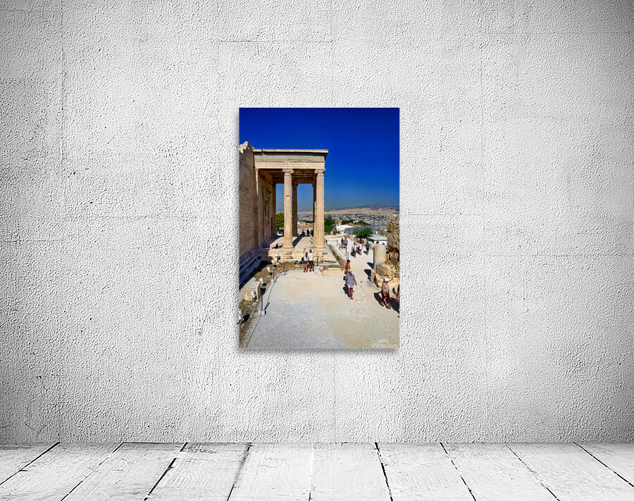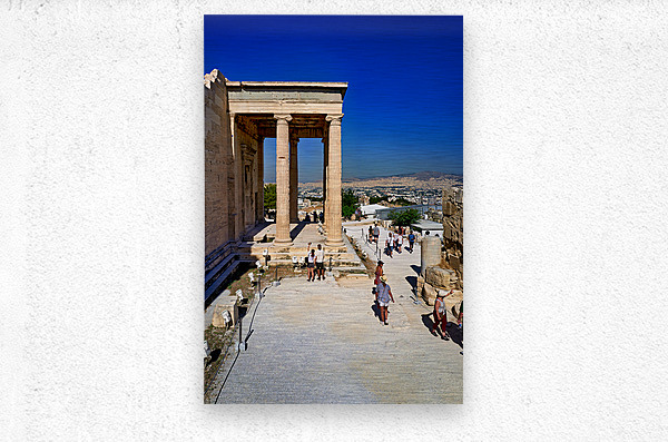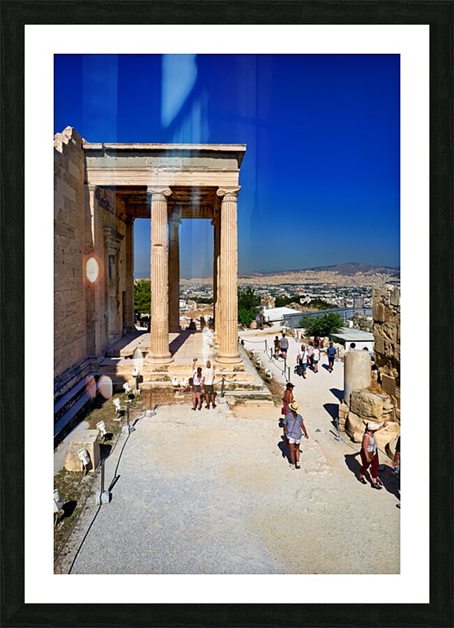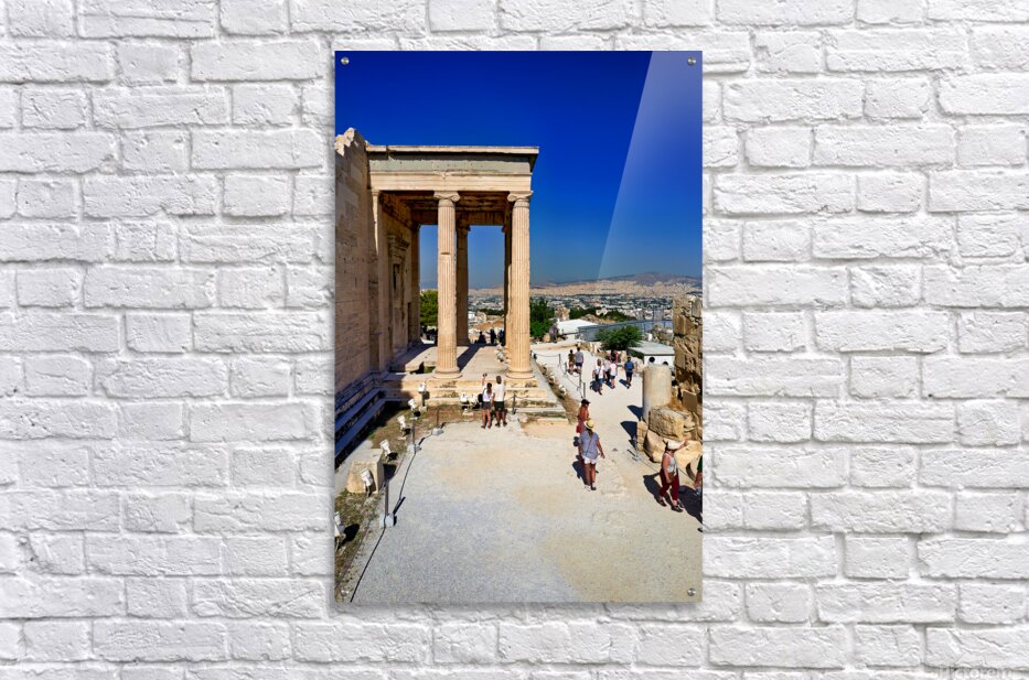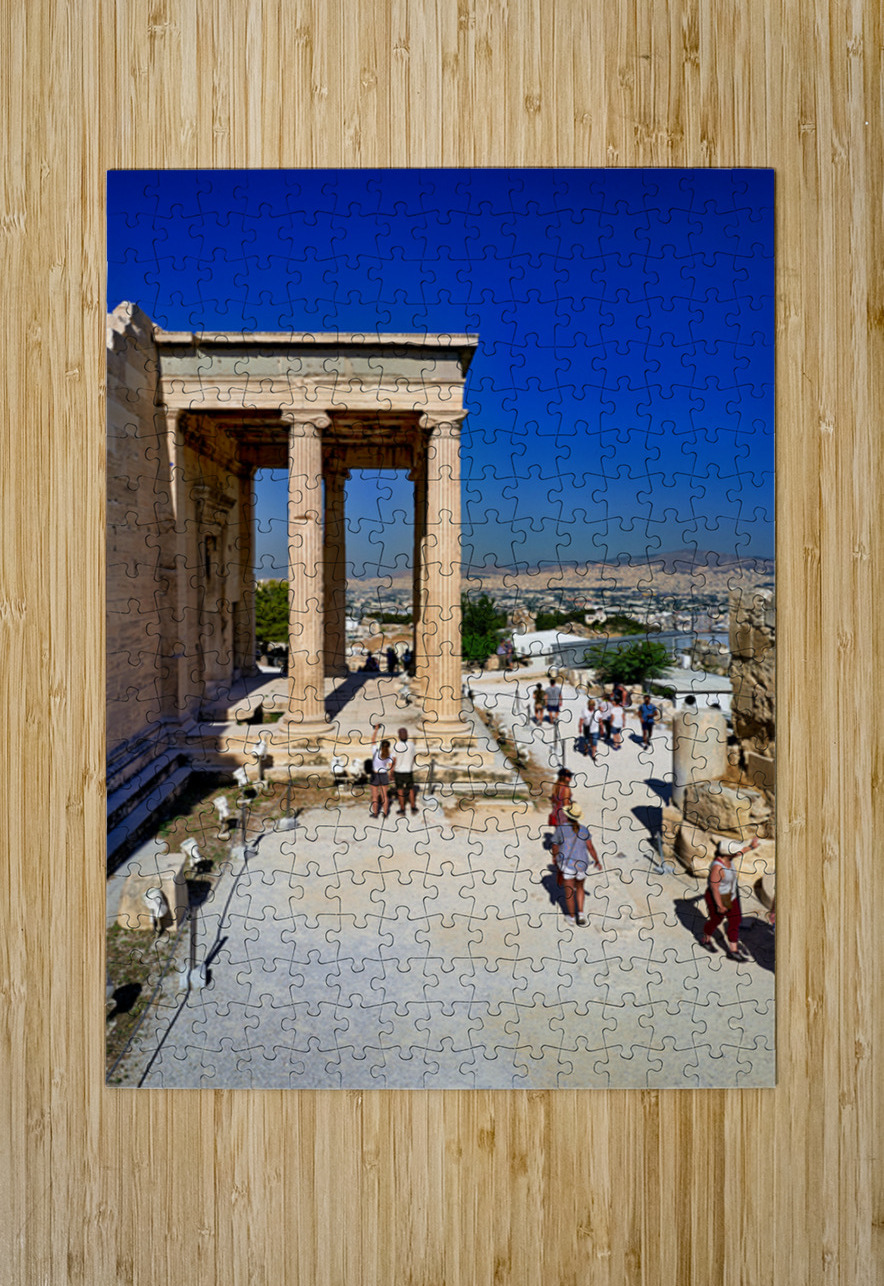 Visitors walk near the Erechtheion temple at the Acropolis in Athens. Ancient columns stand tall under a clear blue sky as people explore.