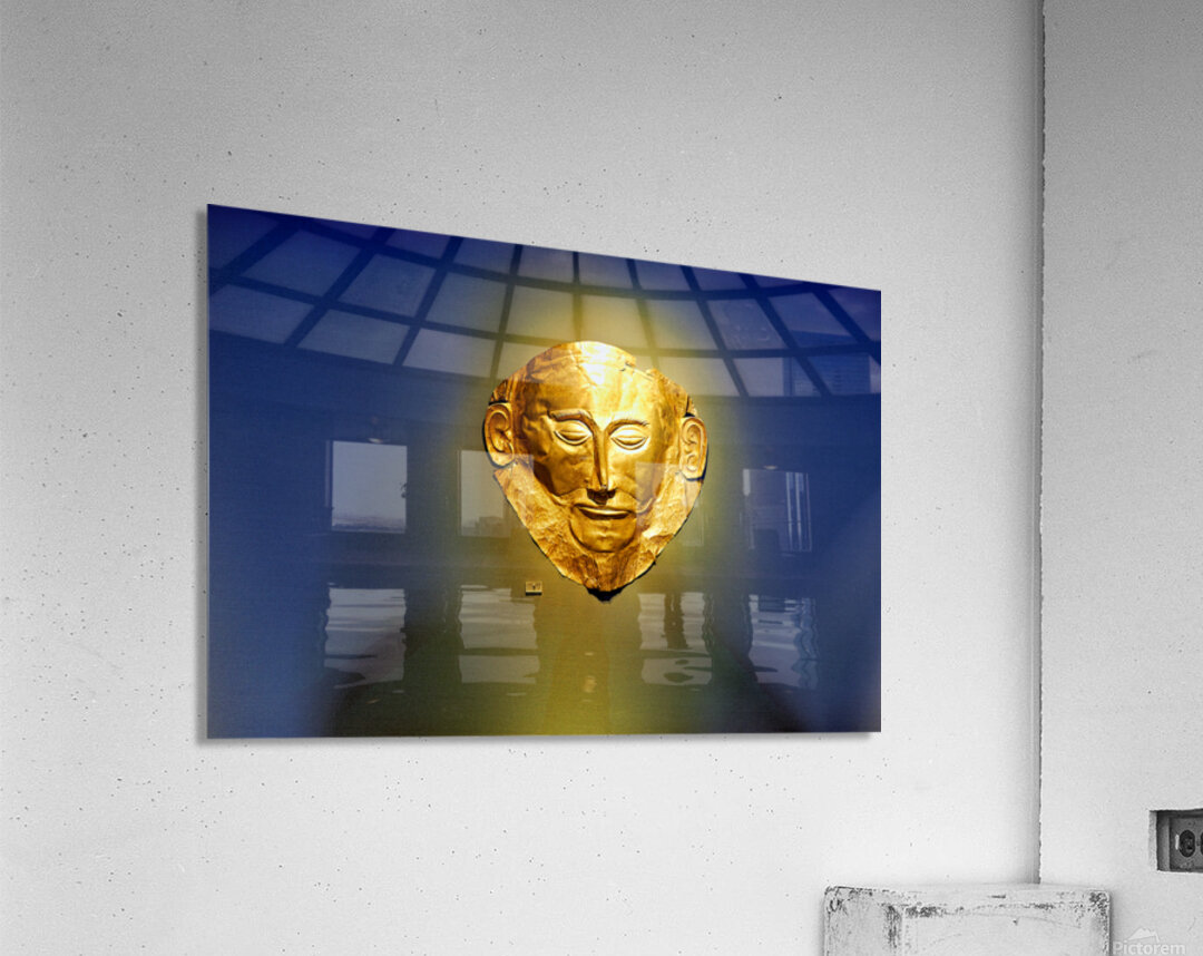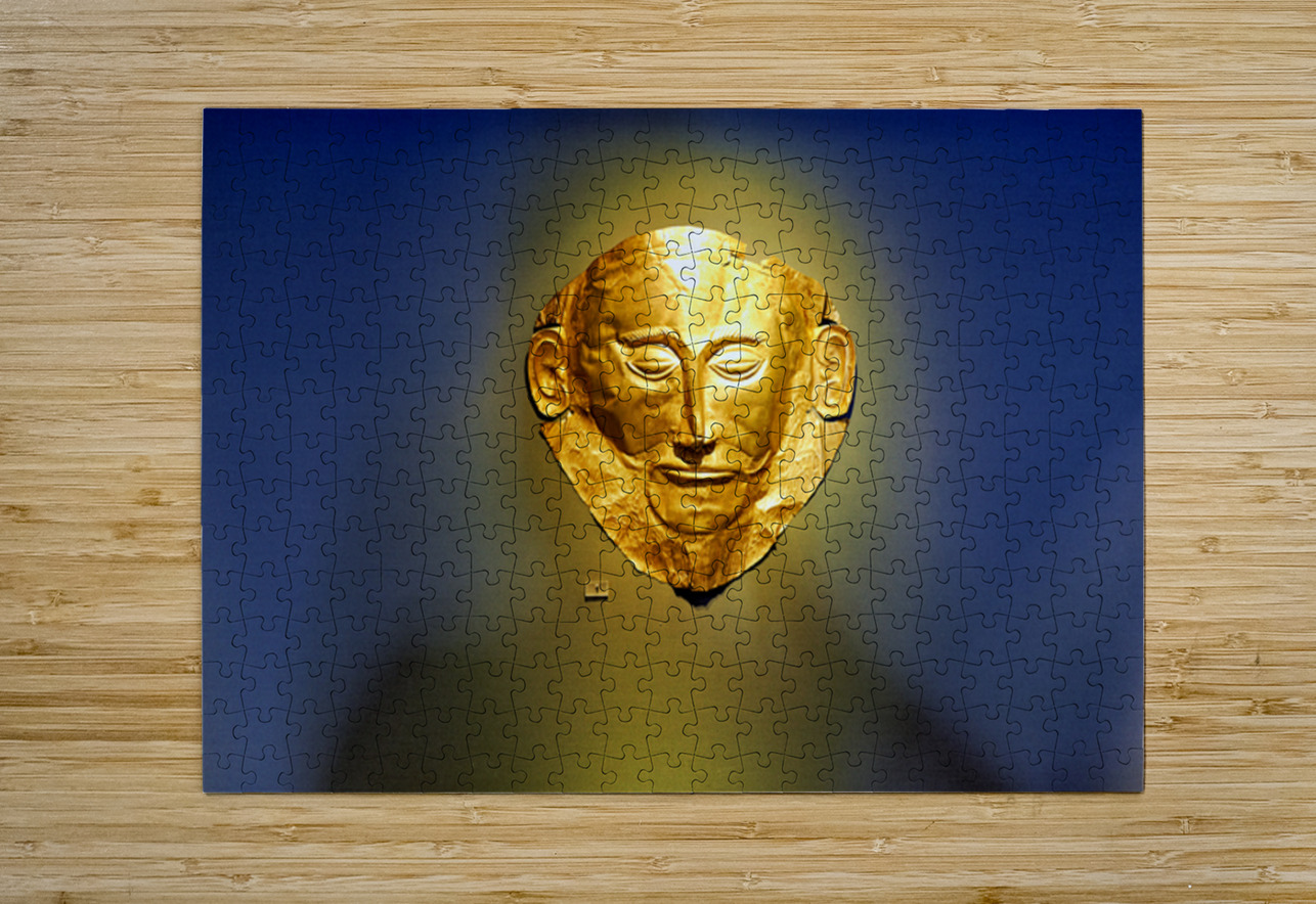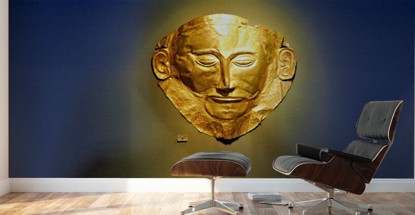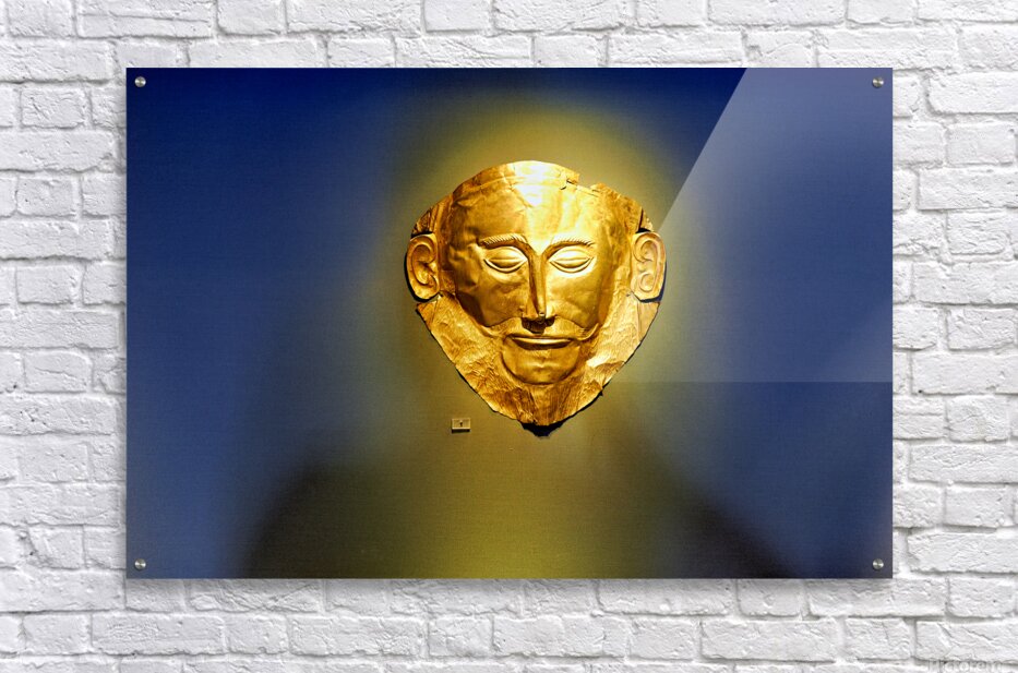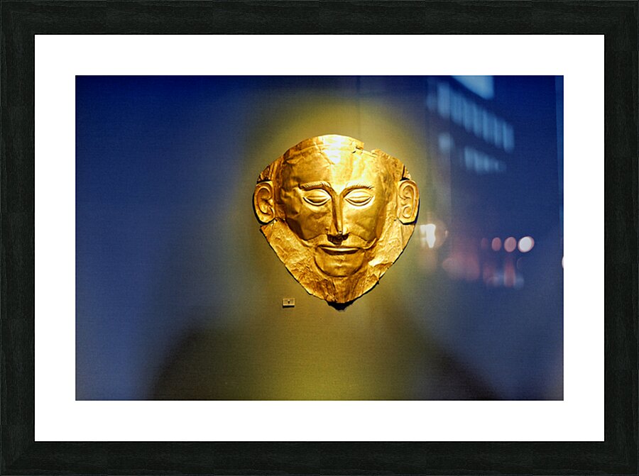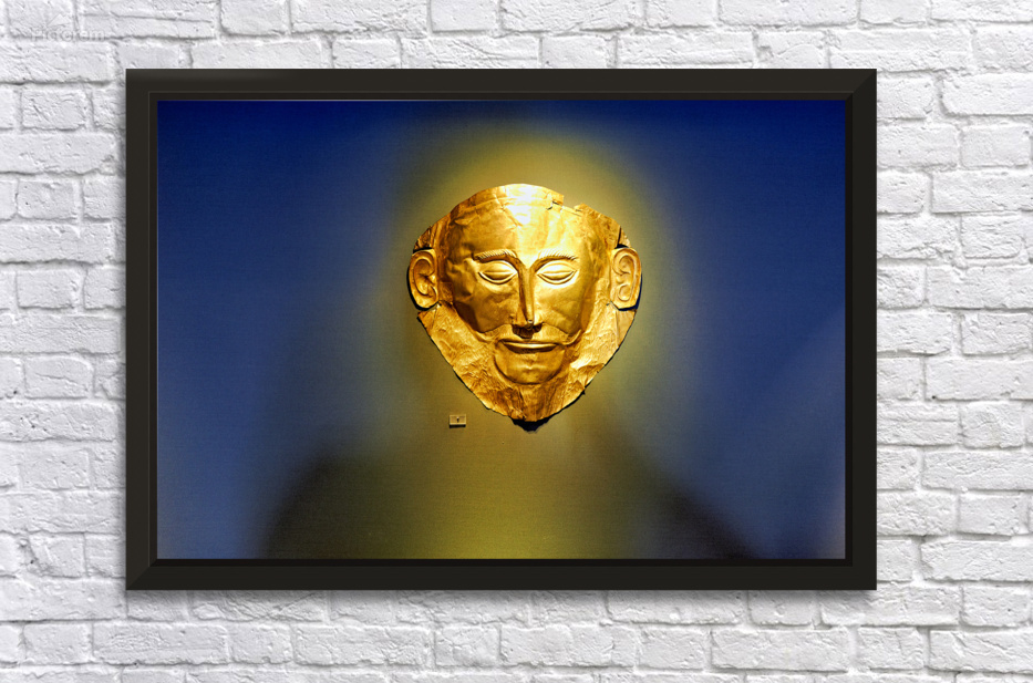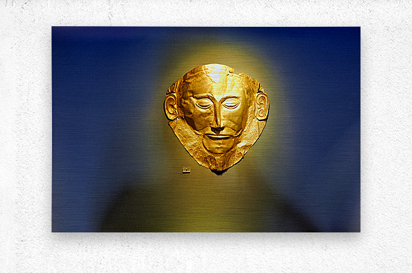 The Agamemnon golden mask is on display at the National Archaeological Museum in Athens Greece. Visitors admire this ancient artifact.