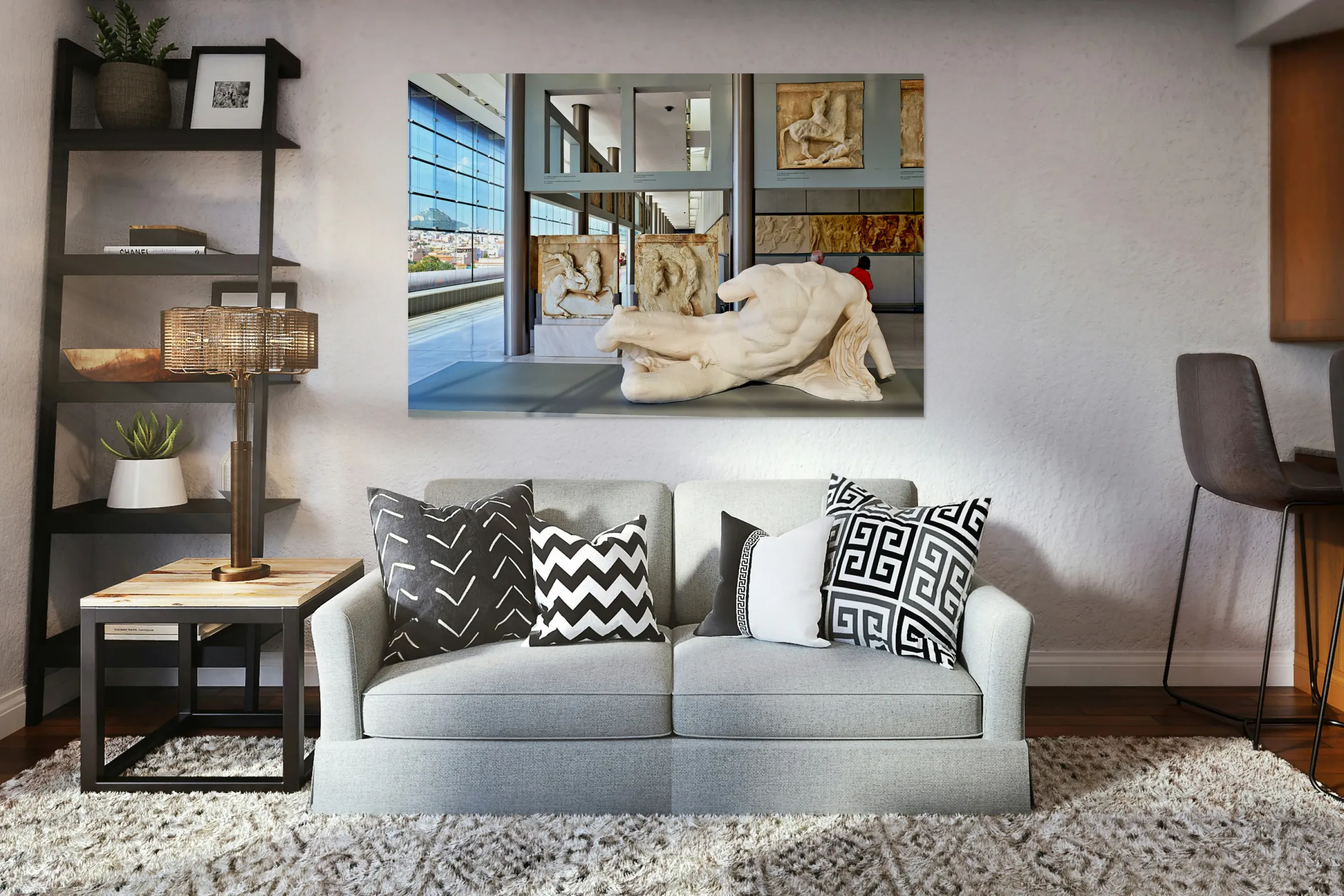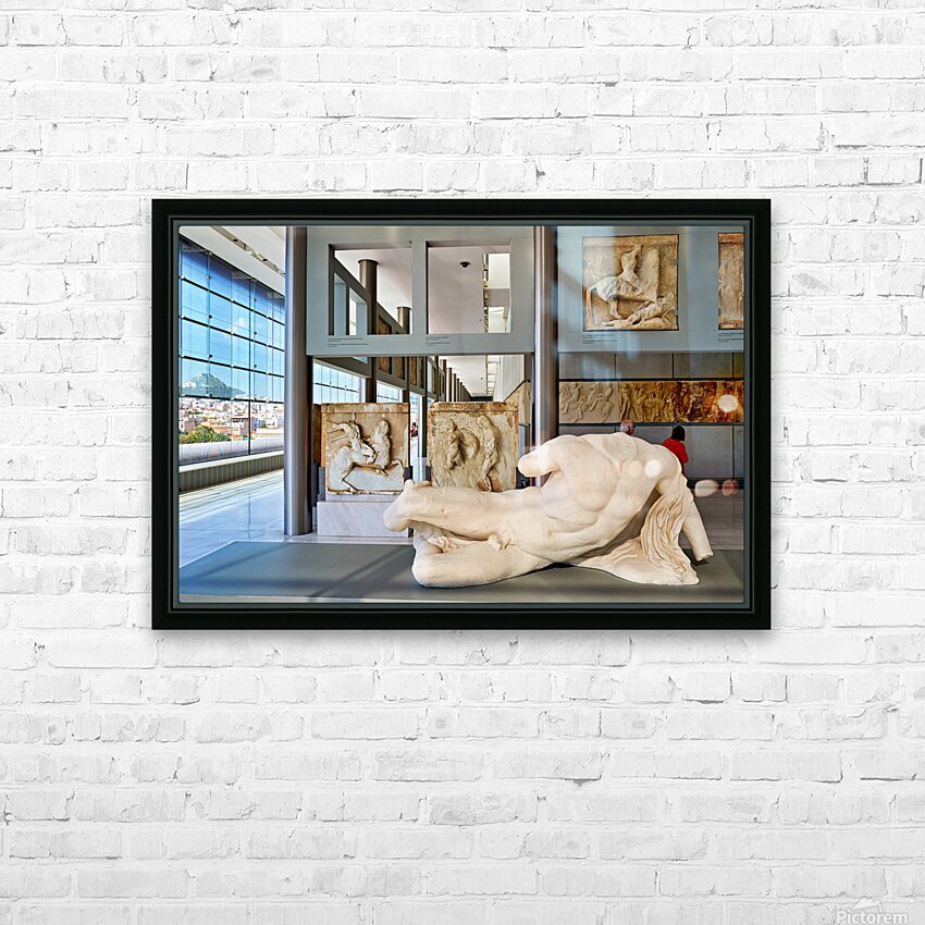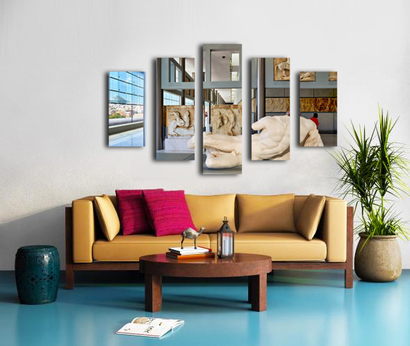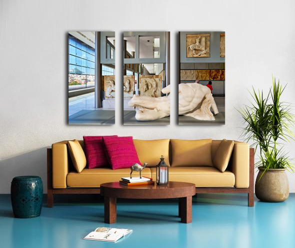 Visitors explore sculptures at Acropolis Museum in Athens Greece Frame print