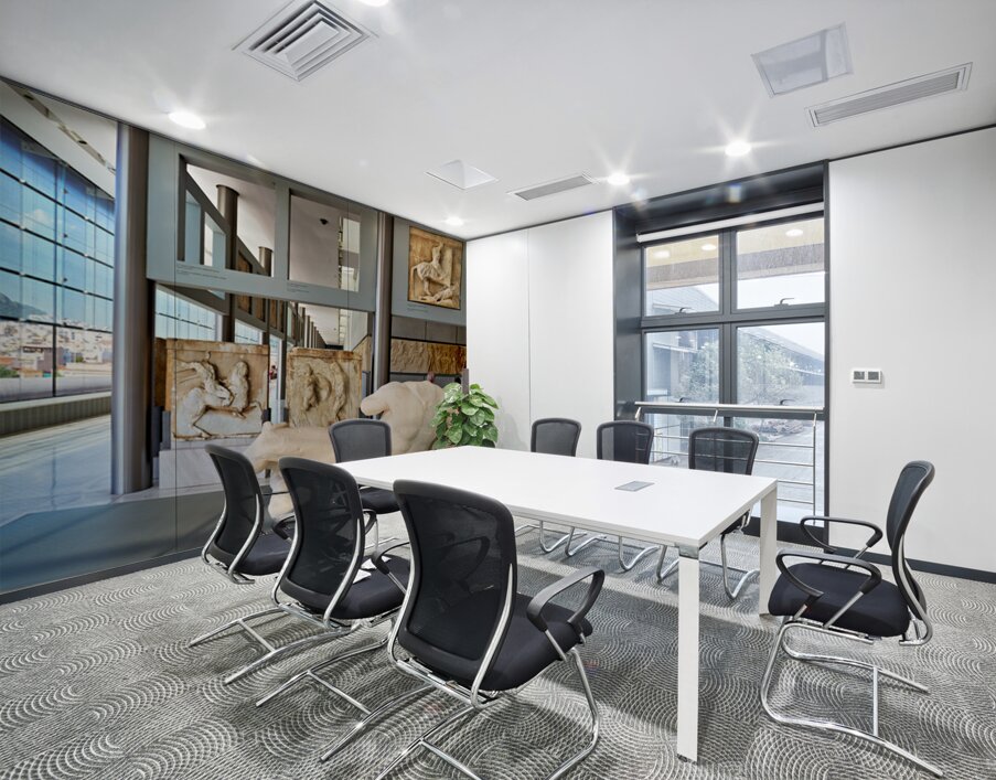 Visitors stand near ancient sculptures at the Acropolis Museum in Athens. The museum displays significant historical artifacts in bright light.