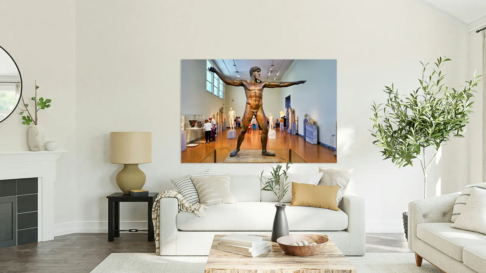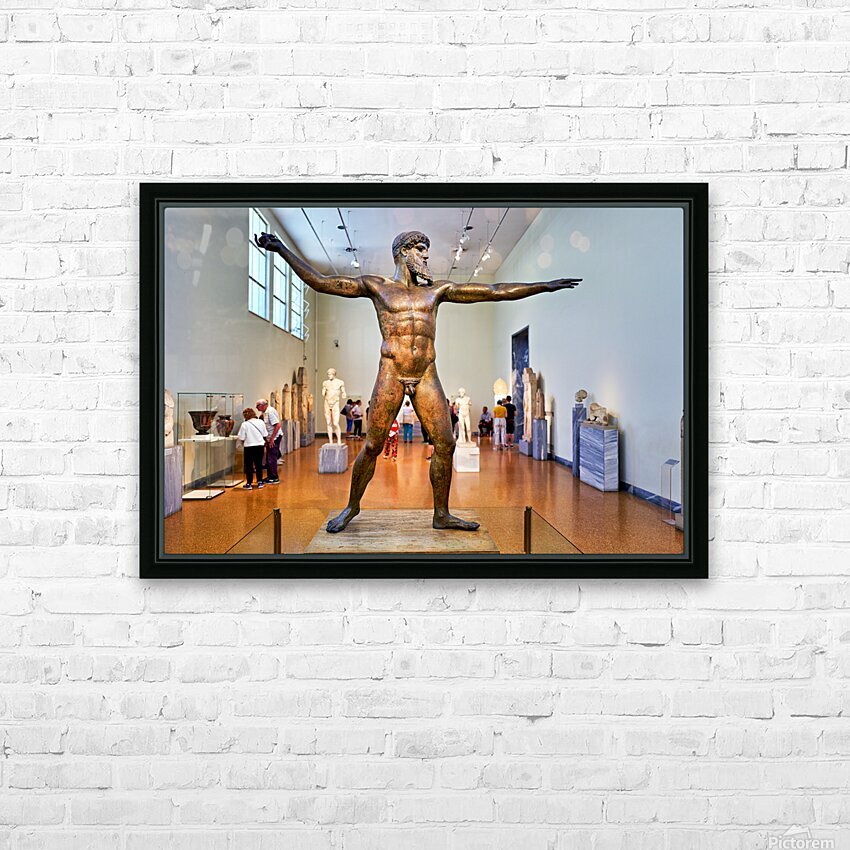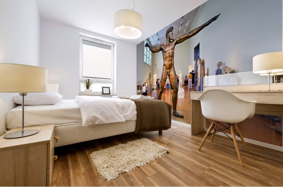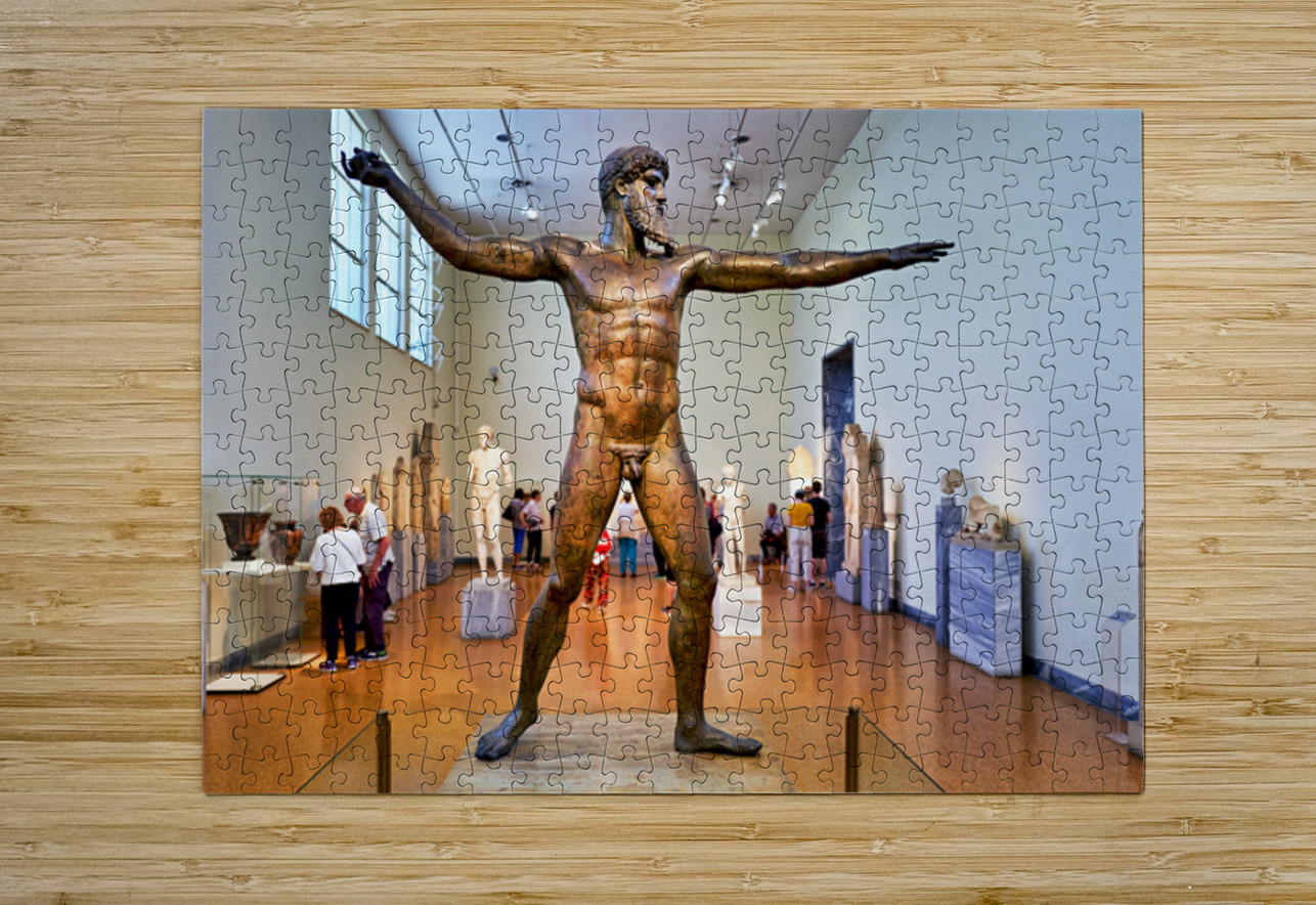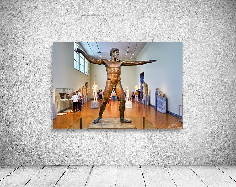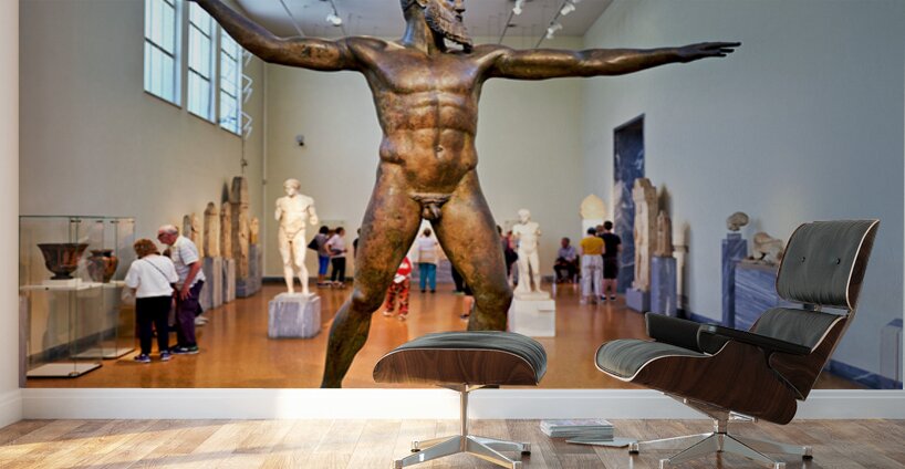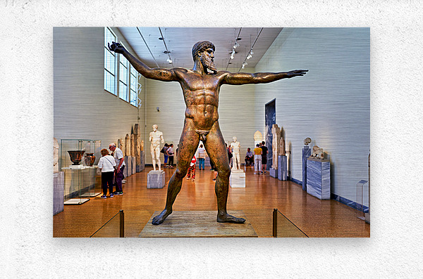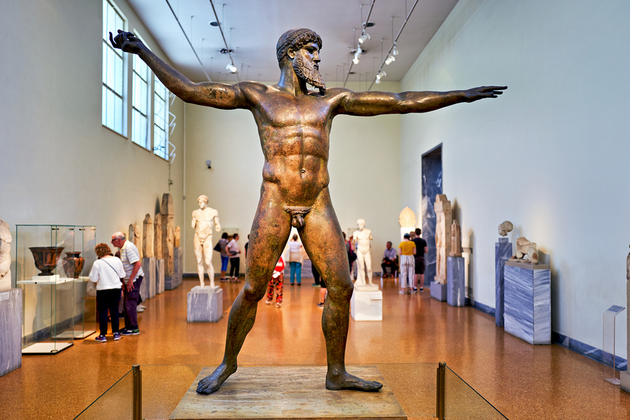 Visitors explore the National Archaeological Museum in Athens observing the bronze statue of a muscular figure with arms outstretched.