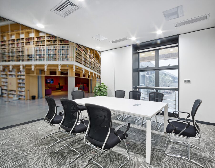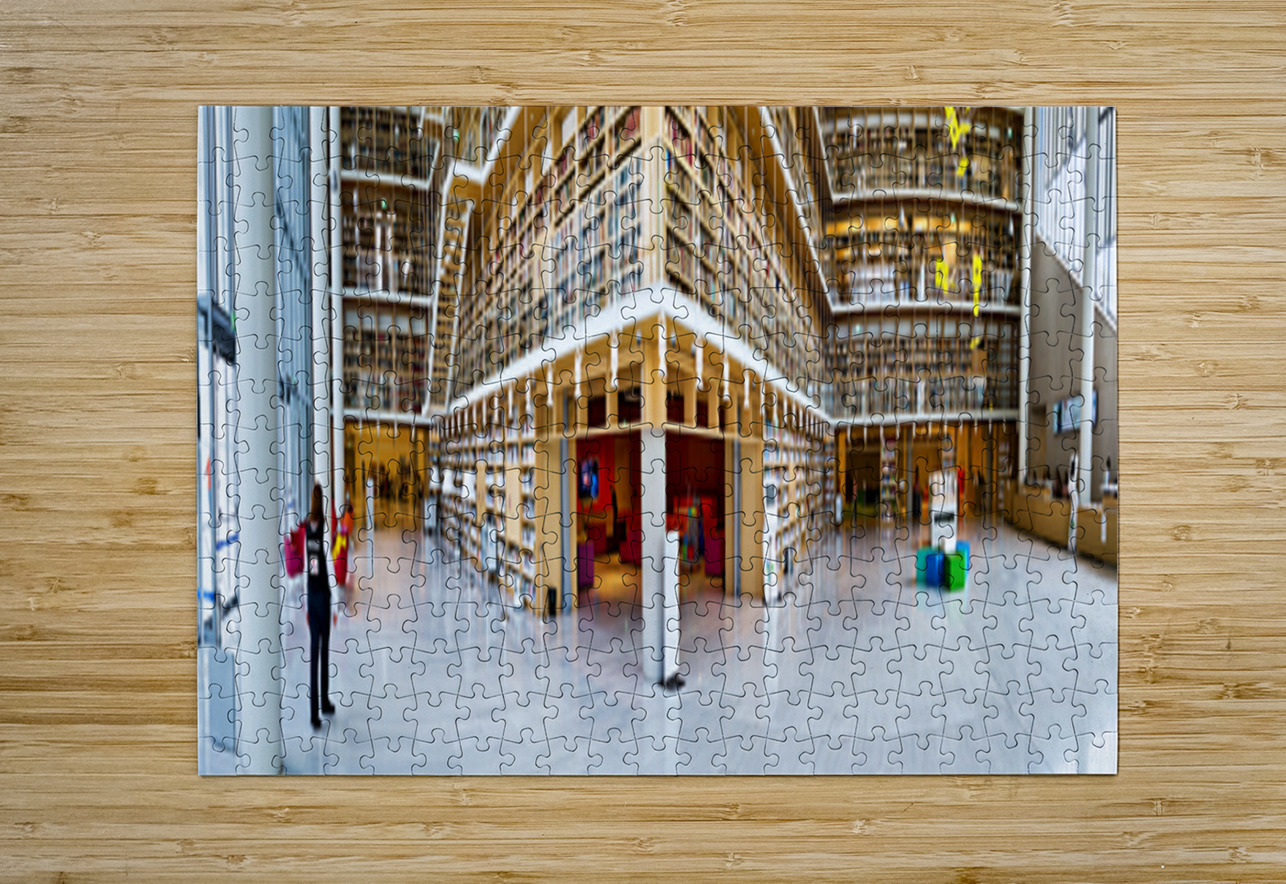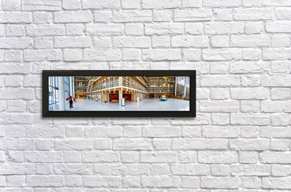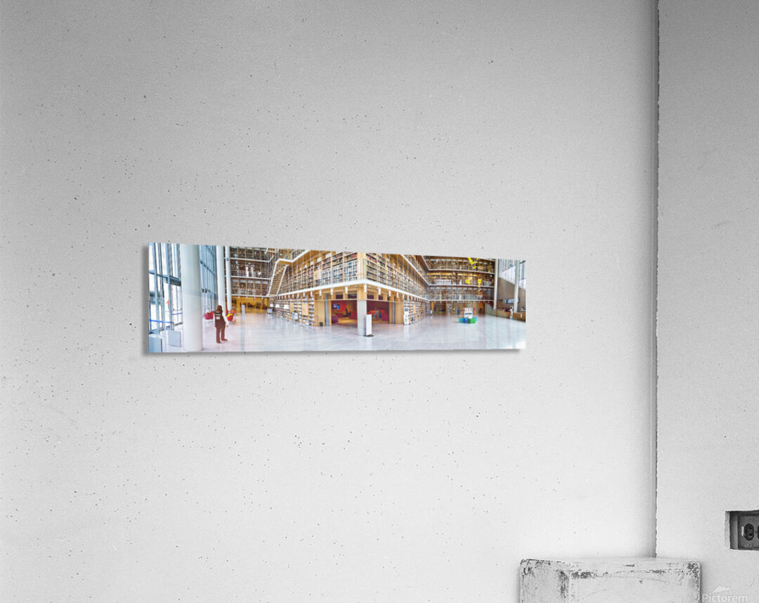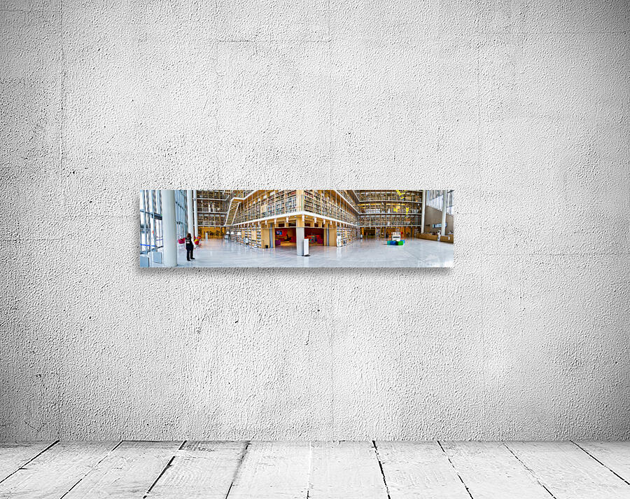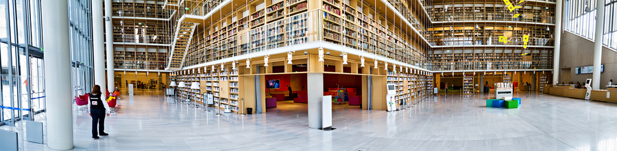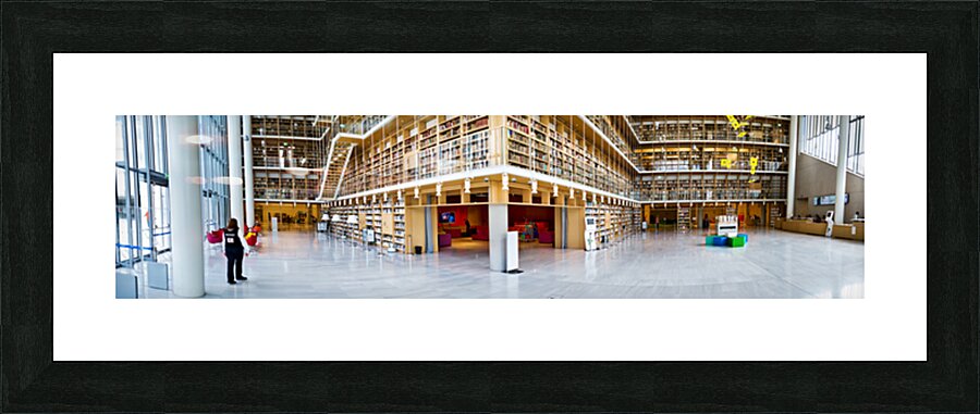People walk through the National Library located in the Stavros Niarchos Foundation Cultural Center in Athens. Bookshelves fill the space.