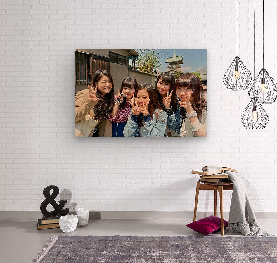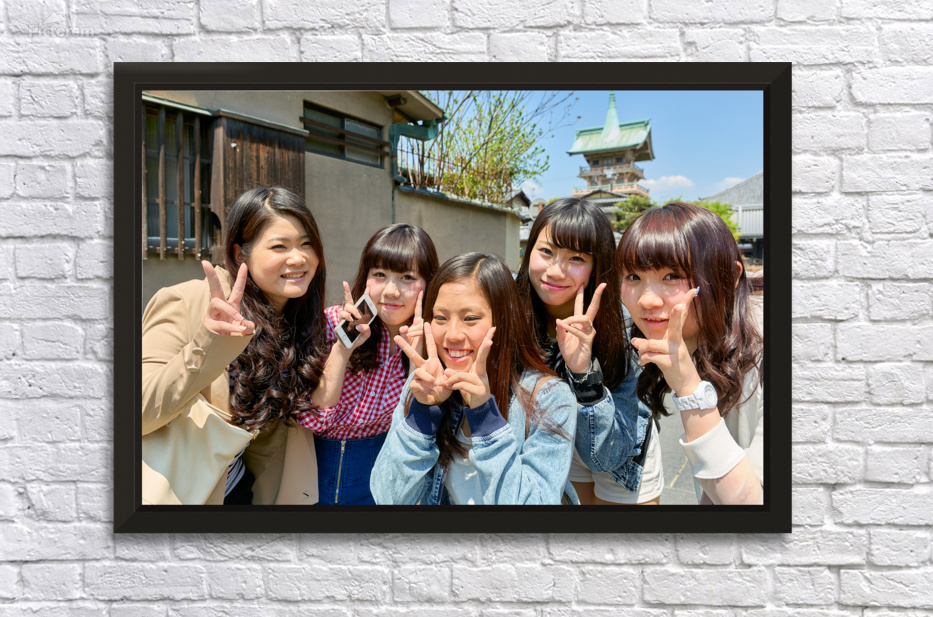 Five young girls pose with smiles and peace signs in Kyoto. They enjoy time together in a lively setting with traditional buildings in the background.