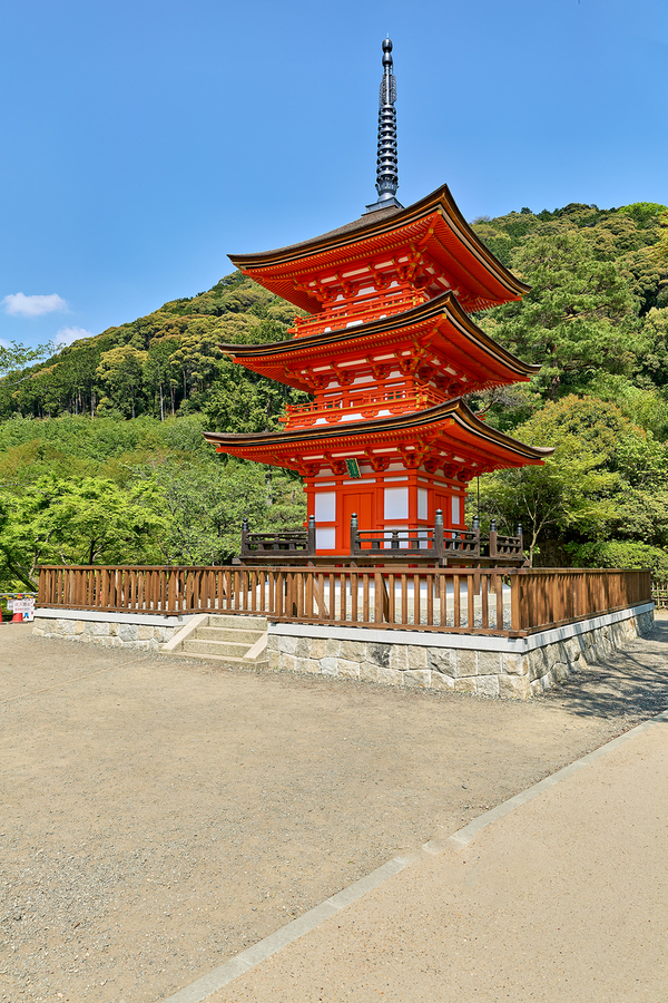 Koyasu Pagoda stands tall at Kiyomizu Dera Temple in Kyoto Japan. Visitors enjoy the view on a clear day surrounded by trees.
