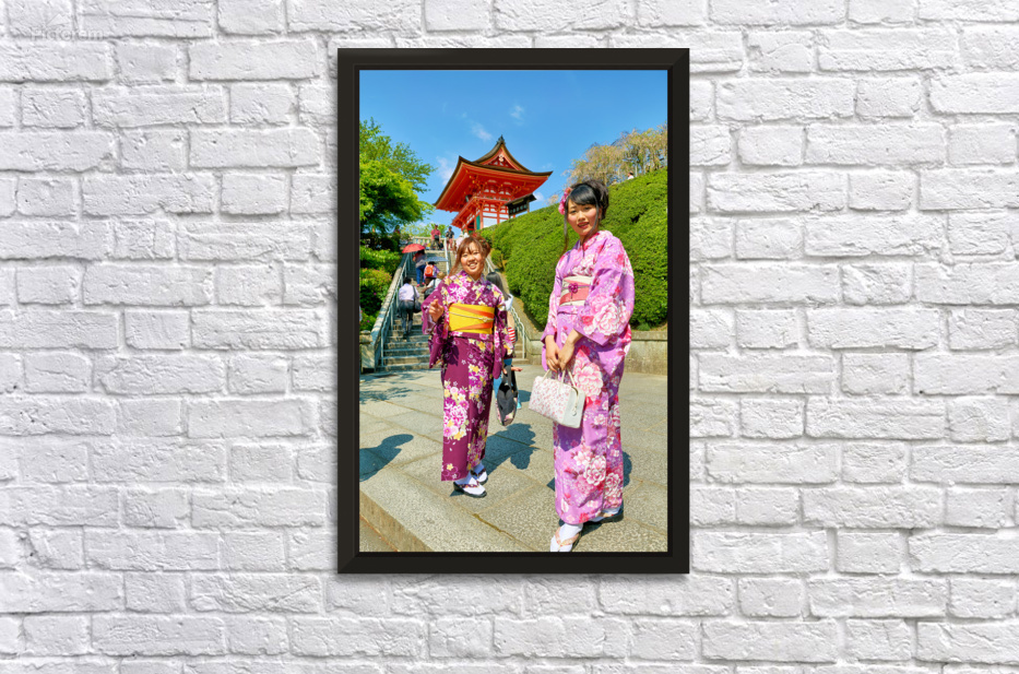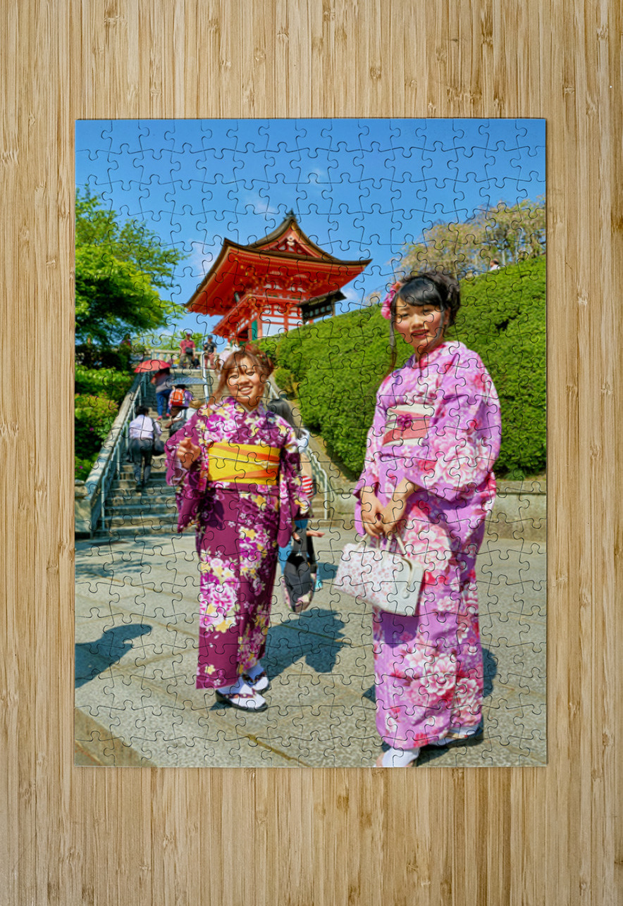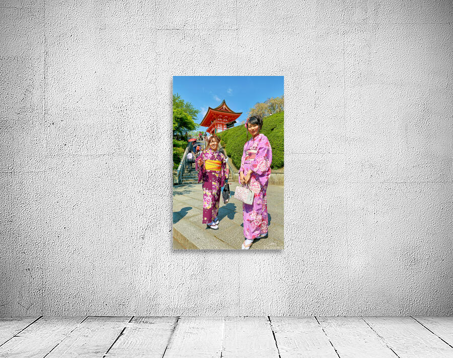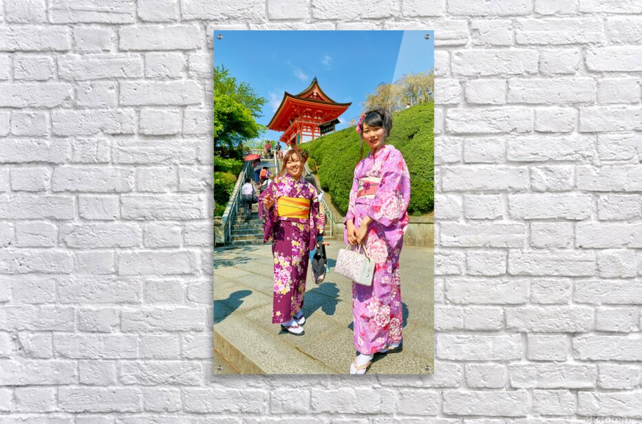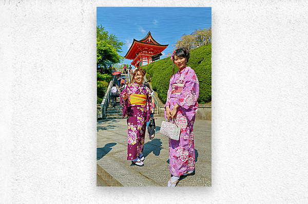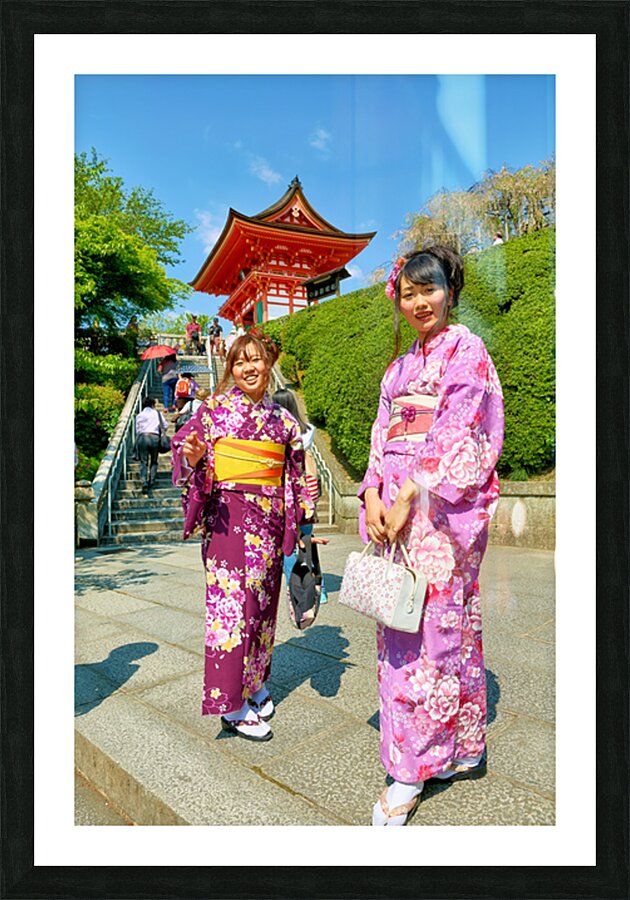 Two young women in colorful kimono stand near Koyasu Pagoda at Kiyomizu Dera Temple. The sun shines brightly on this clear day in Kyoto.